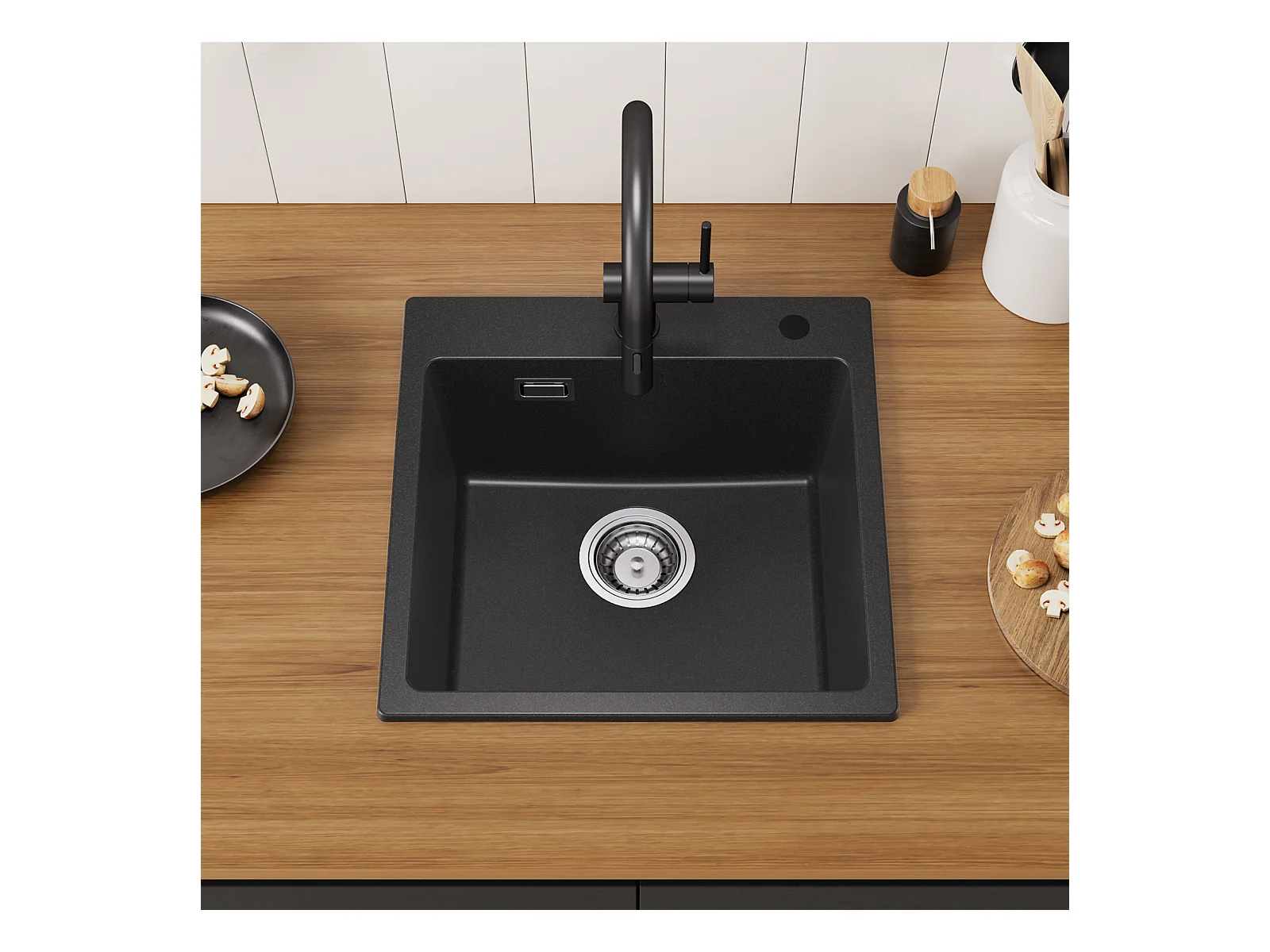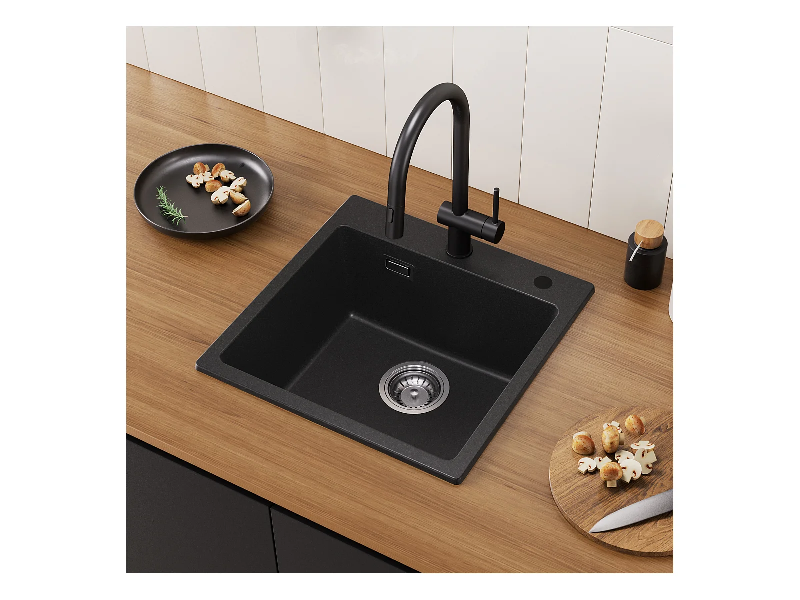 Cecipa max zwarte quartz spoelbak 45x45 cm 1 bak spoelbak in kwarts en hars keukenspoelbak + zwarte veer keukenmengkraan met uittrekbare spray