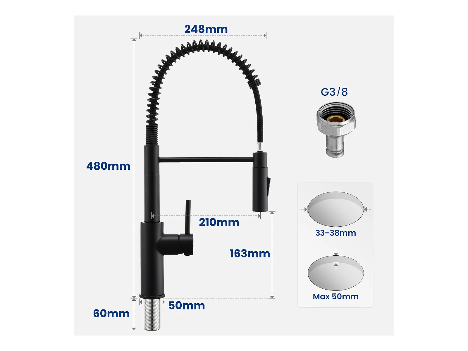 Cecipa max 1 spoelbak met afdruiprek, 78x45cm Spoelbak van kwarts en zwarte hars + Spring keukenmengkraan met 3 wateruitlaatmodi, Zwart