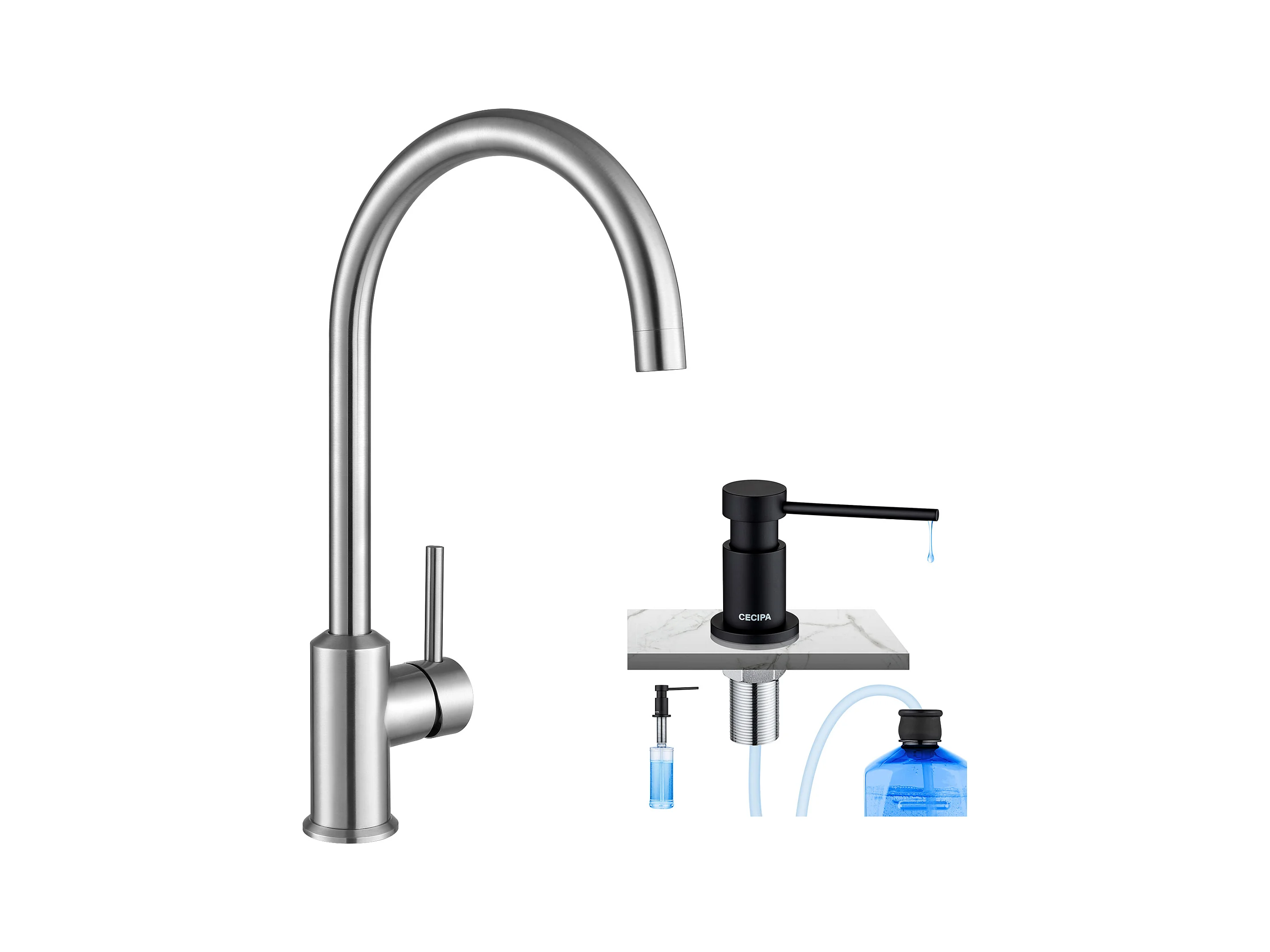 Cecipa max ééngreepskeukenmengkraan, wastafelkraan van geborsteld roestvrij staal, 360° draaibare kraan + zwarte keukenzeepdispenser
