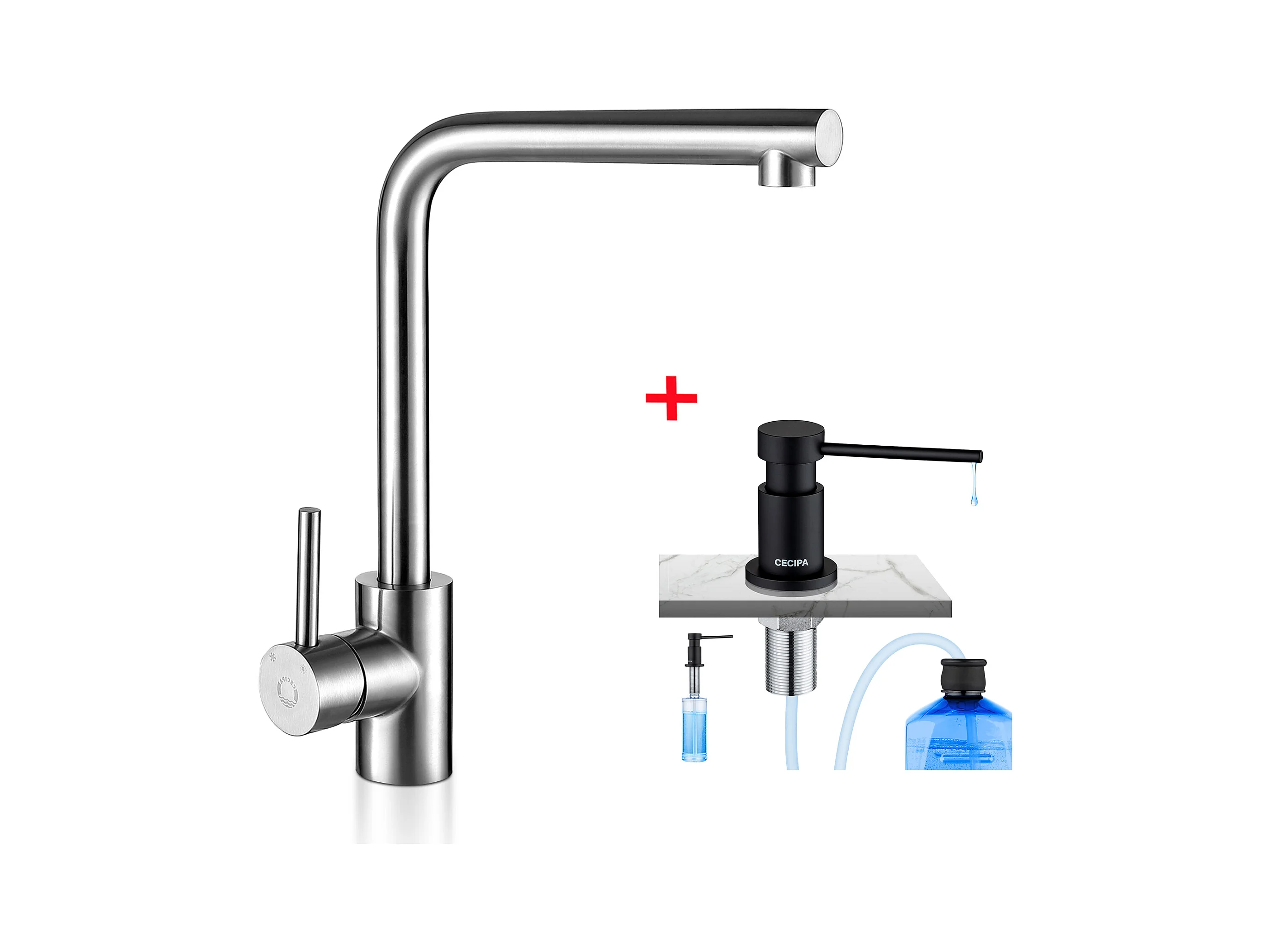 Cecipa max ééngreeps keukenmengkraan, roestvrijstalen spoelbakkraan, 360° draaibare kraan + geborstelde keukenzeepdispenser