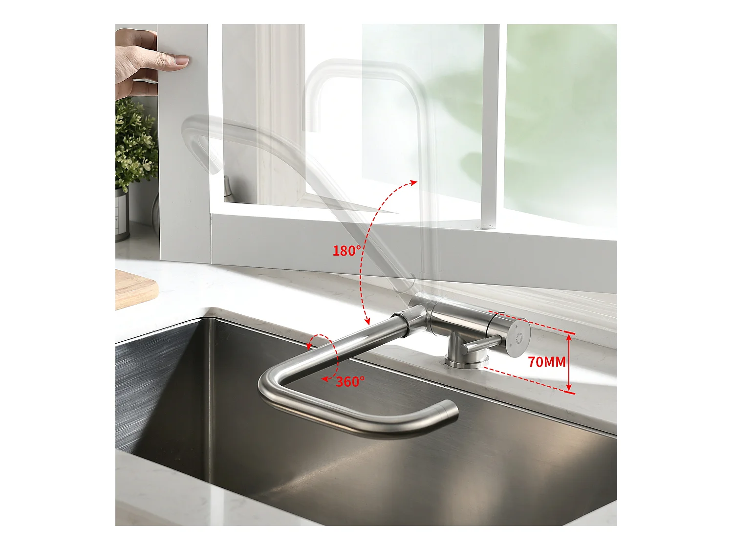 Opklapbare Keukenmengkraan, Opvouwbare Keukenkraan Onder Raam, Keukenkraan met hoge 360° draaibare uitloop en demonteerbare beluchter, geborsteld