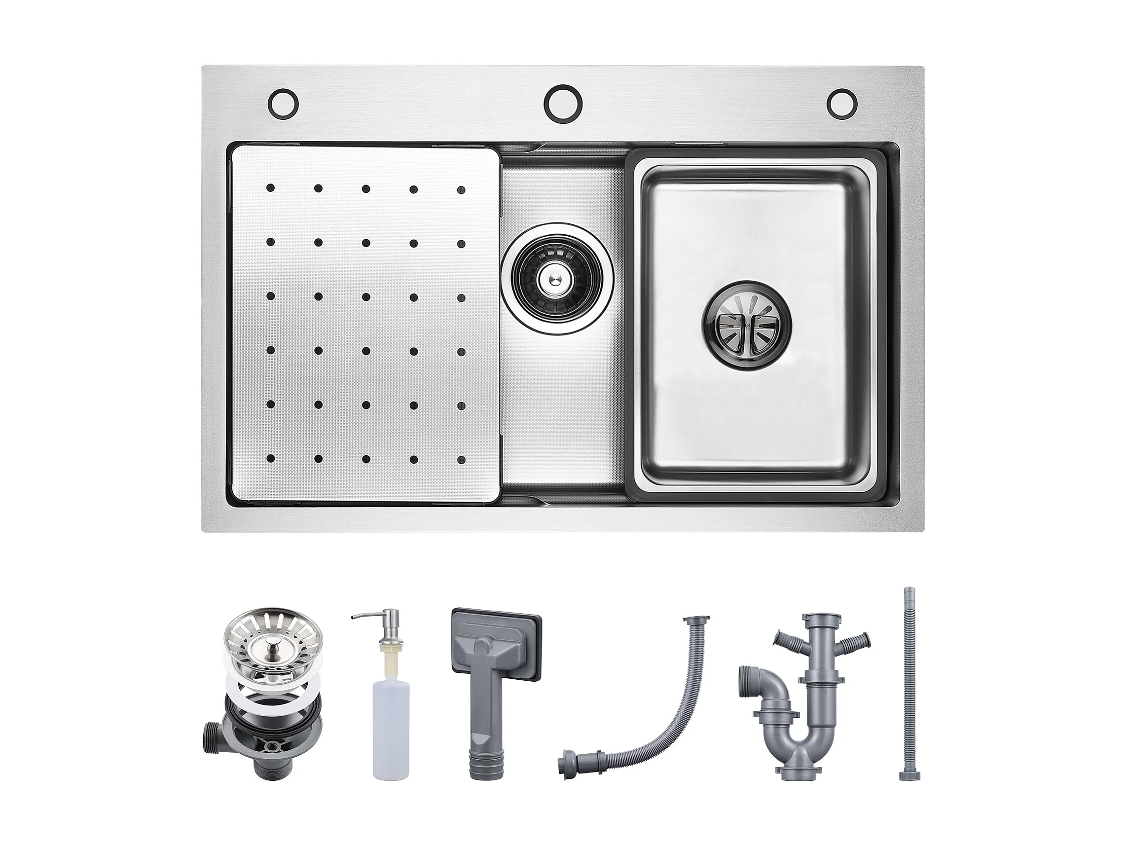 Cecipa max roestvrijstalen spoelbak 70×45×21,5CM met afdruiprek, wastafel en zeepdispenser + opvouwbare keukenkraan geborsteld opvouwbare spoelbakmengkraan