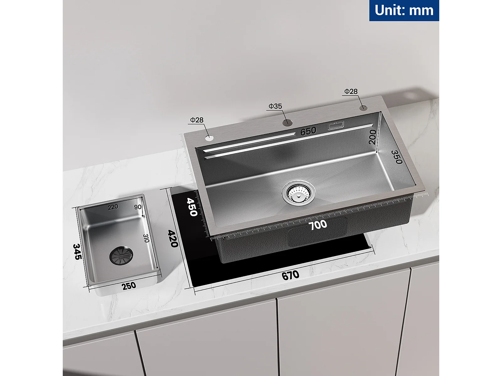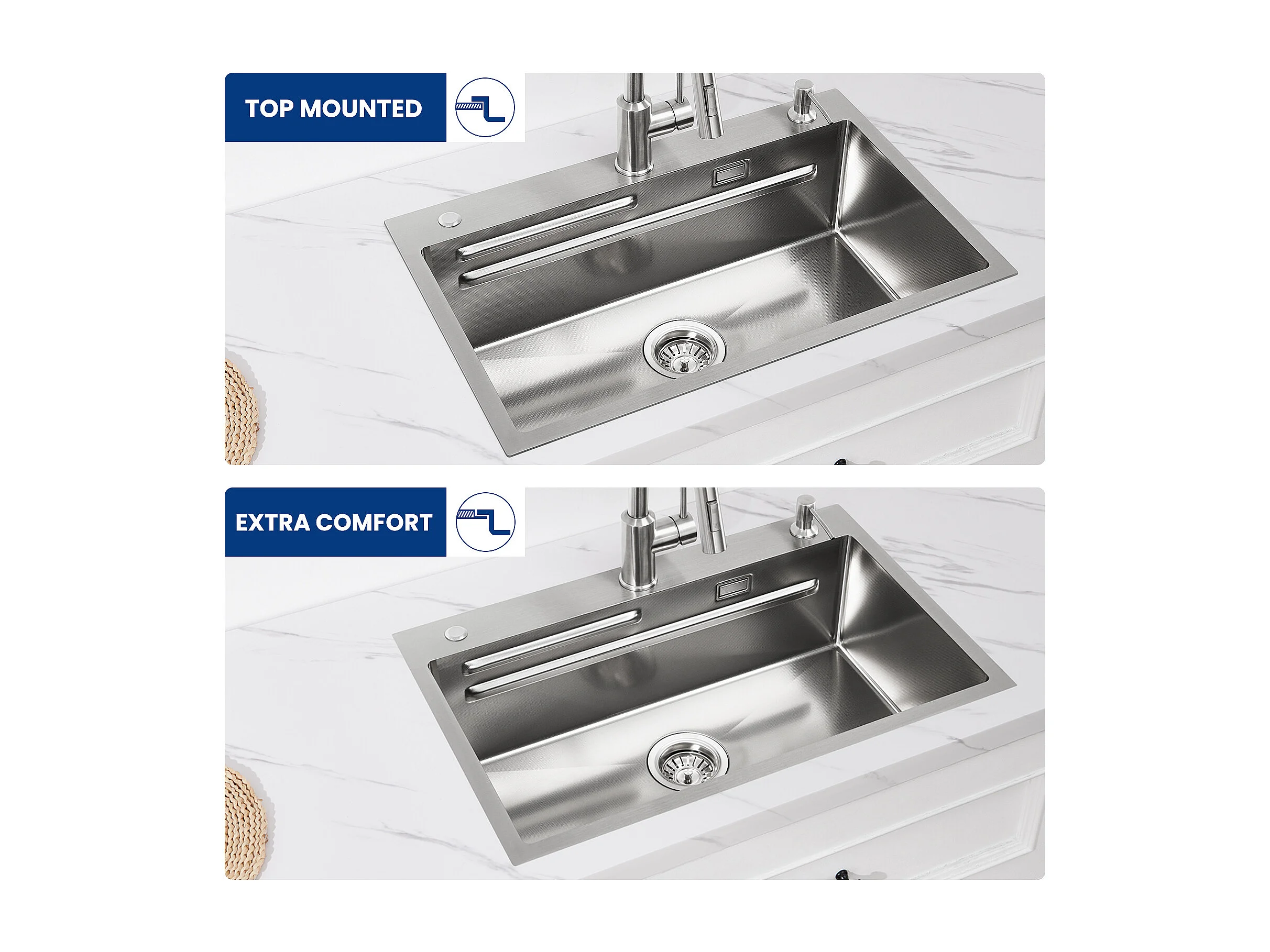 Cecipa max roestvrijstalen spoelbak 70×45×CM met afdruiprek, wastafel en zeepdispenser + mengkraan met uittrekbare straal, 3 waterafvoermodi, zwart