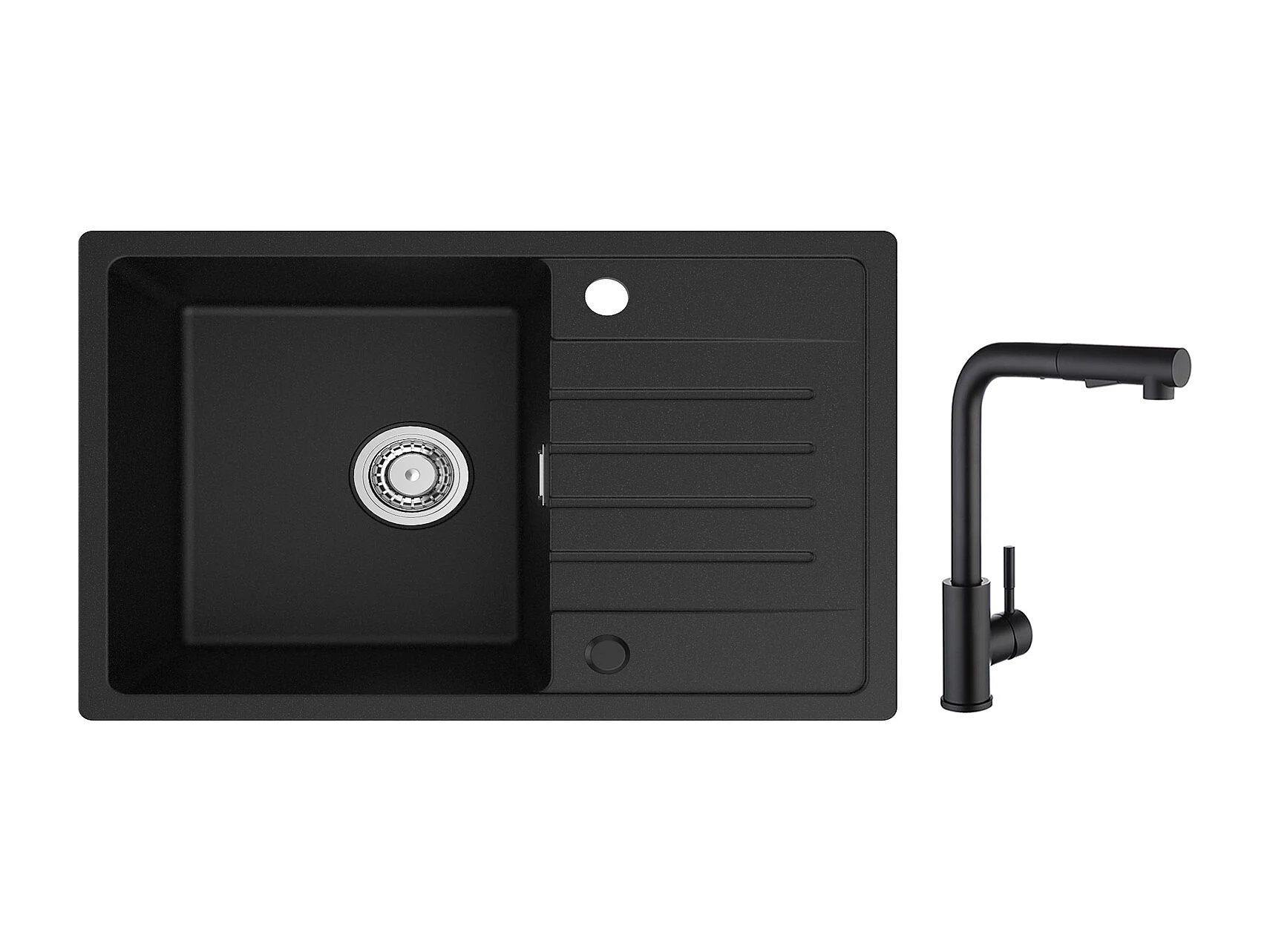 Spoelbak met 1 bak in kwarts en hars - Zwarte spoelbak met afdruiprek 78x45cm + mengkraan met uittrekbare spray, zwart