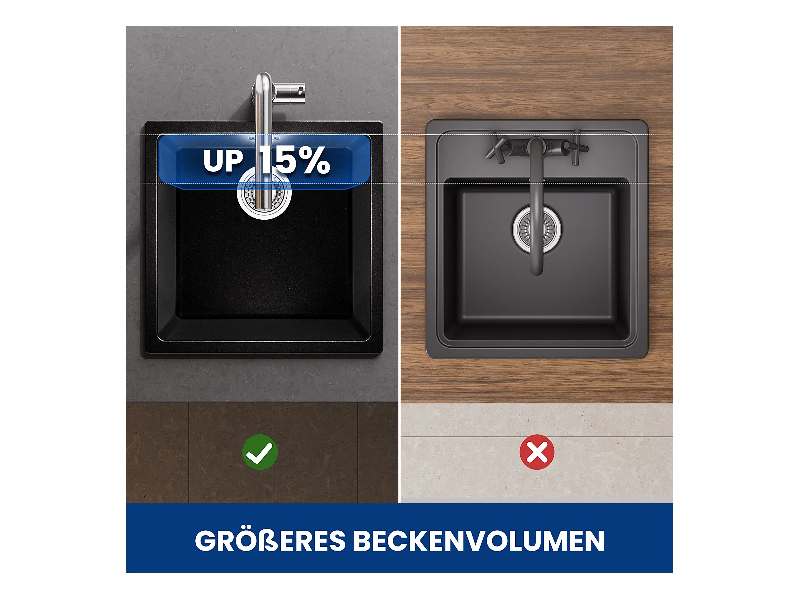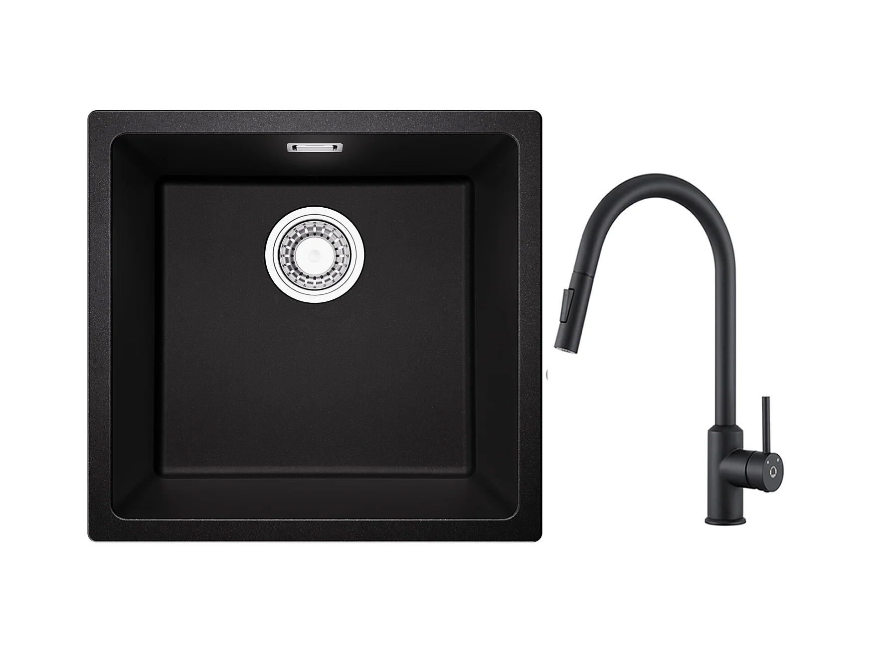 spoelbak in kwarts en hars, 3 montageopties, 45*44*20cm + zwarte roestvrijstalen keukenmengkraan