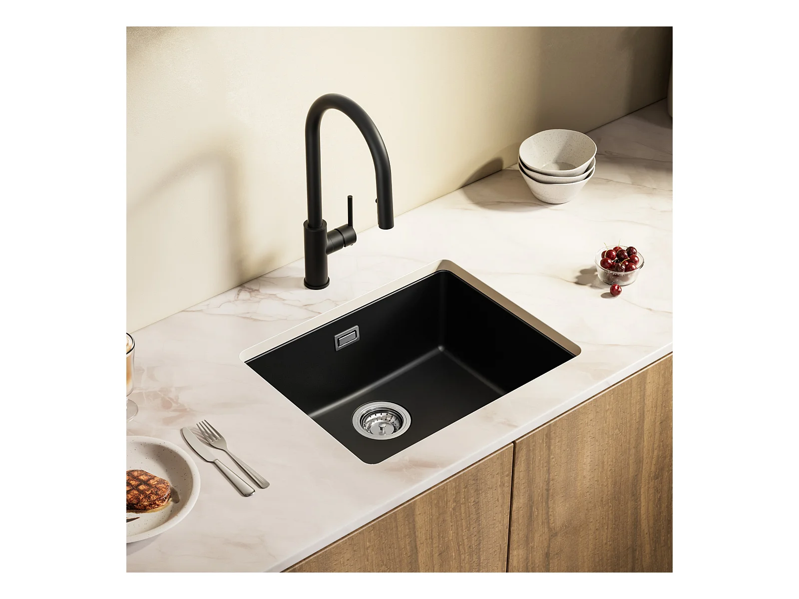 CECIPA MAX Spoelbak 1 Kom in Kwarts en Hars Zwart Grijs 55*44*20cm + Keukenmixer met Zwarte Uittrekbare Spray
