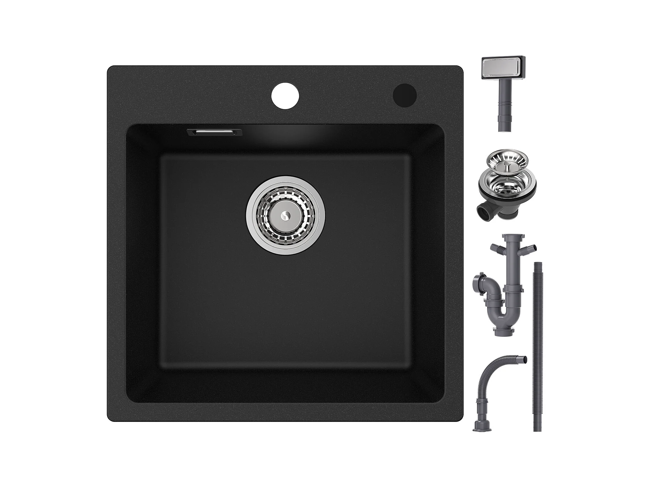 Cecipa max zwarte quartz spoelbak 45x45 cm 1 wastafel in kwarts en hars + keukenmengkraan met uittrekbare spray, 3 waterafvoermodi, zwart