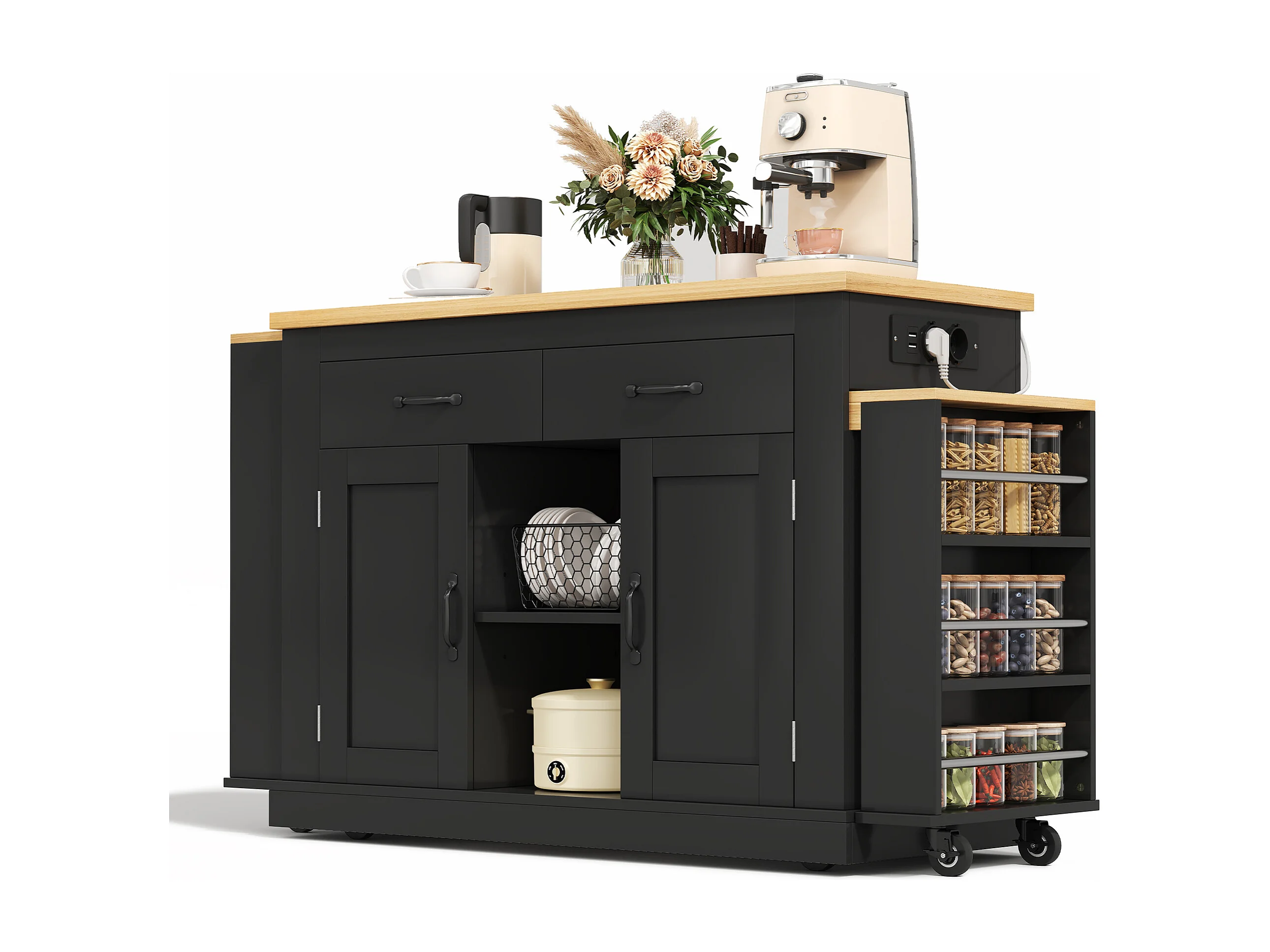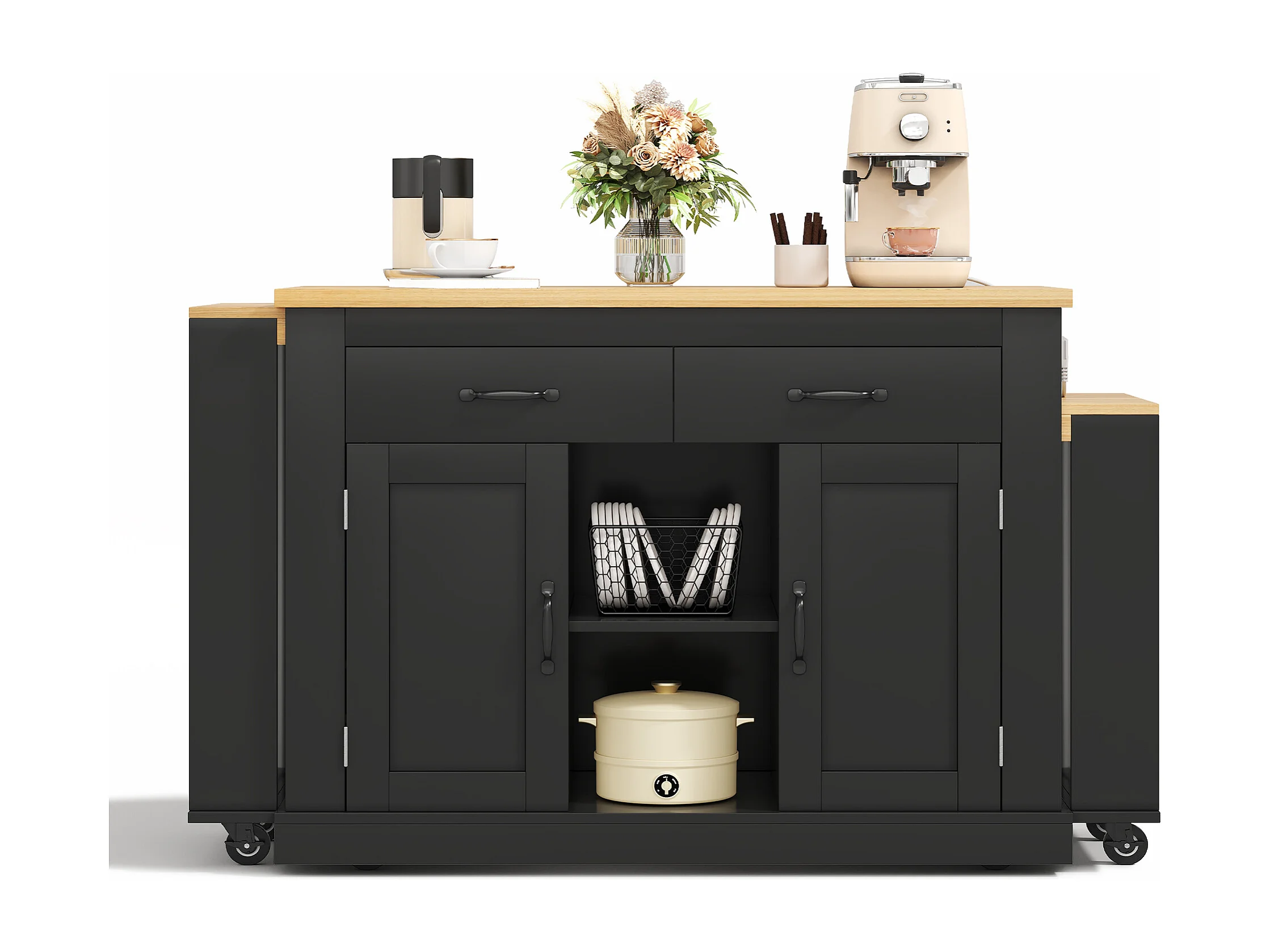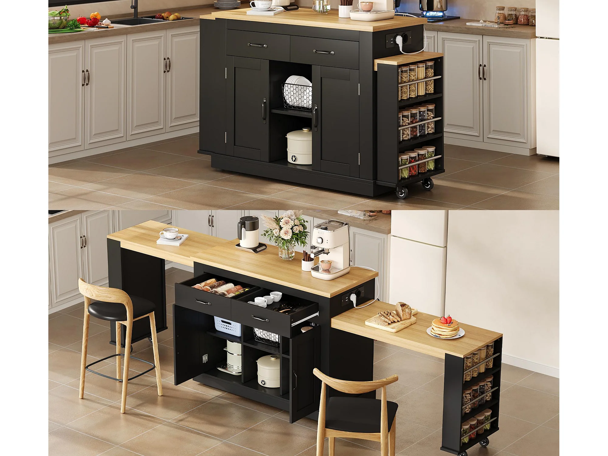 Centraal kookeiland - 2 uitschuifbare eettafels - met 2 stopcontacten en 2 USB-poorten - grote opbergruimte - Natuur + Zwart