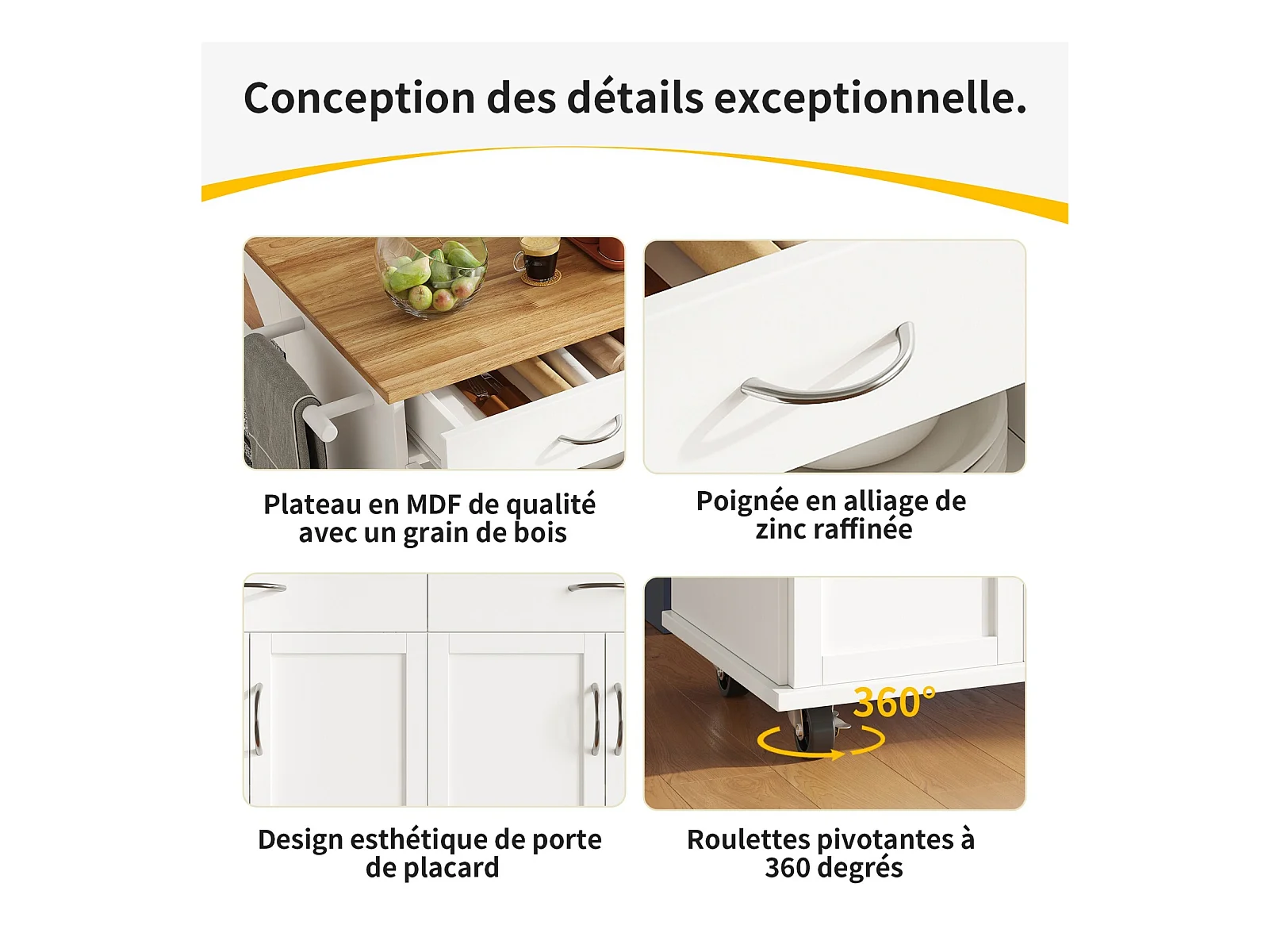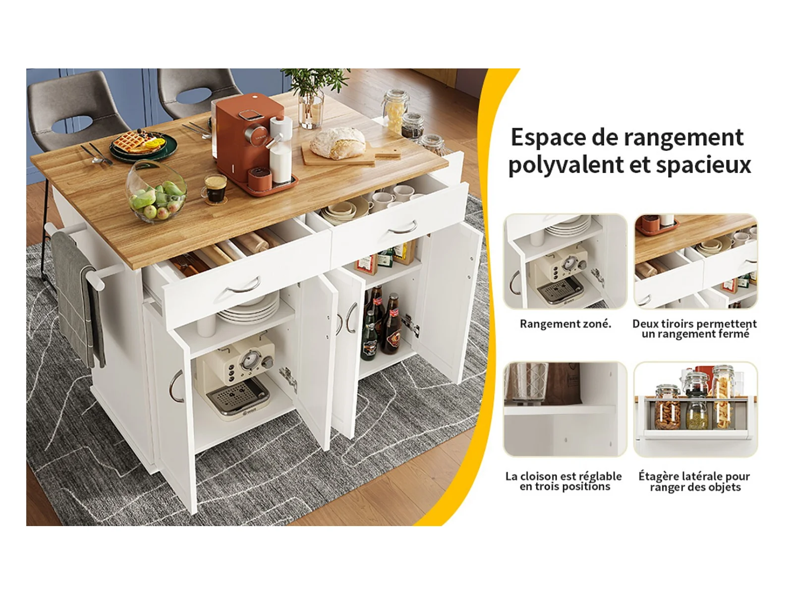 Witte keukenwagen met 2 lades en 2 deuren, houten blad - geschikt voor woonkamer en keuken