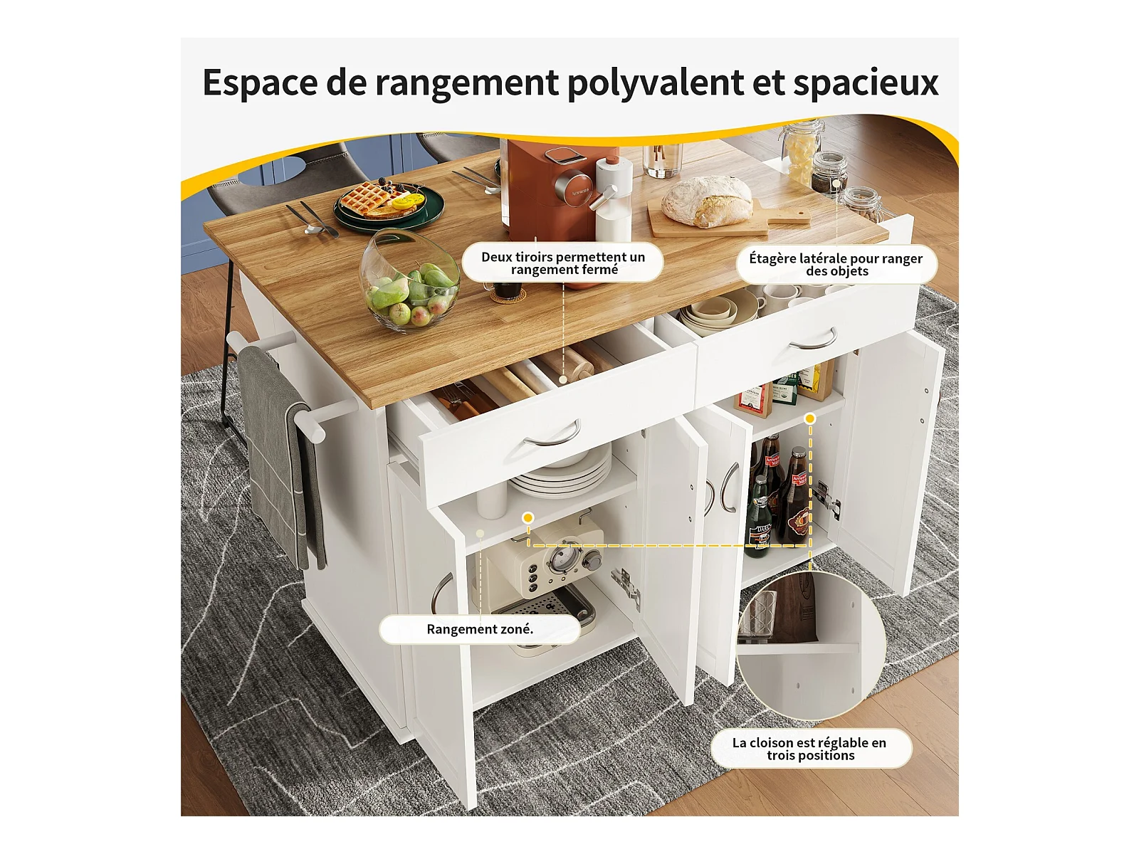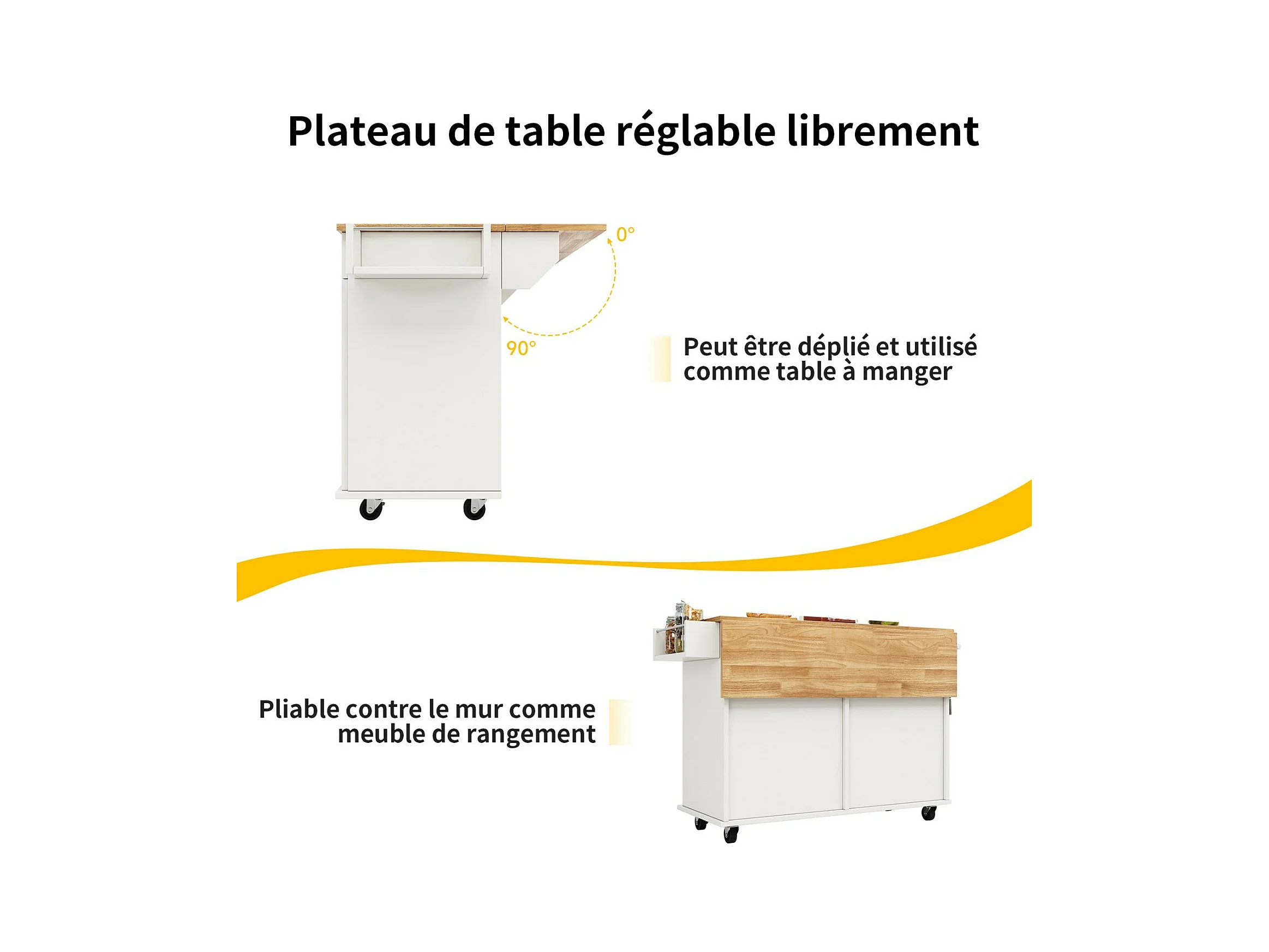 Verrijdbaar kookeiland met opklapbaar tafelblad, 3 deuren en 2 opbergladen - Wit