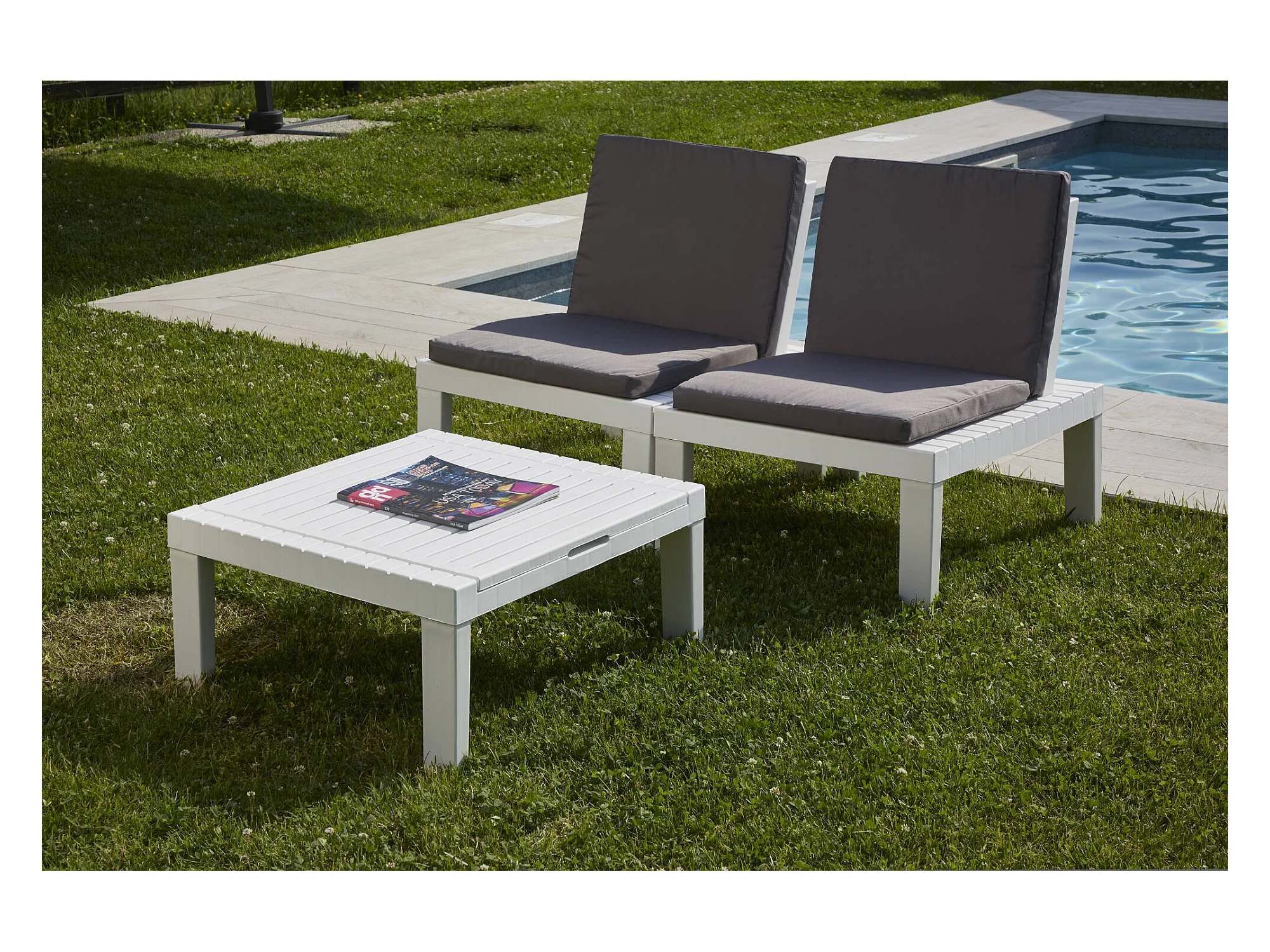 Dbaggi outdoor loungeset, Tuinset met 2 stoelen met rugleuning en 1 multifunctionele module, Lounge met kussens, 100% Made in Italy, Wit