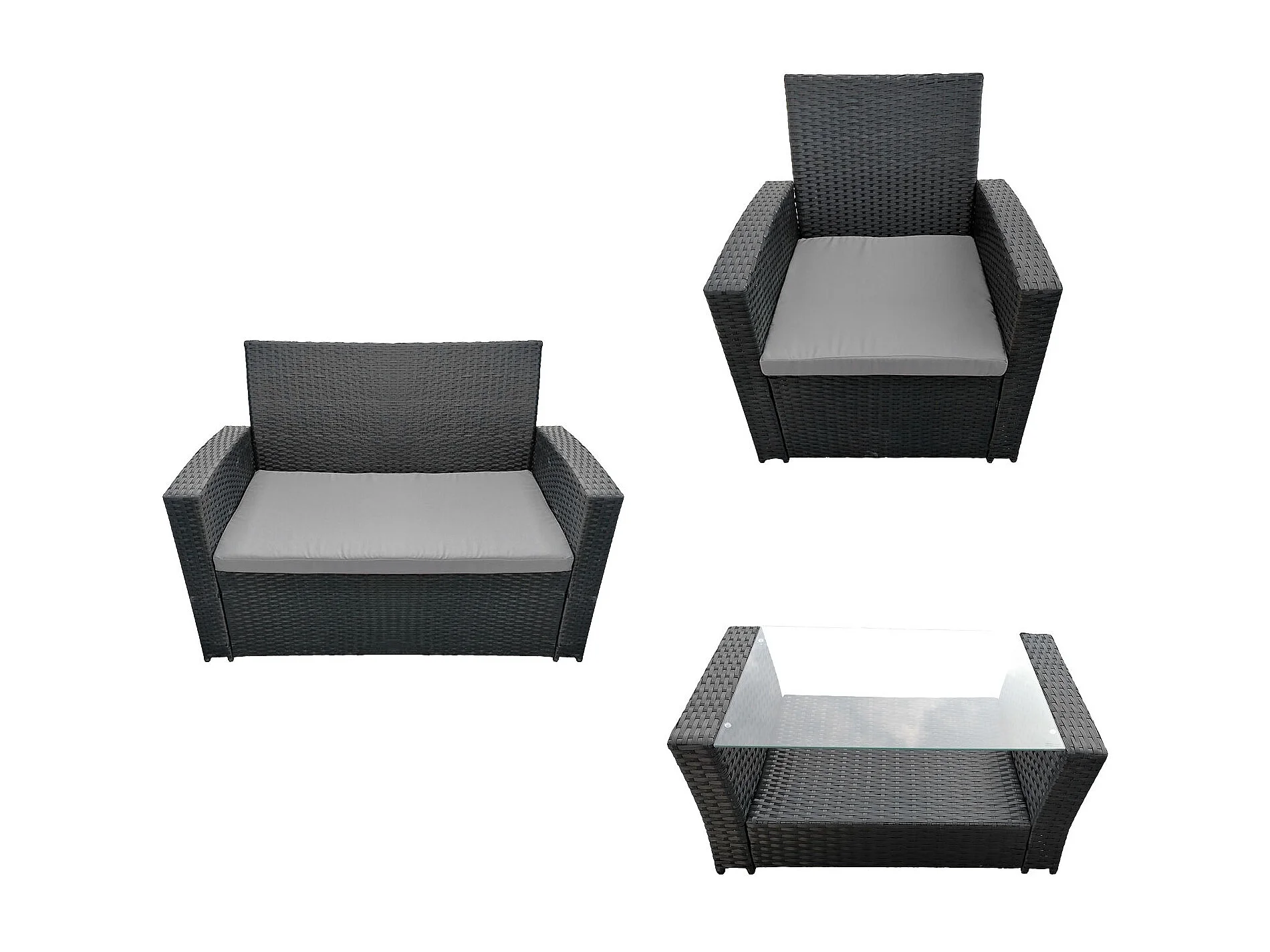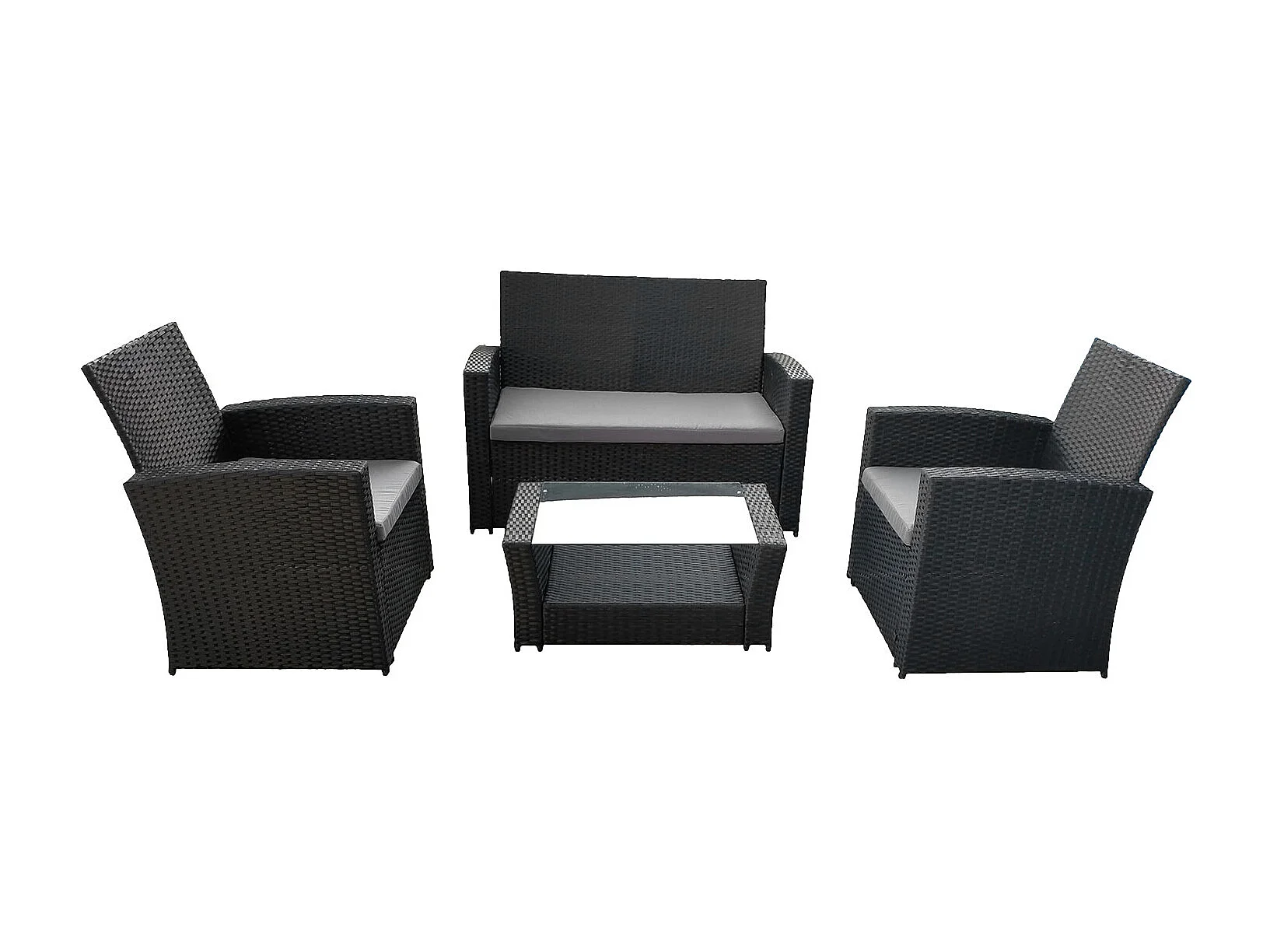 COMINO tuinmeubelset in zwart gevlochten kunststof 4 zitplaatsen - grijze kussens