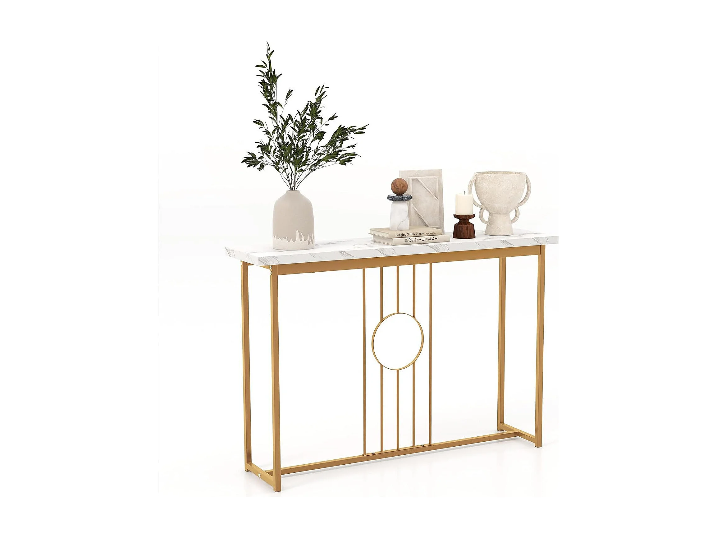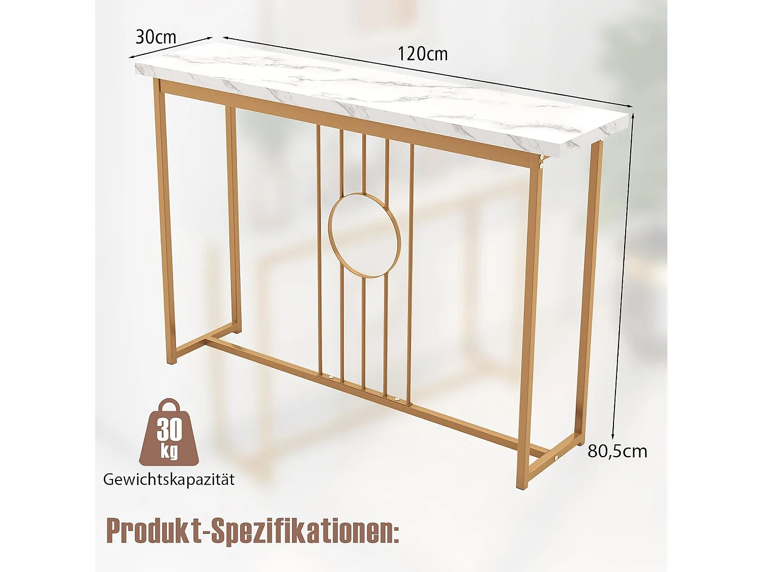 Consoletafel, marmerlook, haltafel, smal, bijzettafel met metalen frame, entreetafel voor entree, woonkamer, hal, 120 x 30 x 80,5 cm, goud, VH33424