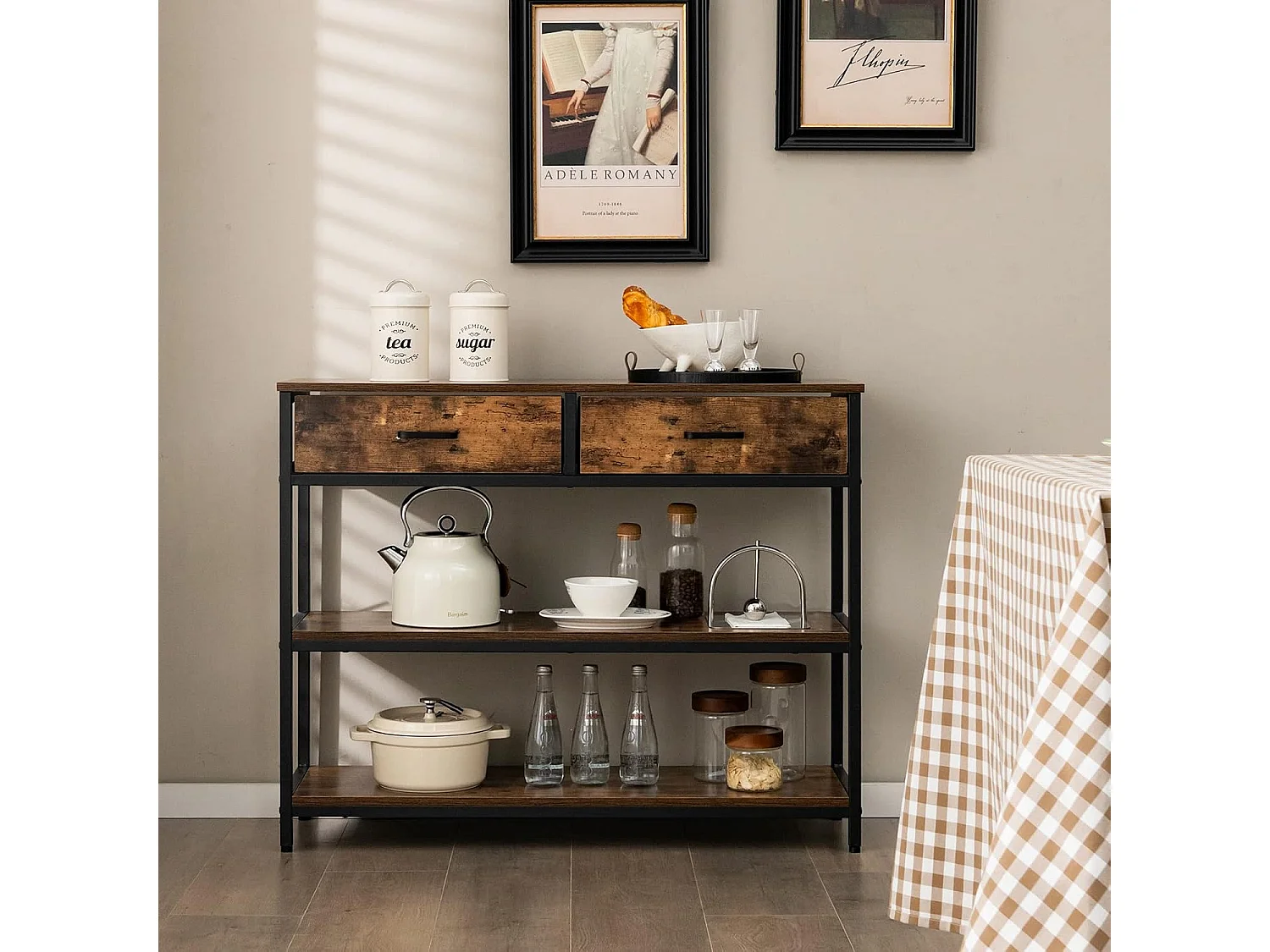 Consoletafel met lade, haltafel smal, 3 niveaus, bijzettafel met metalen frame, van hout, 100 x 30 x 80 cm, vintageVH32711