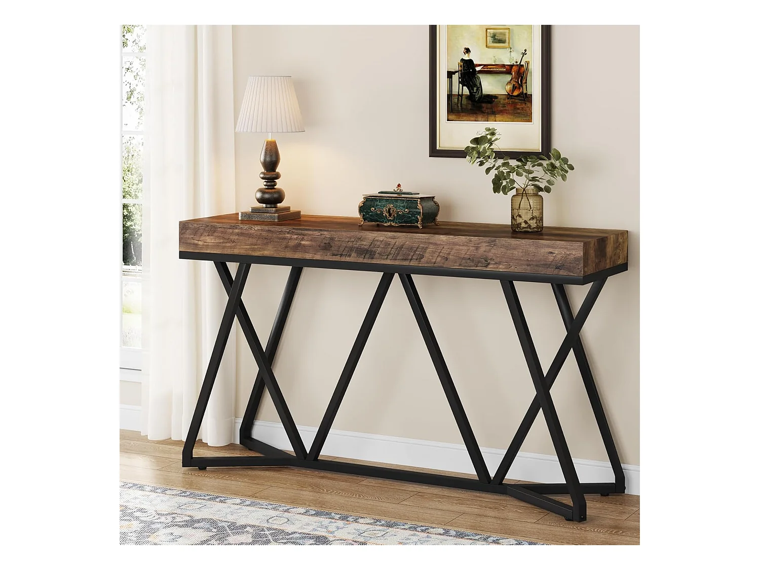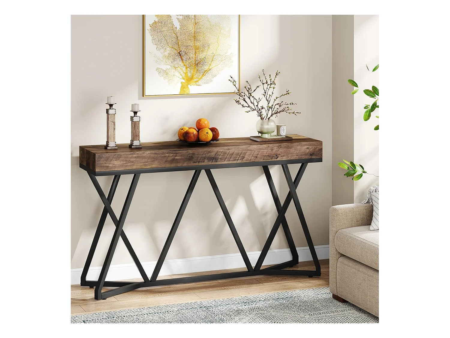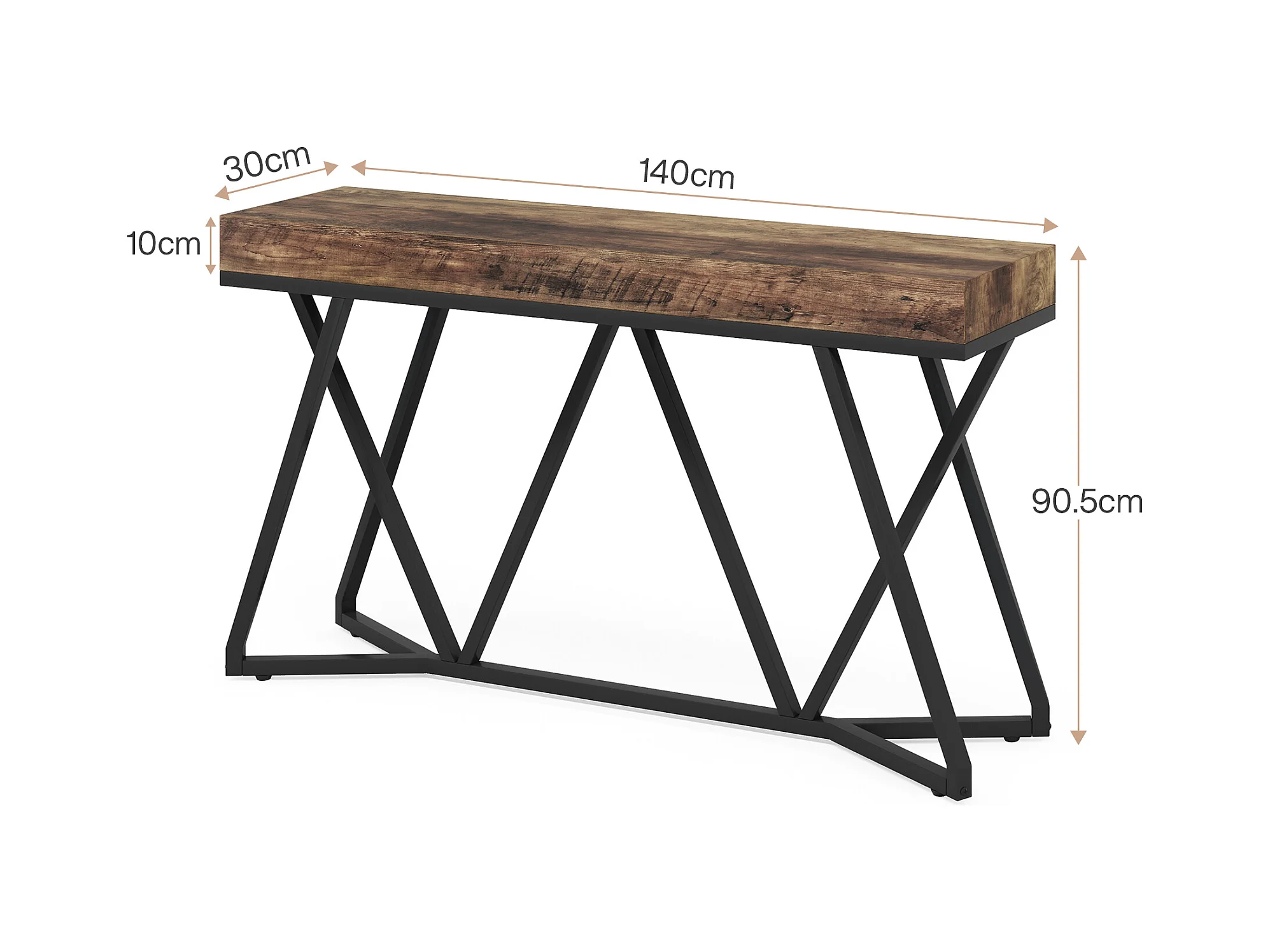 Consoletafel van 140 cm, houten haltafel met uniek metalen onderstel, salontafel, haltafel