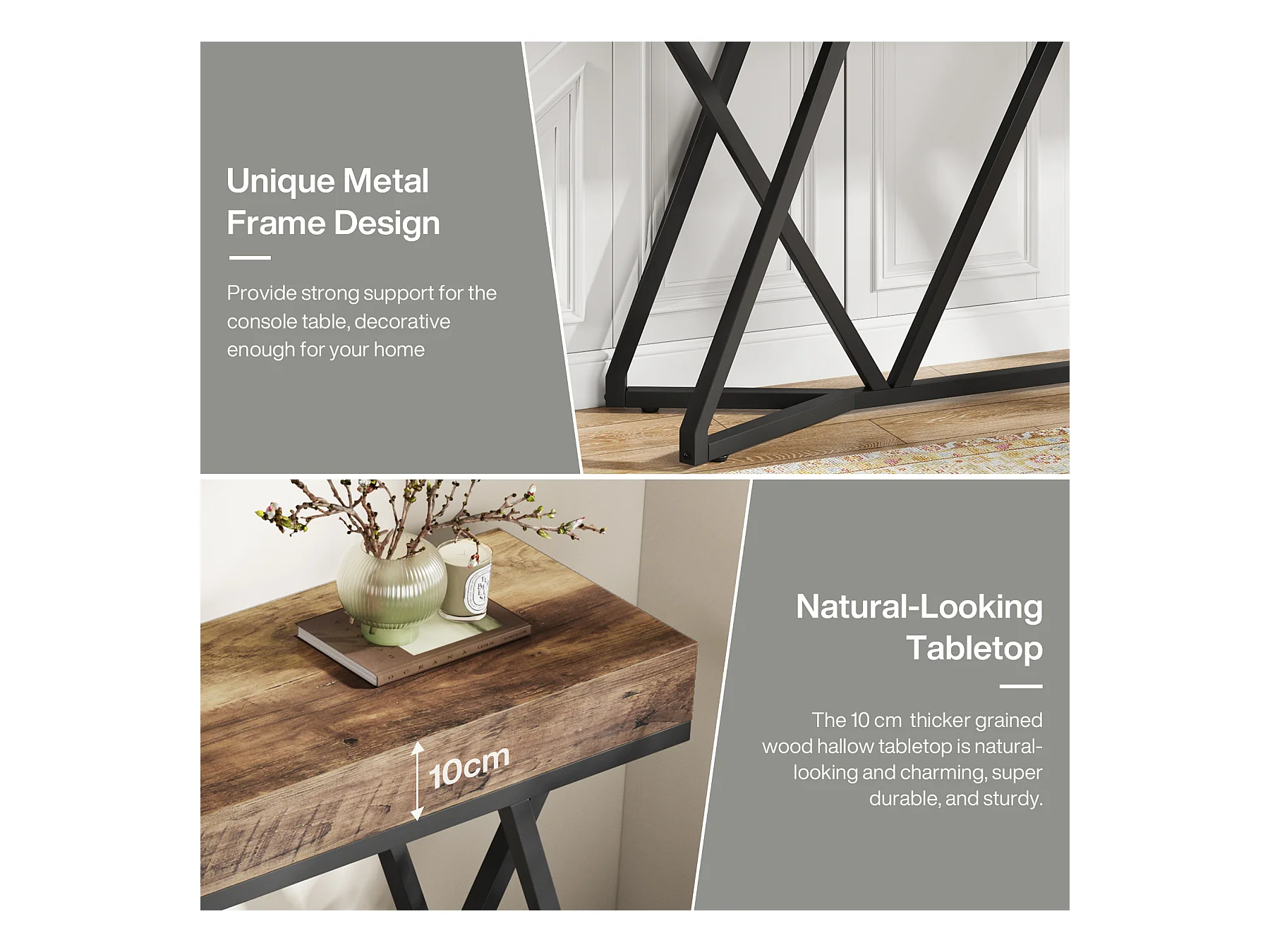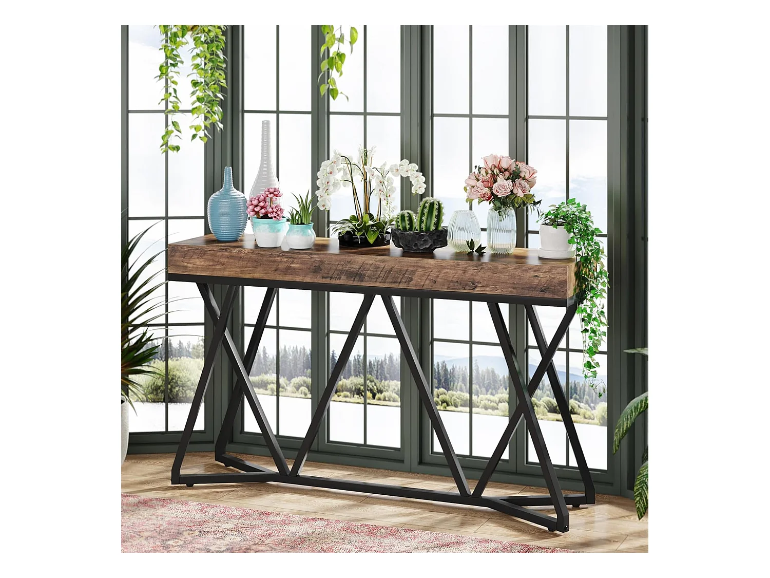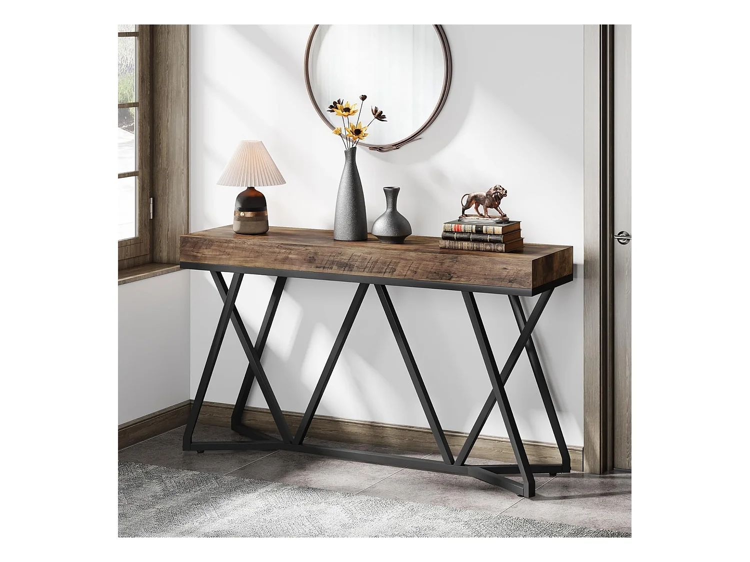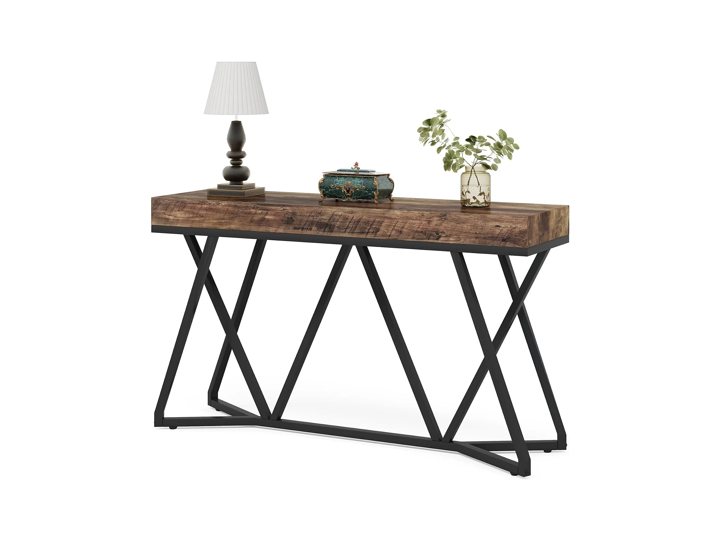 Consoletafel van 140 cm, houten haltafel met uniek metalen onderstel, salontafel, haltafel
