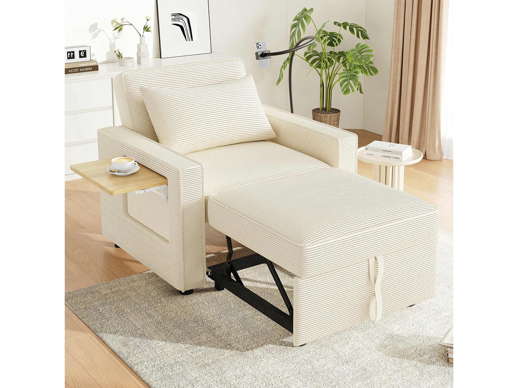 Converteerbare bank met USB-aansluiting en telefoonhouder, verstelbare rugleuning - Beige corduroy