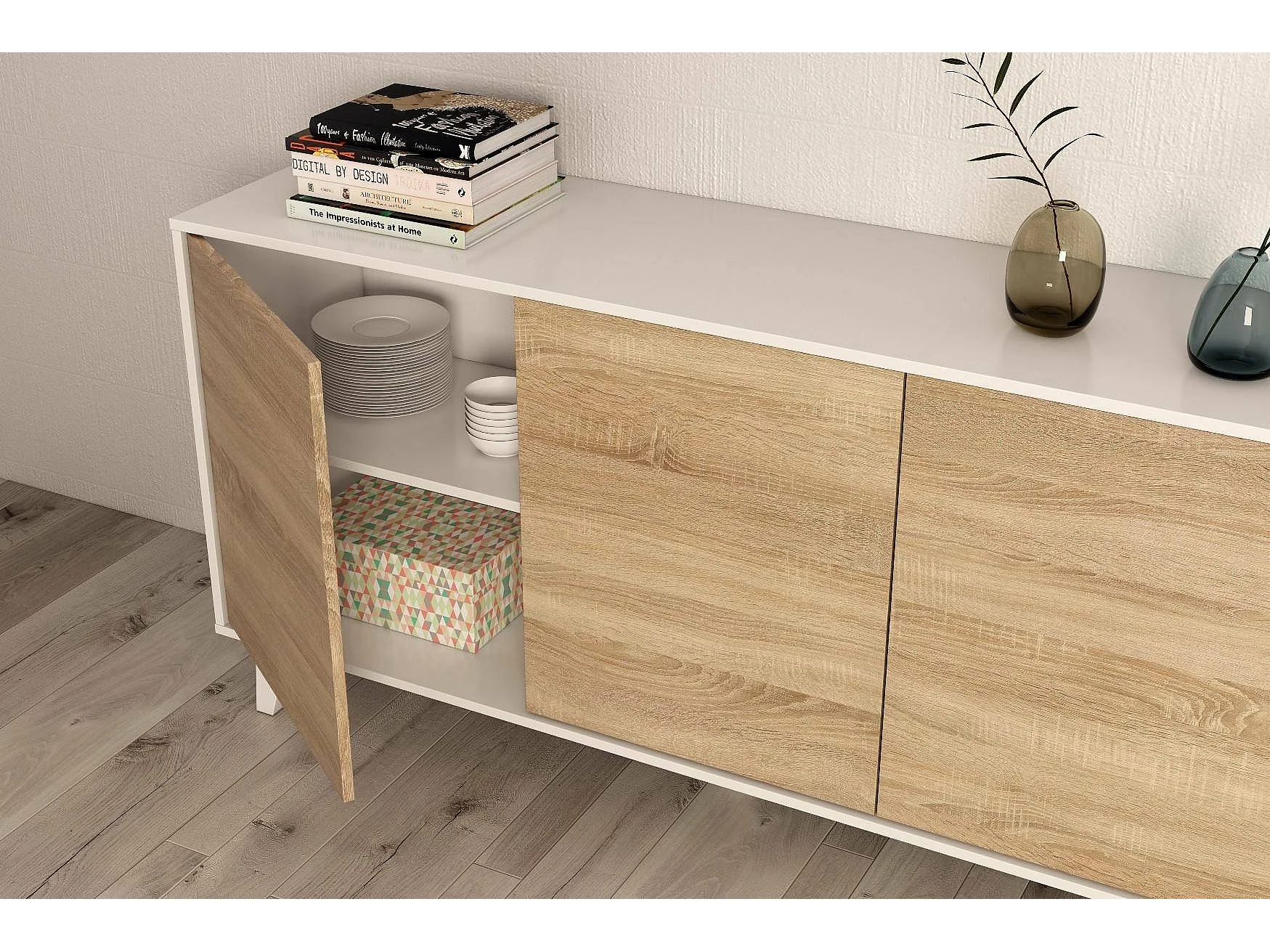Dabello dressoir, Modern dressoir met 3 deuren en planken, Keukenbuffet, Woonkamer design buffet, 154x40h75 cm, Wit en Eiken