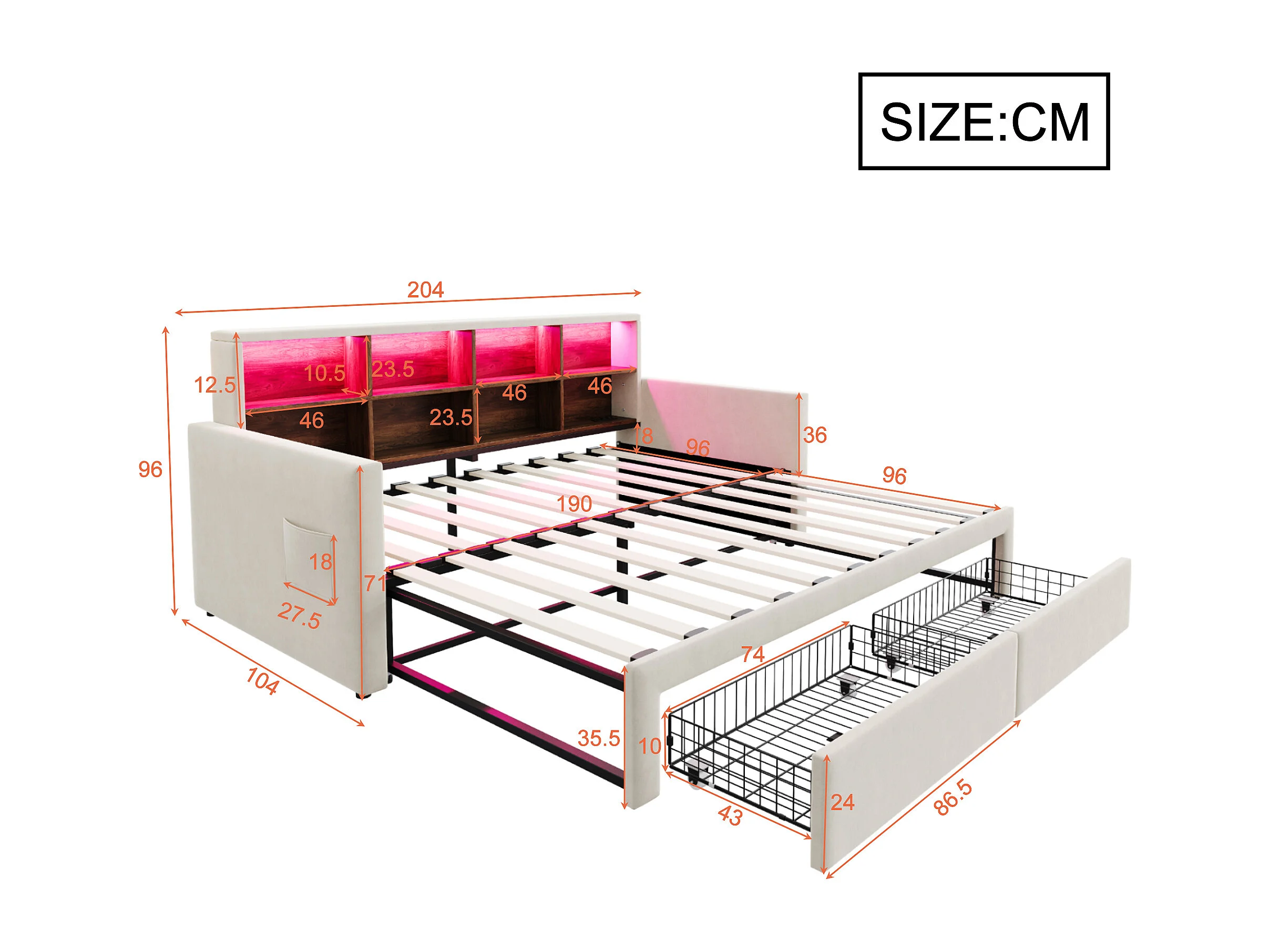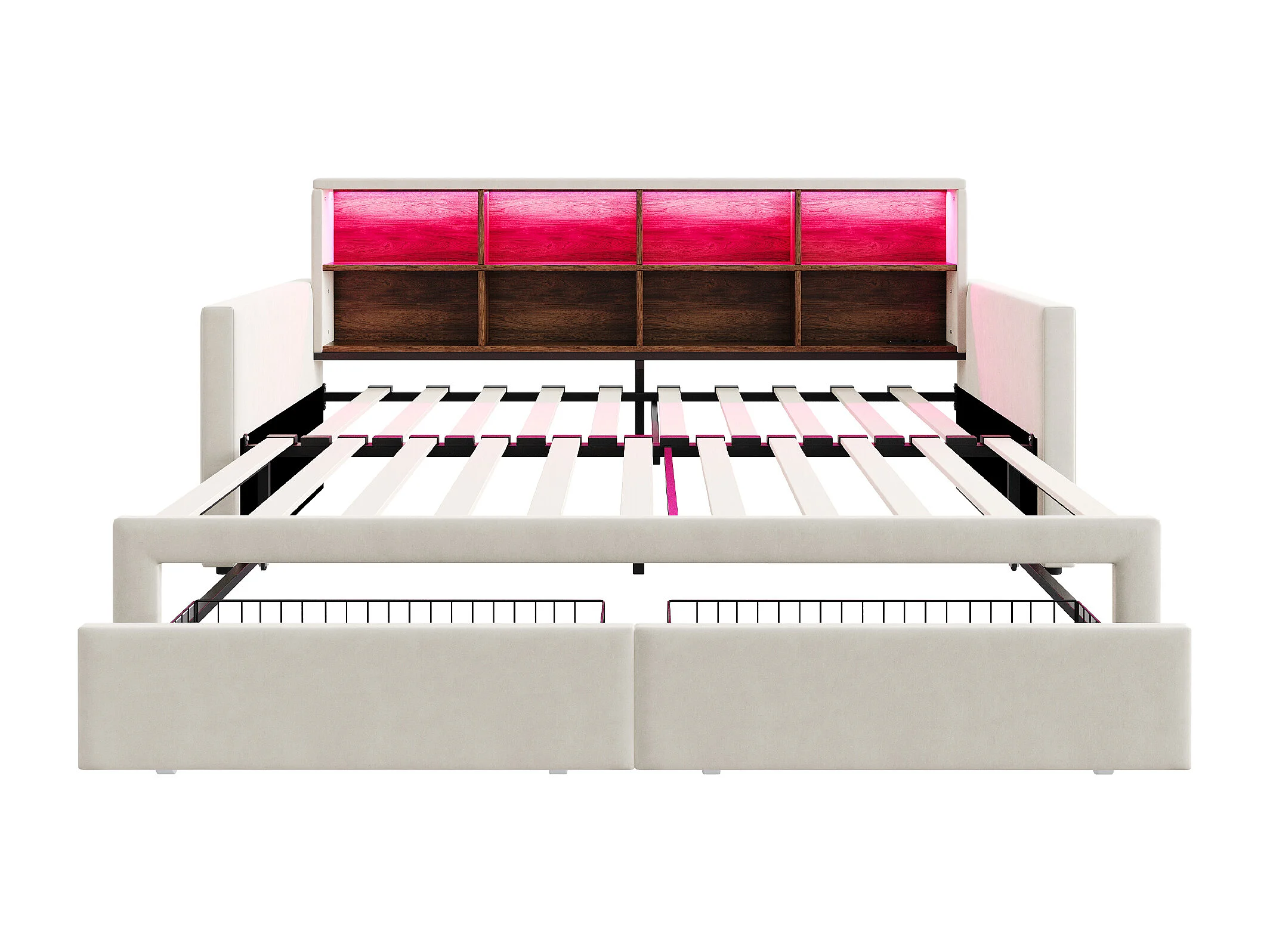 Dagbed 90/180 x 190 cm met 2 lades, ledverlichting en stopcontact, planken - Volwassenenbed in fluweel - Beige