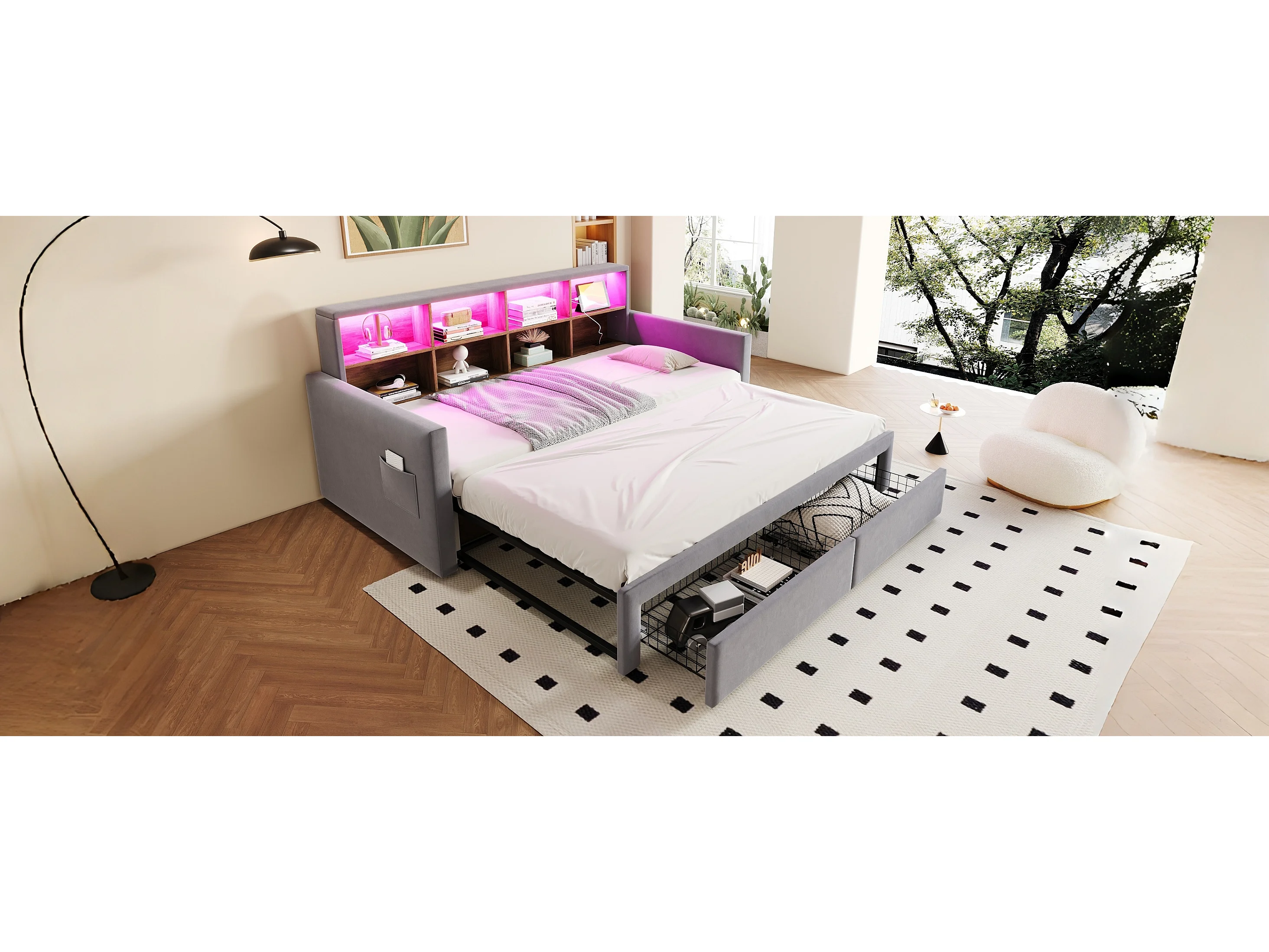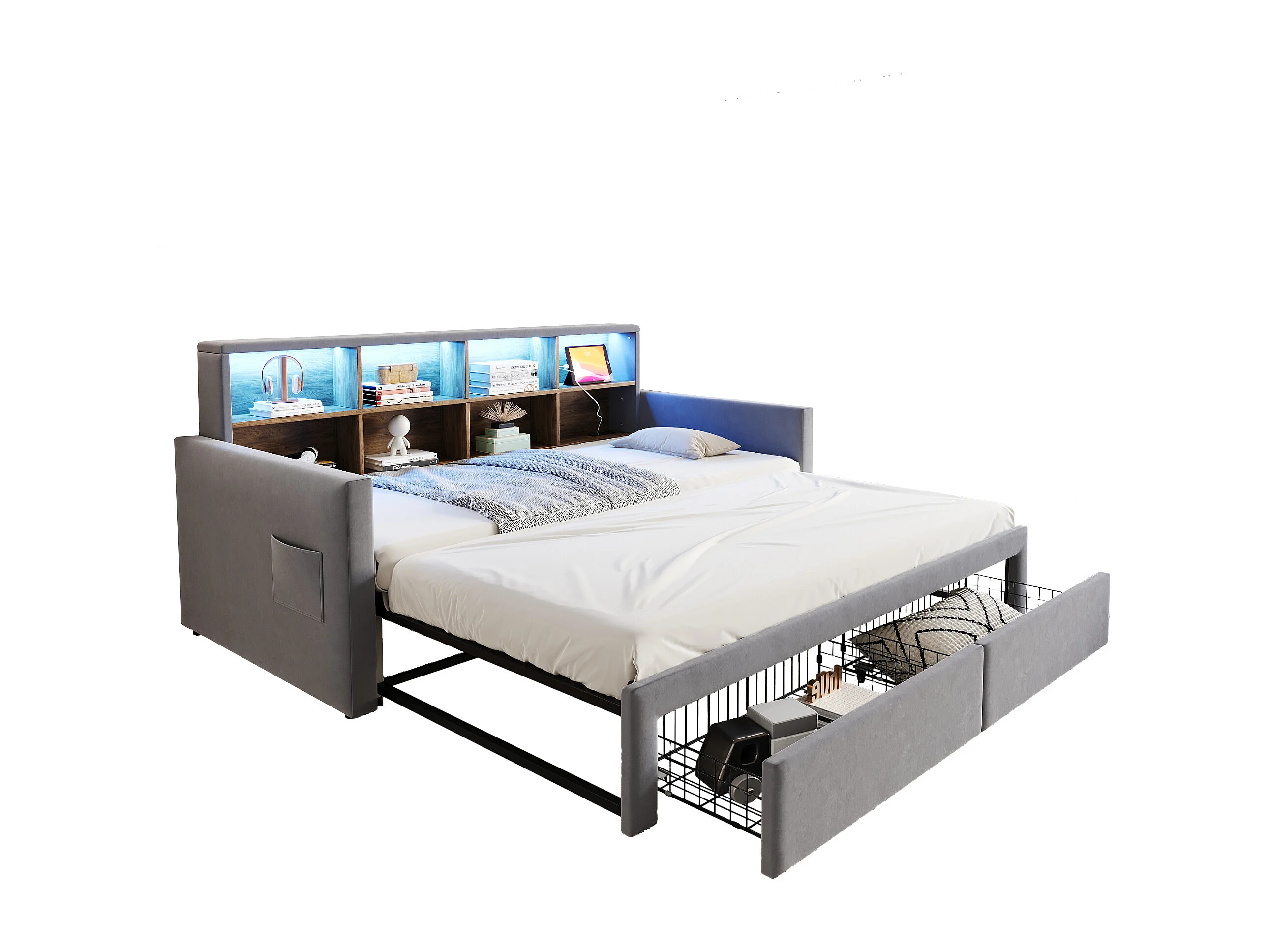 Dagbed 90/180 x 190 cm met 2 lades, ledverlichting en stopcontact, planken - Volwassenenbed in fluweel - Lichtgrijs