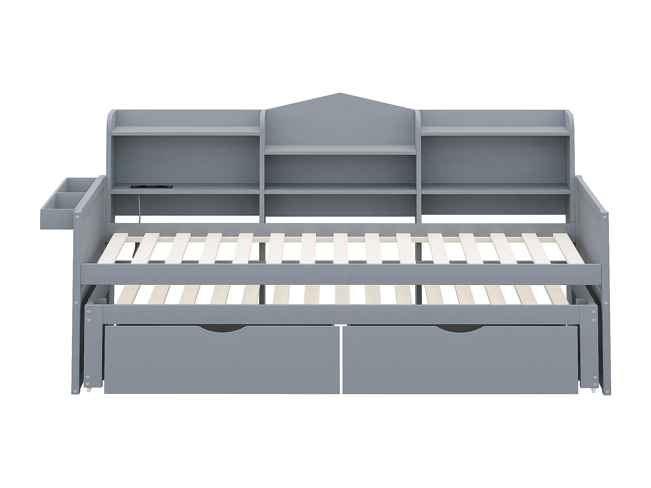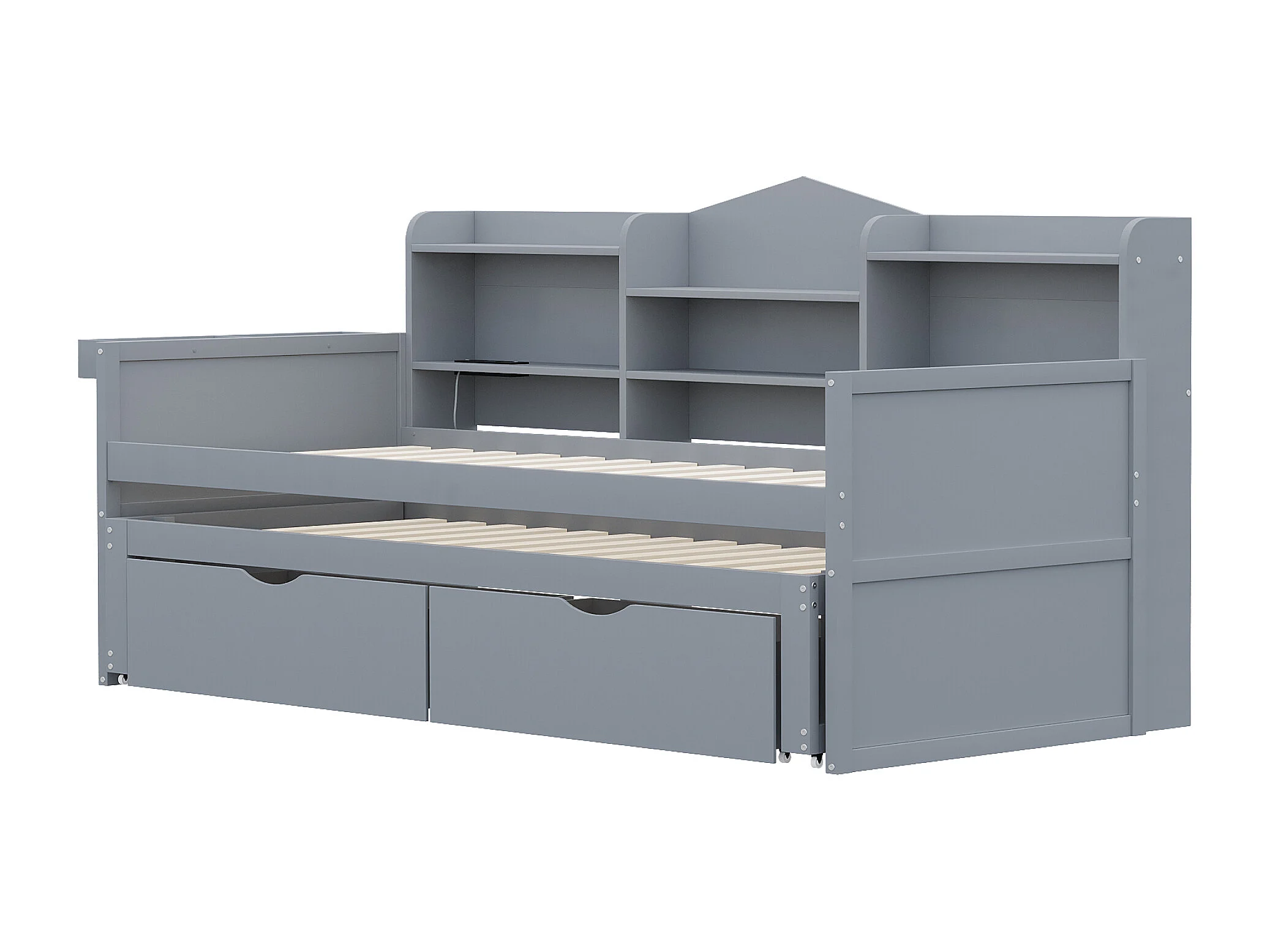 Grijze eenpersoons slaapbank 90x200cm met 2 lades, bureau, stopcontact en opbergruimte, grenen + MDF