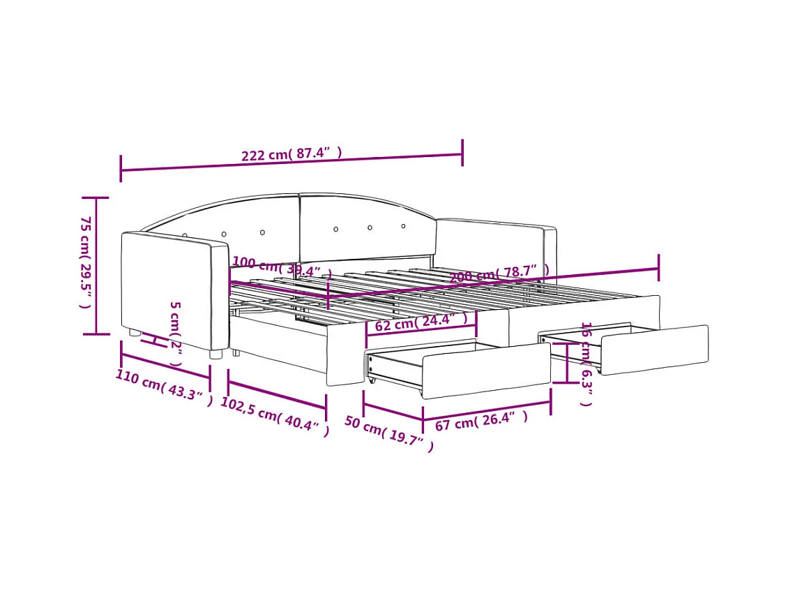 Dagbed met onderschuifbed en lades zonder matras 100x200 cm