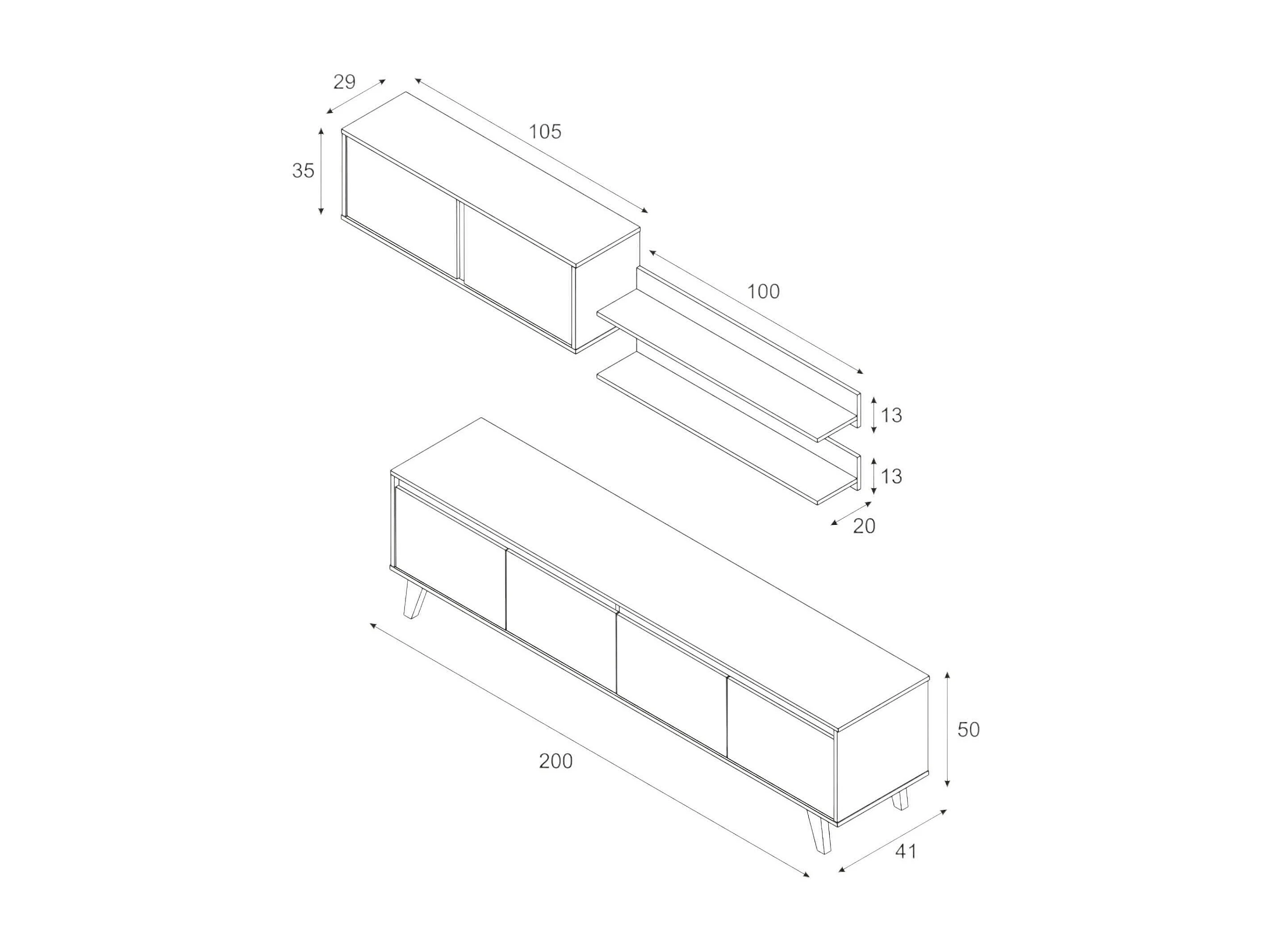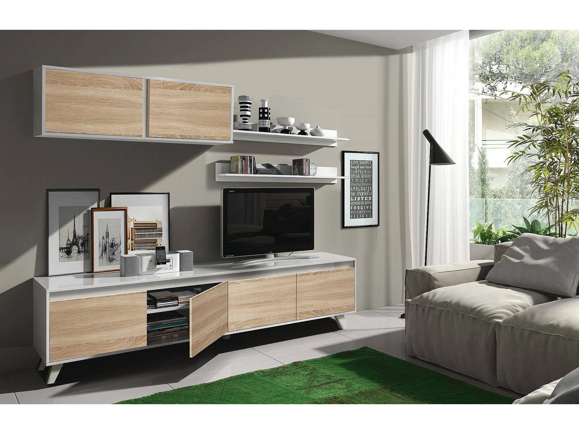 Daless wandsysteem, TV-meubel woonkamermeubel, Woonkamersamenstelling met wandmeubel en plank, 200x50h41 cm, Wit en Eiken