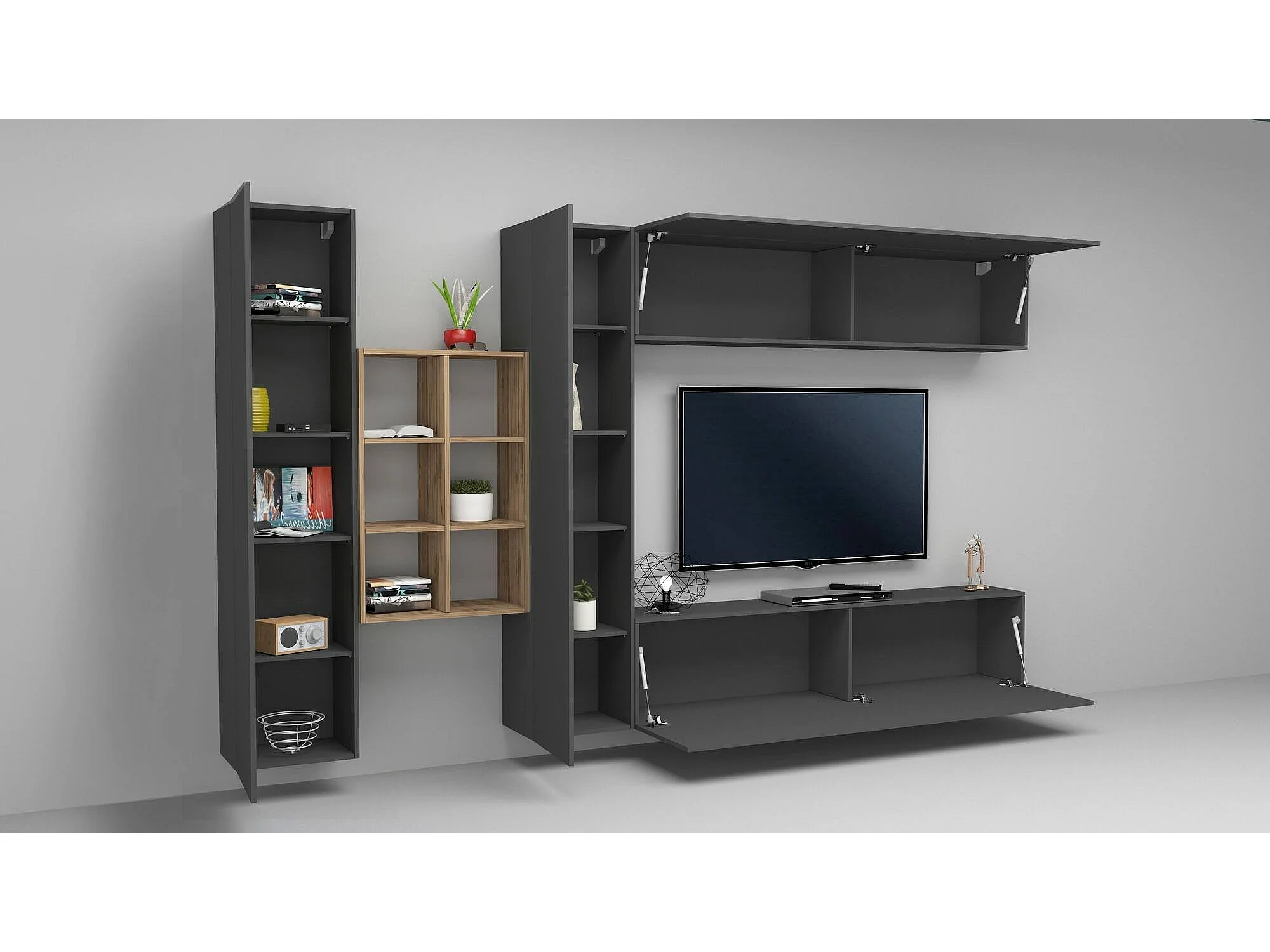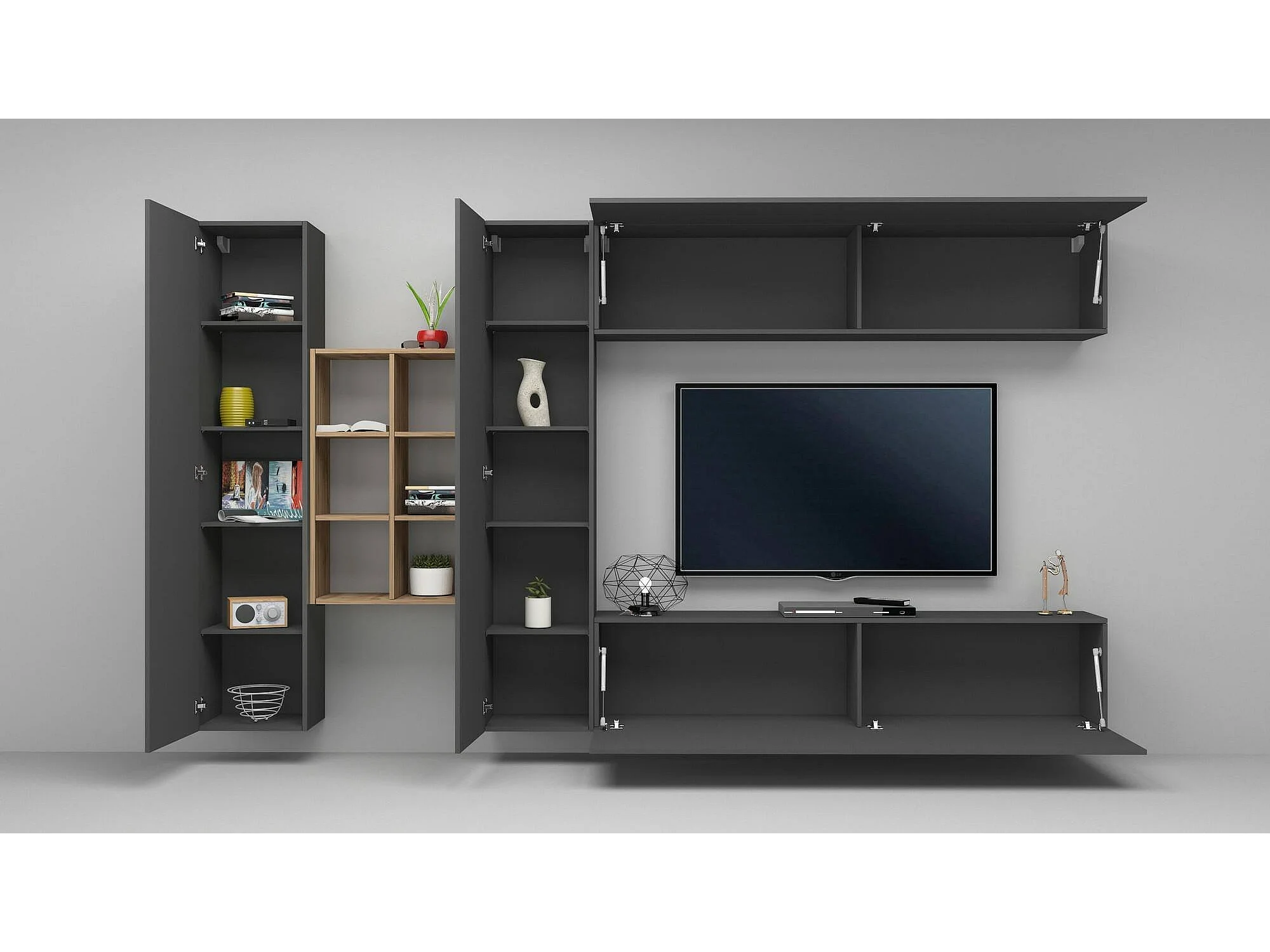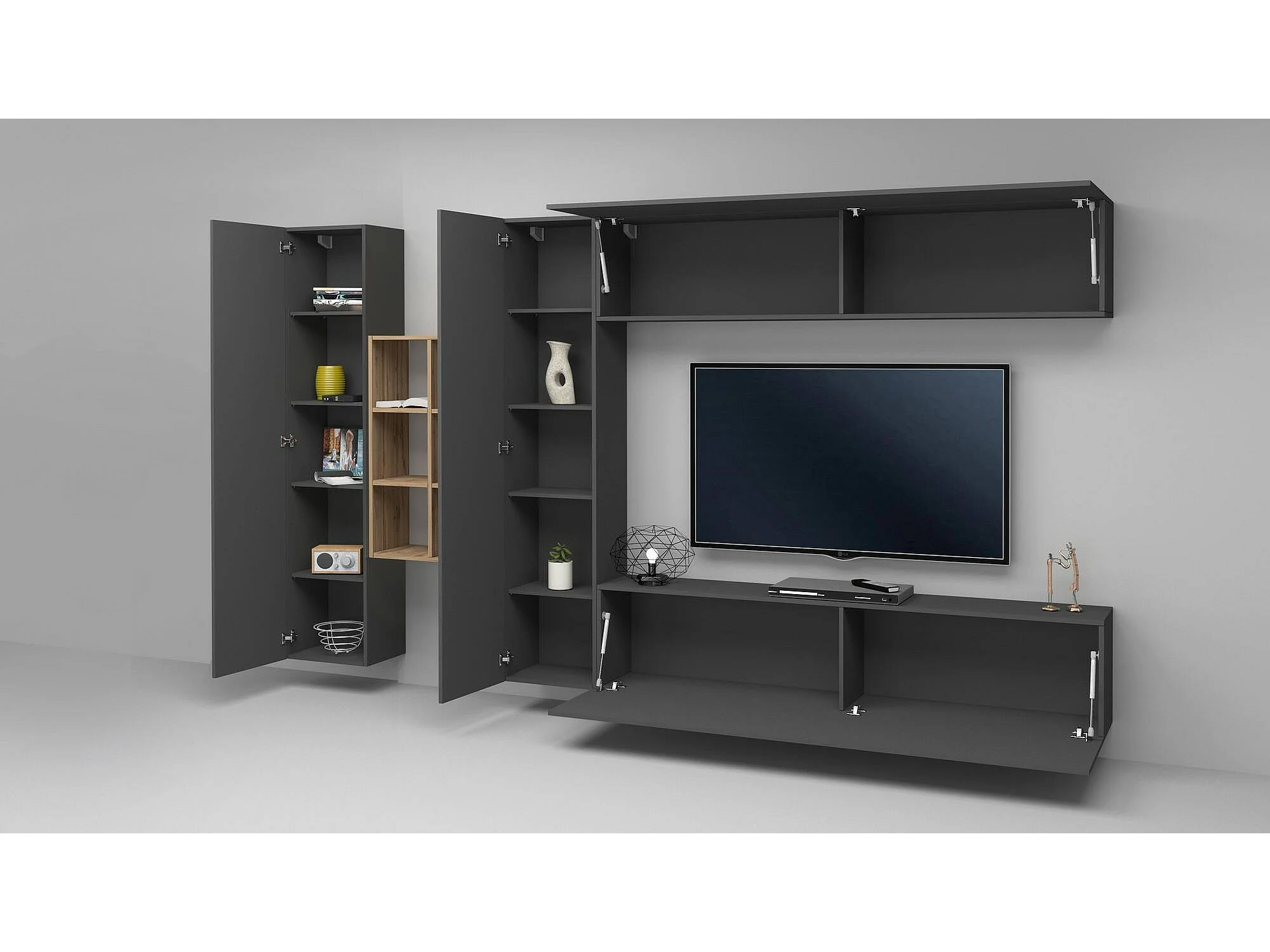 Dmora Wandmeubel Danilo 30x280x180h cm Antracietzwart 17 Planken Openslaand en Klapdeuren, 20 Vakken Made in Italy