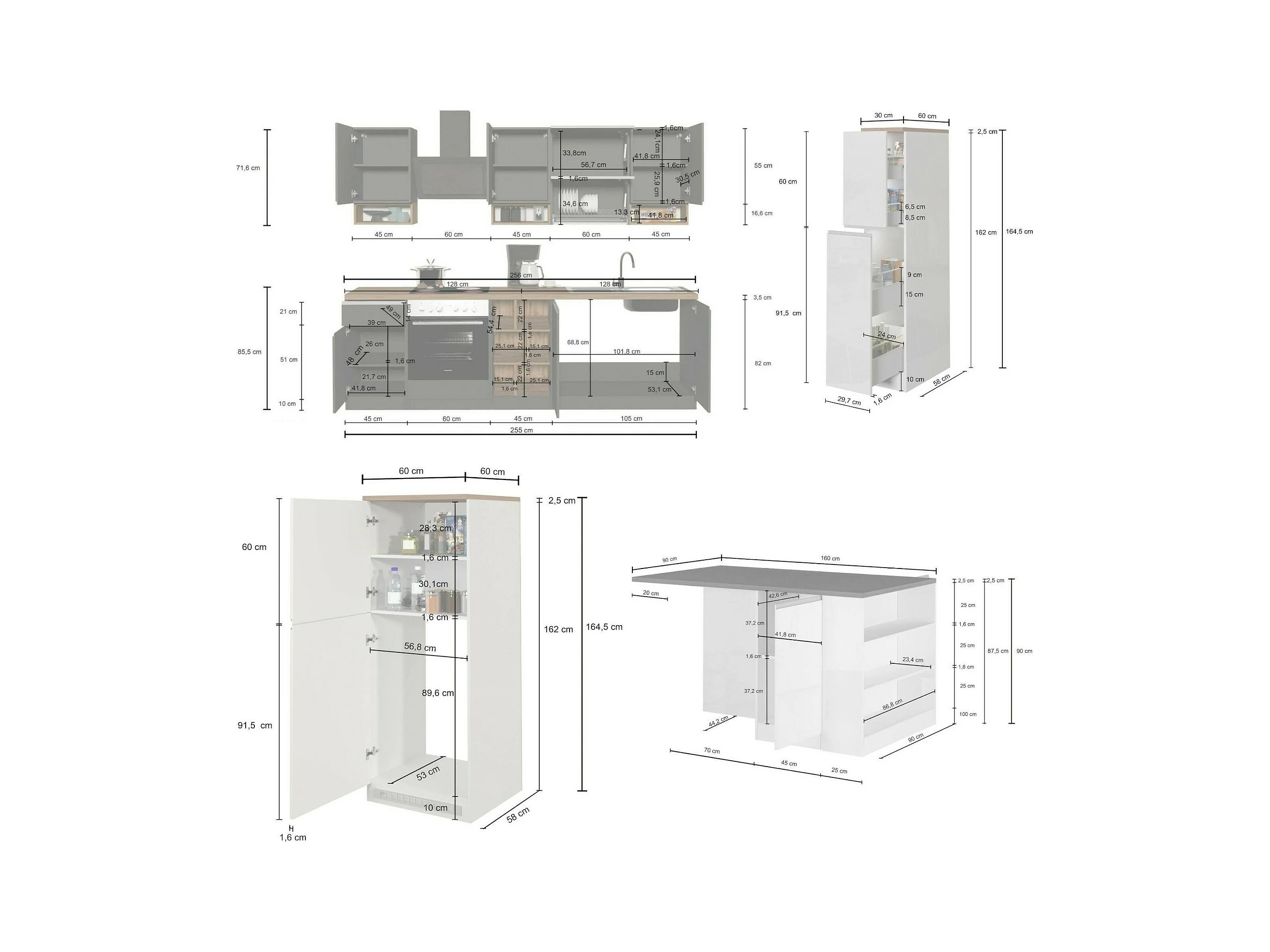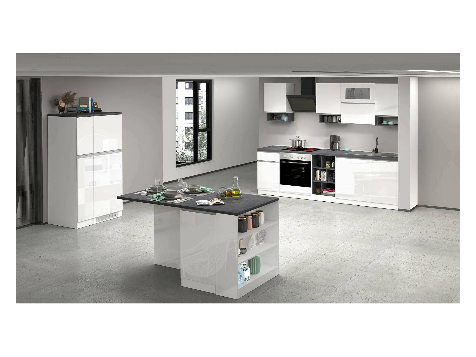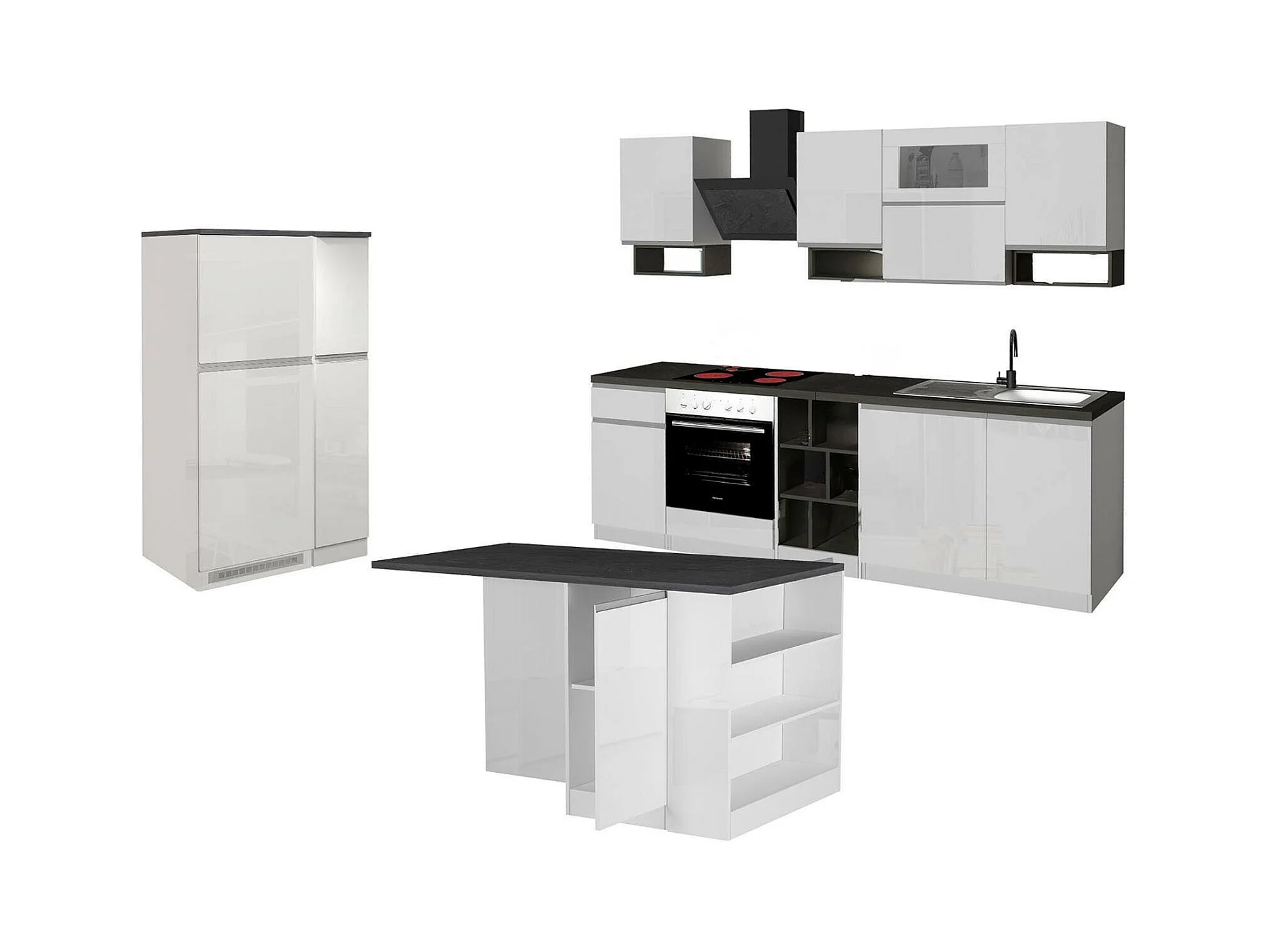 Dantenucc complete keuken, Set met bijkeuken, Keukenkast, Blokkit met eiland en koelkasthouder, 100% Made in Italy, Glanzend wit en leisteen