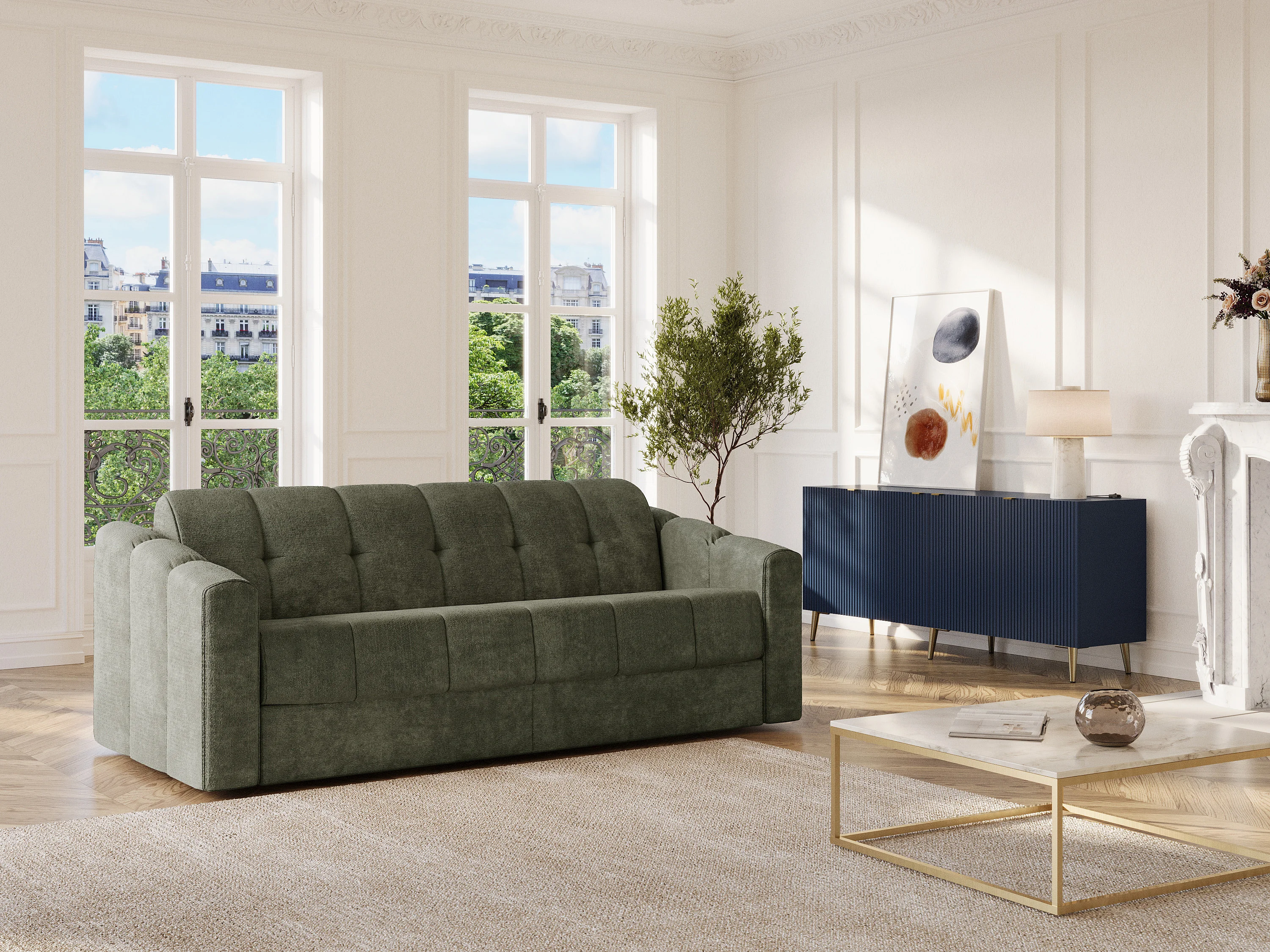 Driezitsslaapbank express van stof met textuur groen kaki - Bed met brede latten 140 cm - Matras 22 cm met traagschuim DARIELO