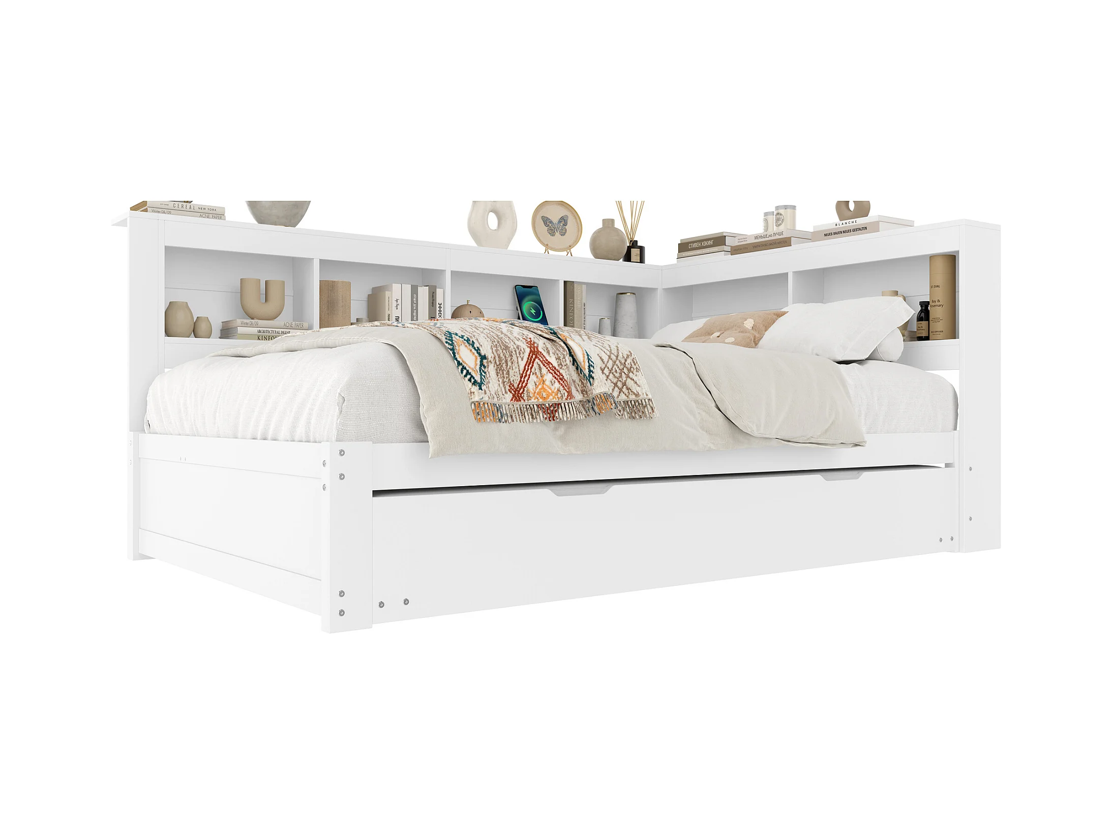 Daybed 140x200 cm, slaapbank met uitschuifbaar bed, met stopcontact en 2 USB-poorten, MDF en grenen frame, wit (219x167x90 cm)
