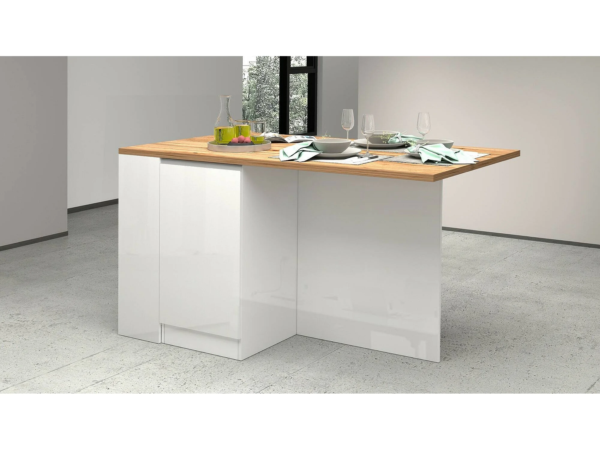 Dcannaval keukeneiland, Multifunctionele kledingkast, Keukenmeubel, Bijzettafel, 100% Made in Italy, 160x90h90 cm, Glanzend wit en eiken