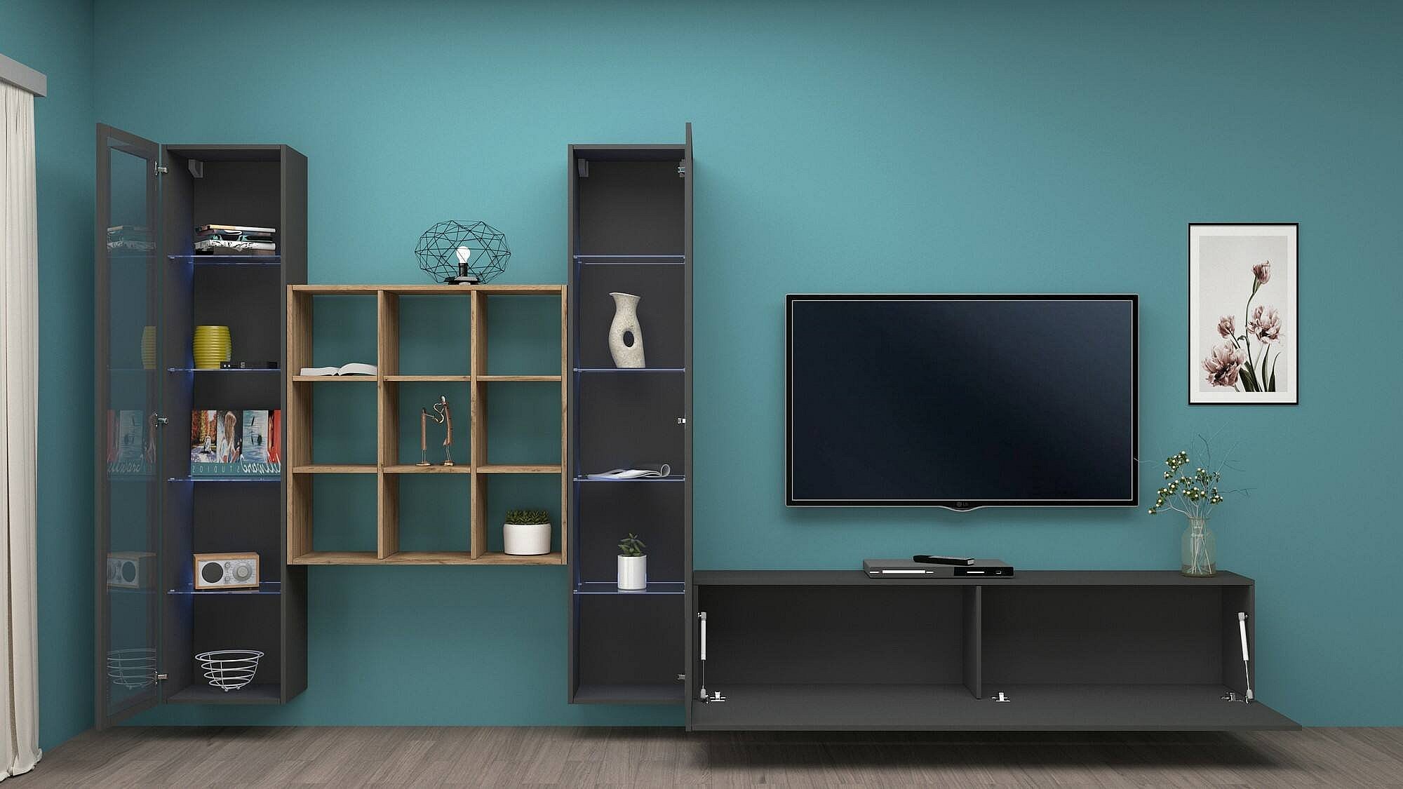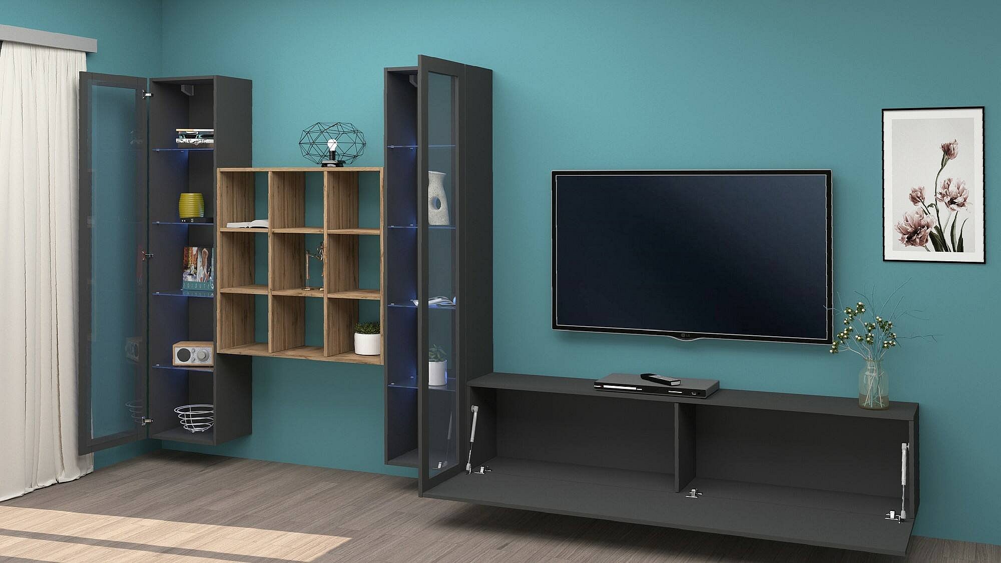 STRUCTUUR EN GEBRUIK - TV-meubel voor woonkamer bestaande uit een televisiestandaard onderstel, twee vitrines met draaideuren en een plank met meerdere planken - De keuze uit de verschillende meubelstukken waaruit deze woonkamercompositie bestaat, maken het ontwerp van dit meubel modern, functioneel en ruimtebesparend - Geïntegreerd blauw LED-verlichtingssysteem dat een vleugje klasse aan het product geeft - Naast de positionering van de tv kunt u de muur personaliseren met uw favoriete ornamenten die op de planken tentoongesteld blijven - De ruimte binnen de deuren is perfect voor het netjes opbergen van uw boeken, documenten, decoratieve voorwerpen of serviesgoed op een ordelijke en discrete manier - Perfecte woonkamerset om een â€
