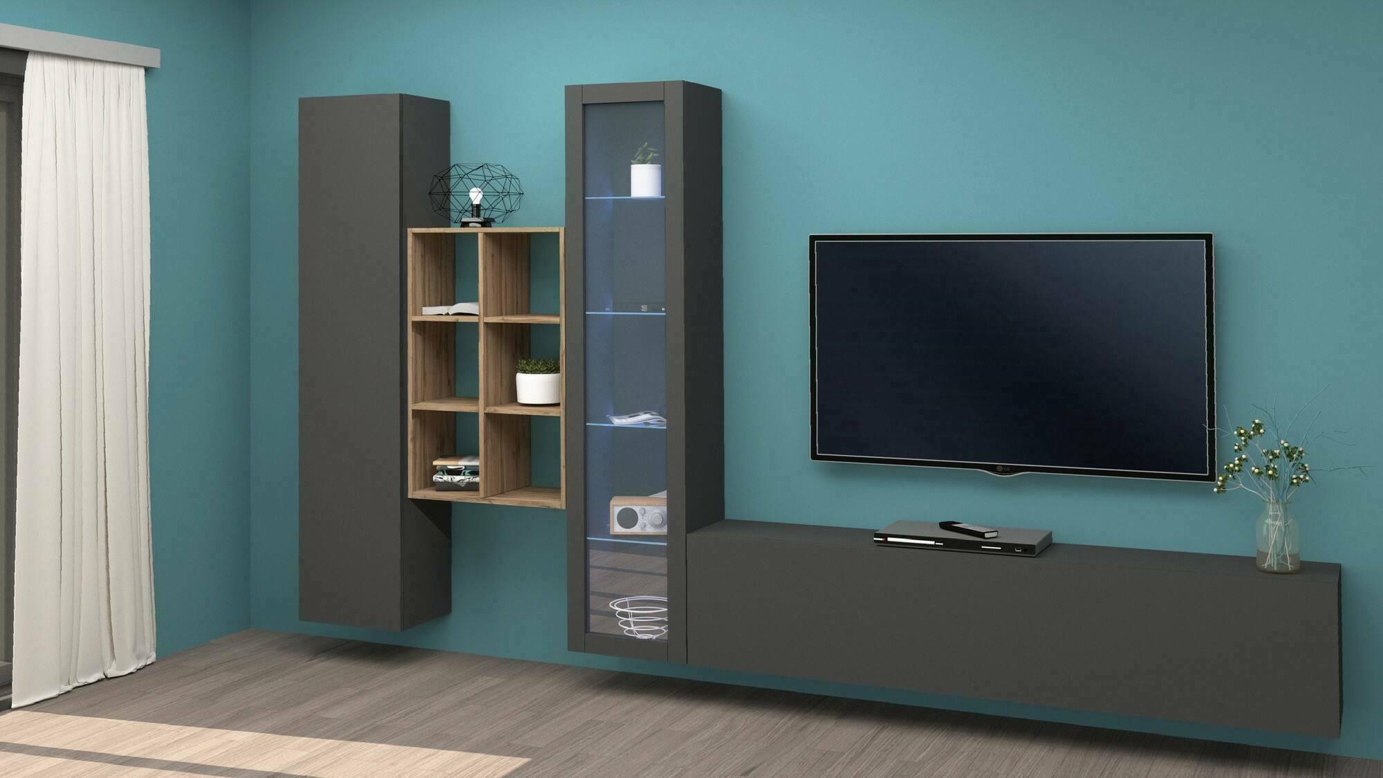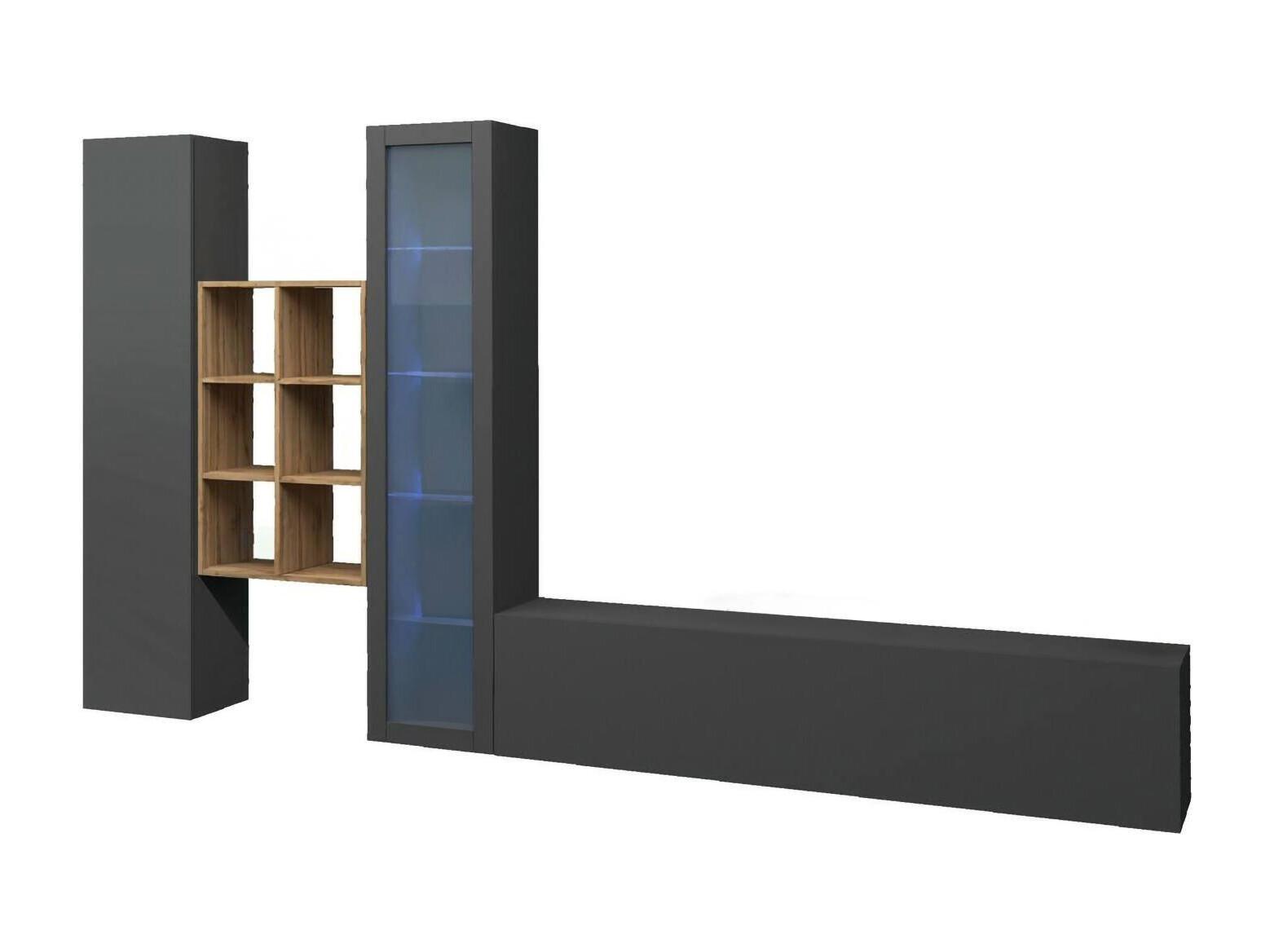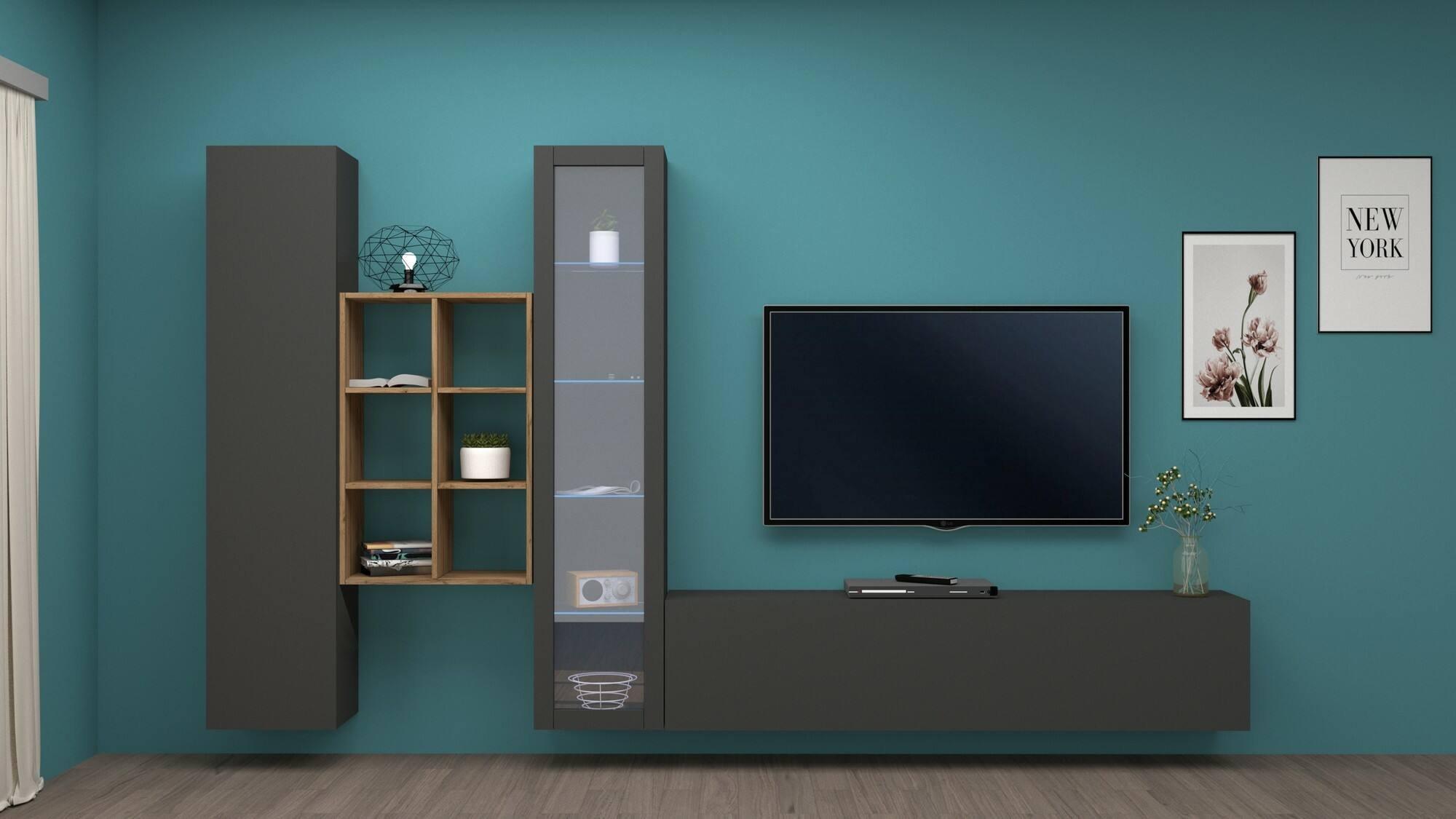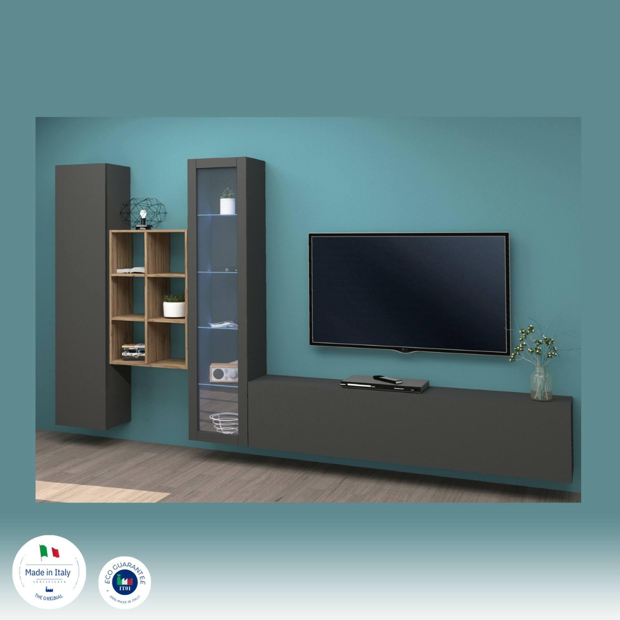 UITGERUSTE WALL - 3-deurs TV-meubel woonkamerset, Multifunctionele woonkamerkast met vitrine en LED-verlichting, 100% Made in Italy, 320x30h180 cm, Antraciet.