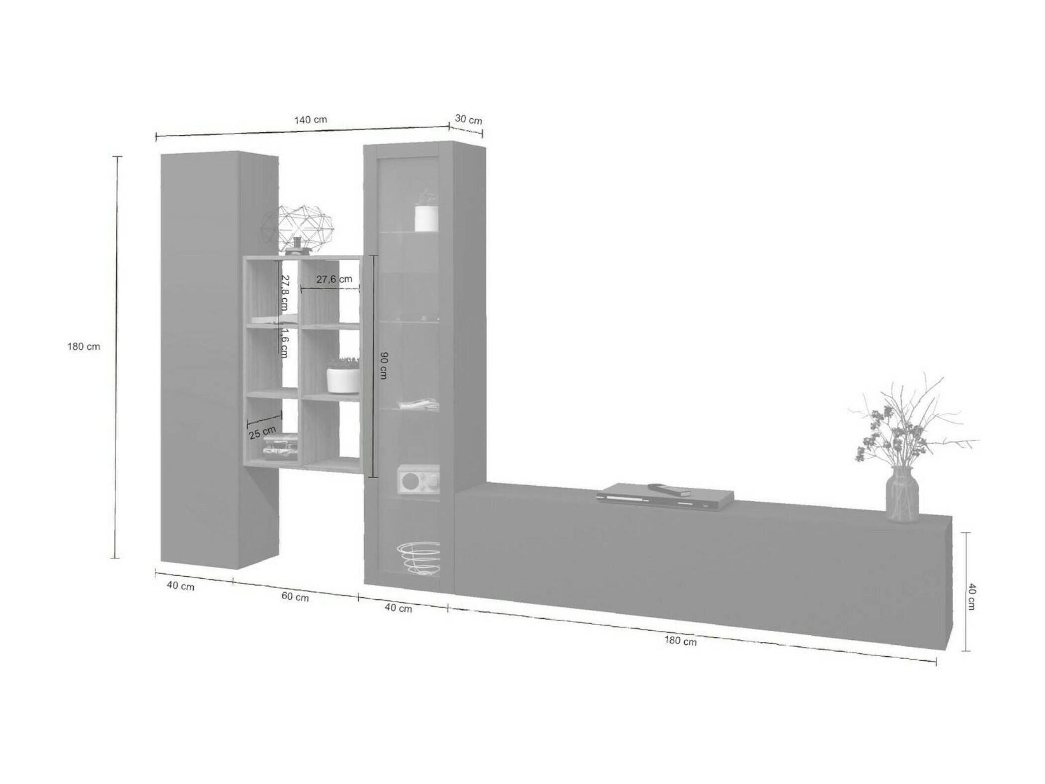 STRUCTUUR EN GEBRUIK - TV-meubel voor woonkamer bestaande uit een televisie onderstel, een kolomkast, een vitrine met draaideuren en een plank - De keuze uit de verschillende meubelstukken waaruit deze woonkamercompositie bestaat, maken het ontwerp van dit meubel modern, functioneel en ruimtebesparend - Geïntegreerde blauwe LED verlichtingssysteem dat een vleugje klasse aan het product geeft - Naast de positionering van de tv kunt u de muur personaliseren met uw favoriete ornamenten die op de planken tentoongesteld blijven - De ruimte binnen de deuren en de plank is perfect om netjes op te bergen uw boeken, documenten en decoratieve voorwerpen of serviesgoed op een ordelijke en discrete manier - Perfecte woonkamerset om een â€
