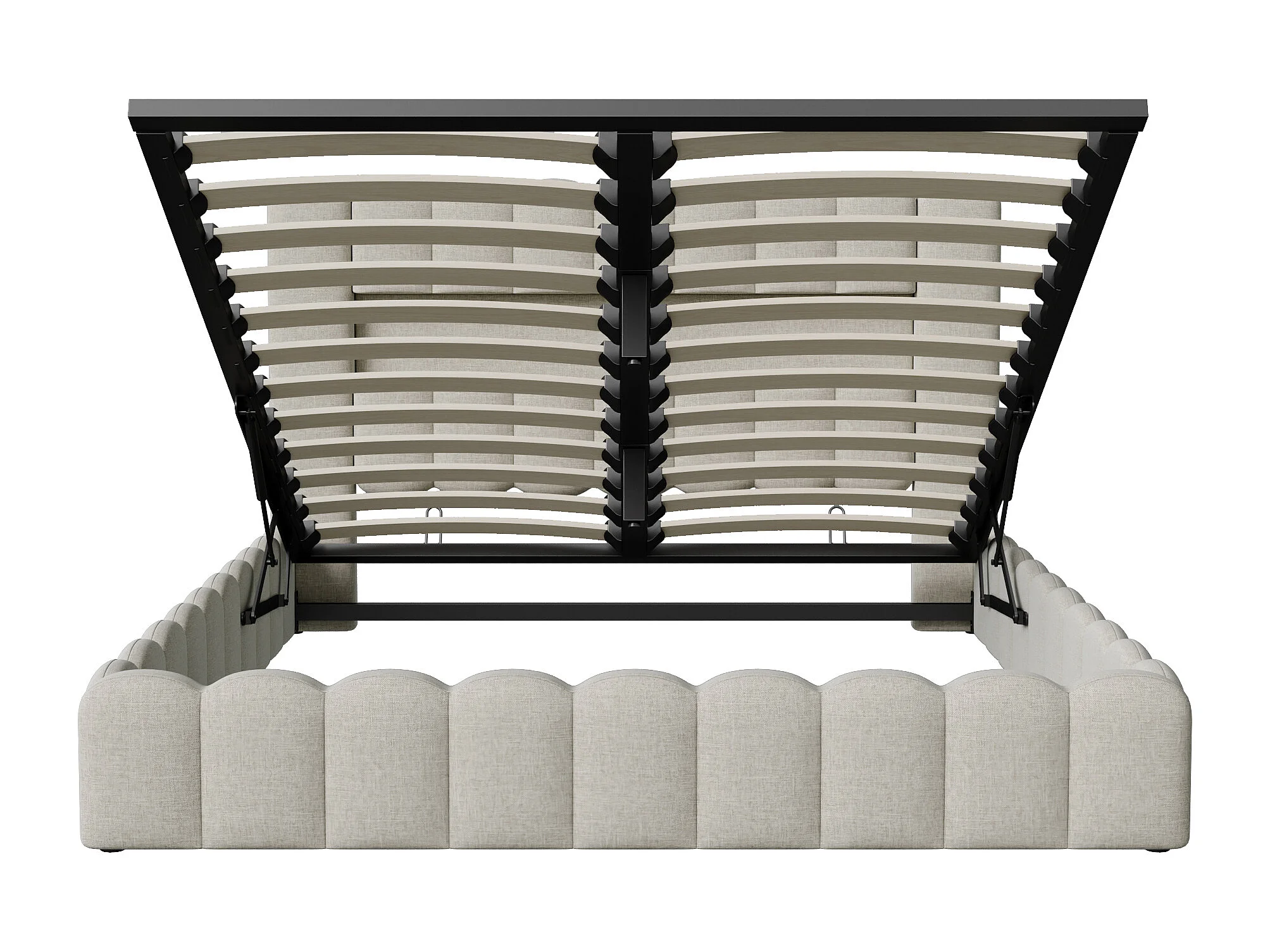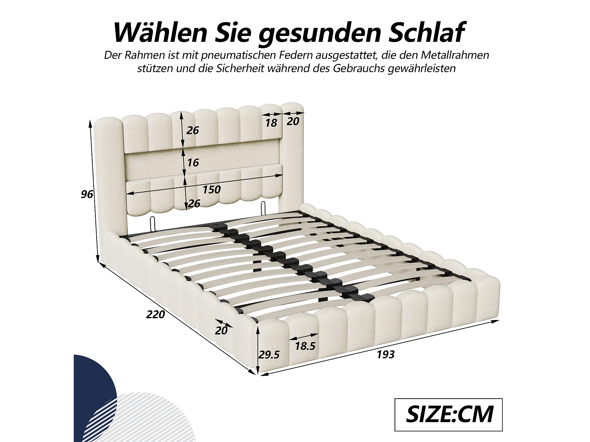 Designbed met opbergruimte in beige boomstamstof met hydraulische steunen, RGB LED-hoofdbord en USB/Type-C-aansluitingen – 180x200 cm