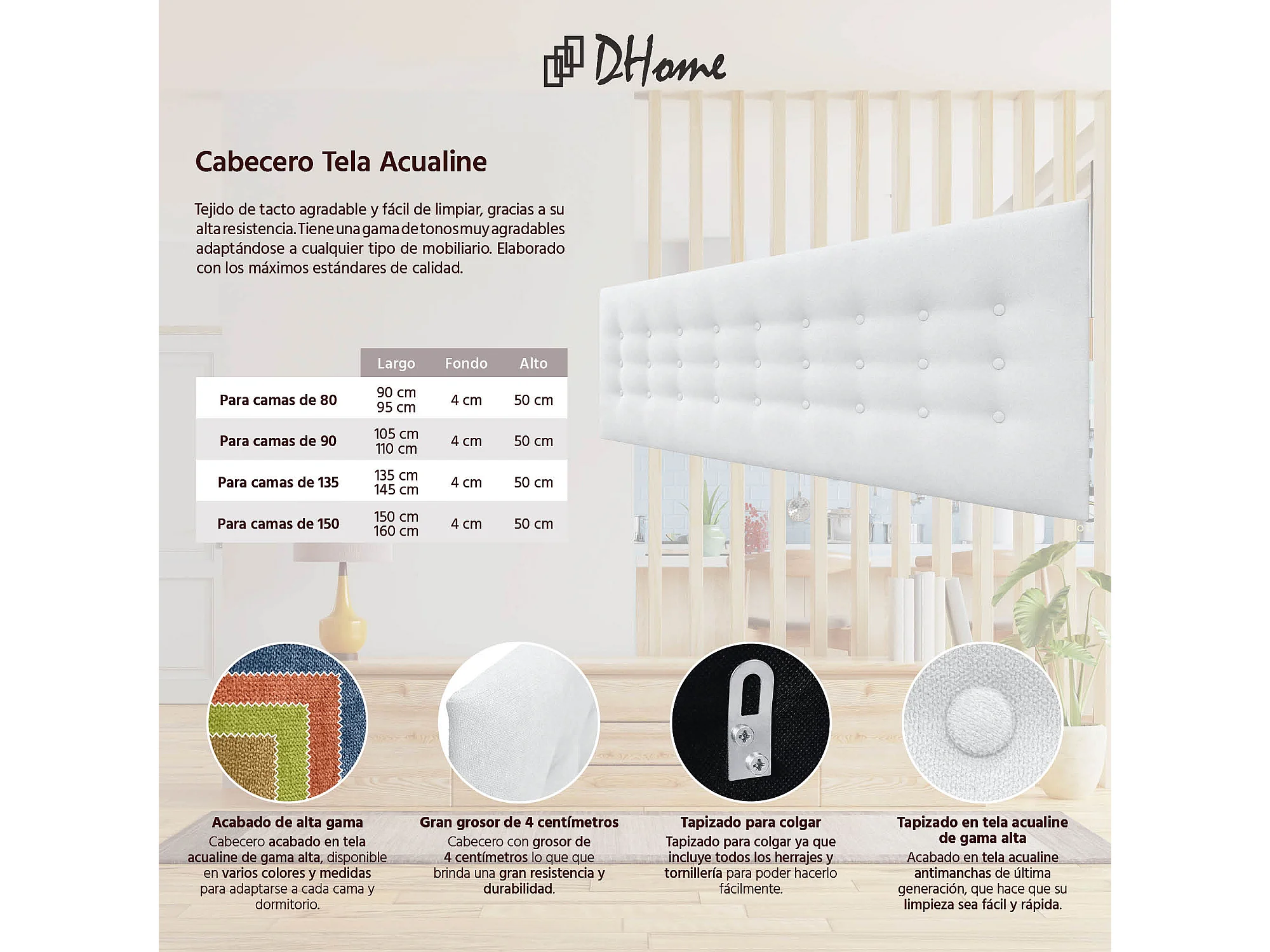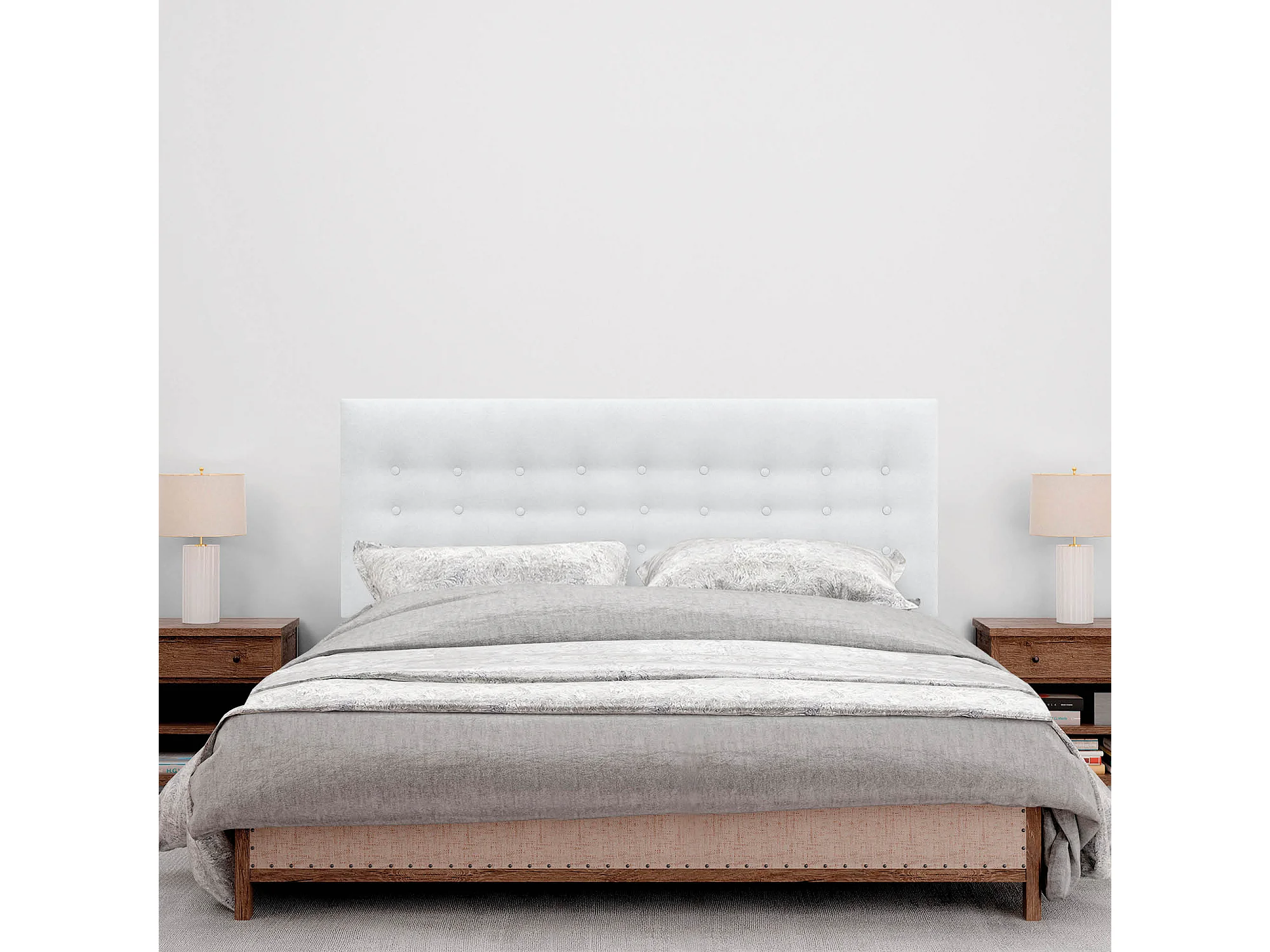 DHOME Hoofdbord de stof ACUALINE met 3 rijen knopen gepolsterd luxe hoofdbord voor bed (Blanco, 145cm)