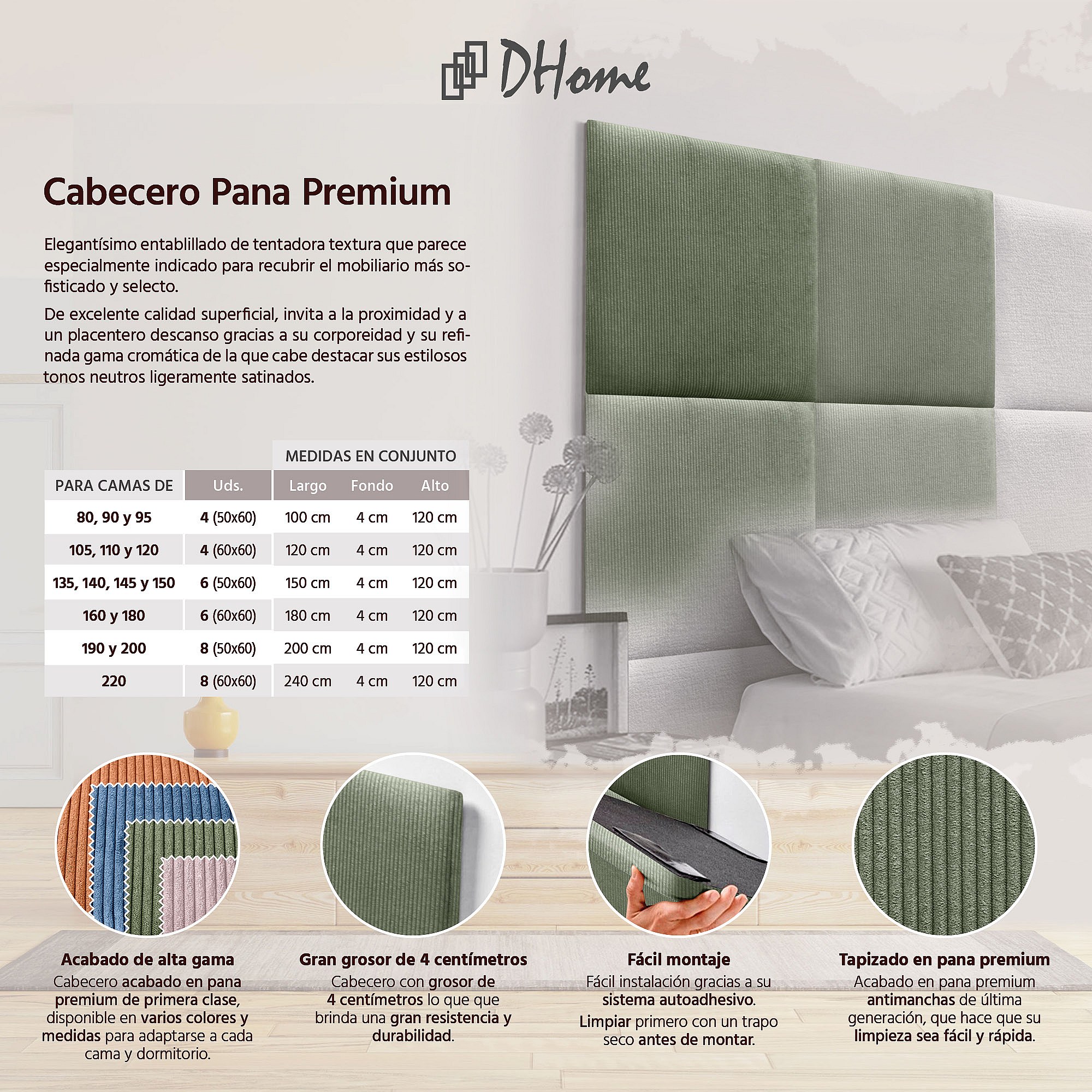 DHOME Premium Corduroy gestoffeerd hoofdeinde samengesteld uit verwisselbare zelfklevende panelen Luxe slaapkamer opgevuld (Jungle Green,180cm)