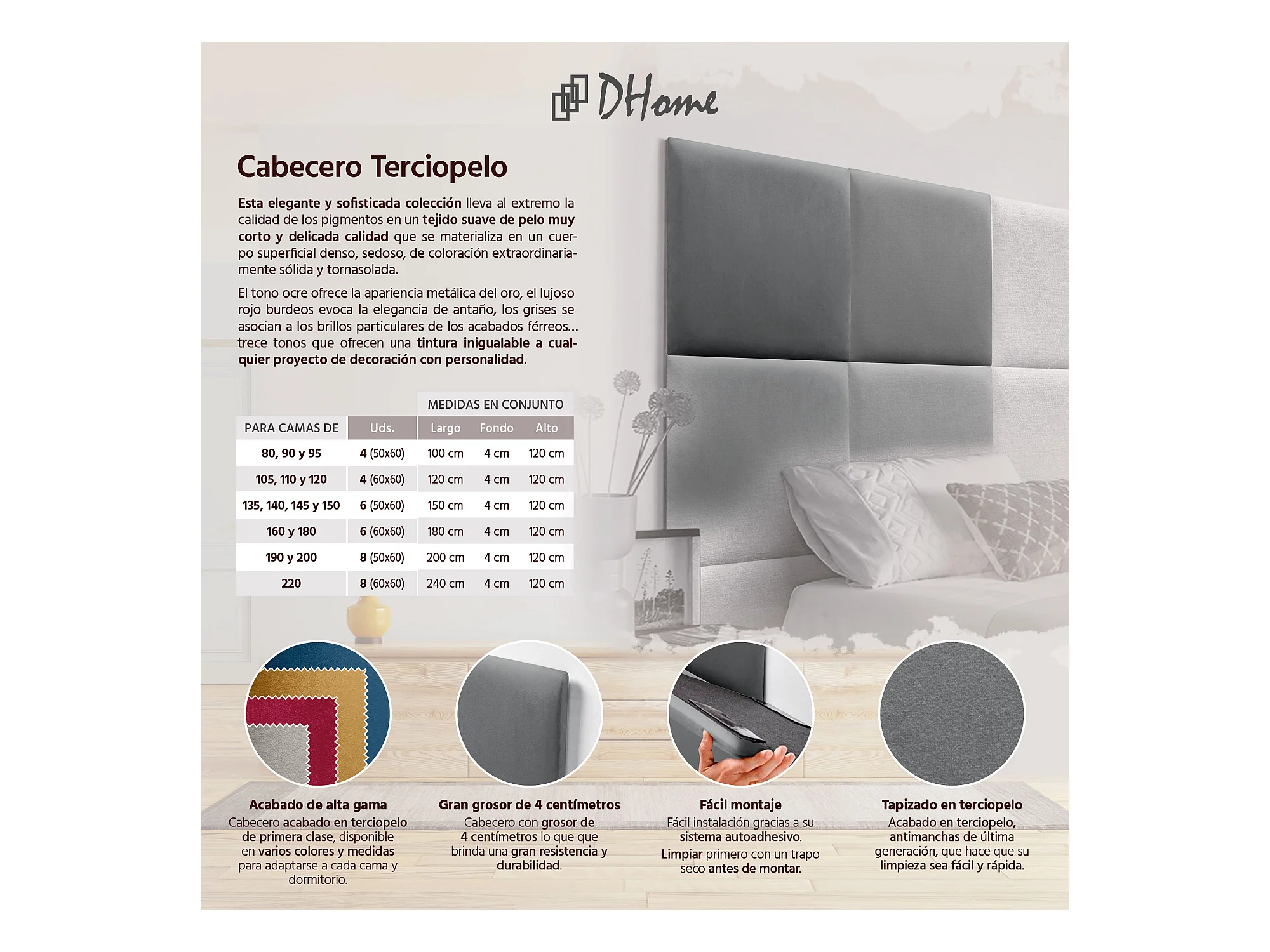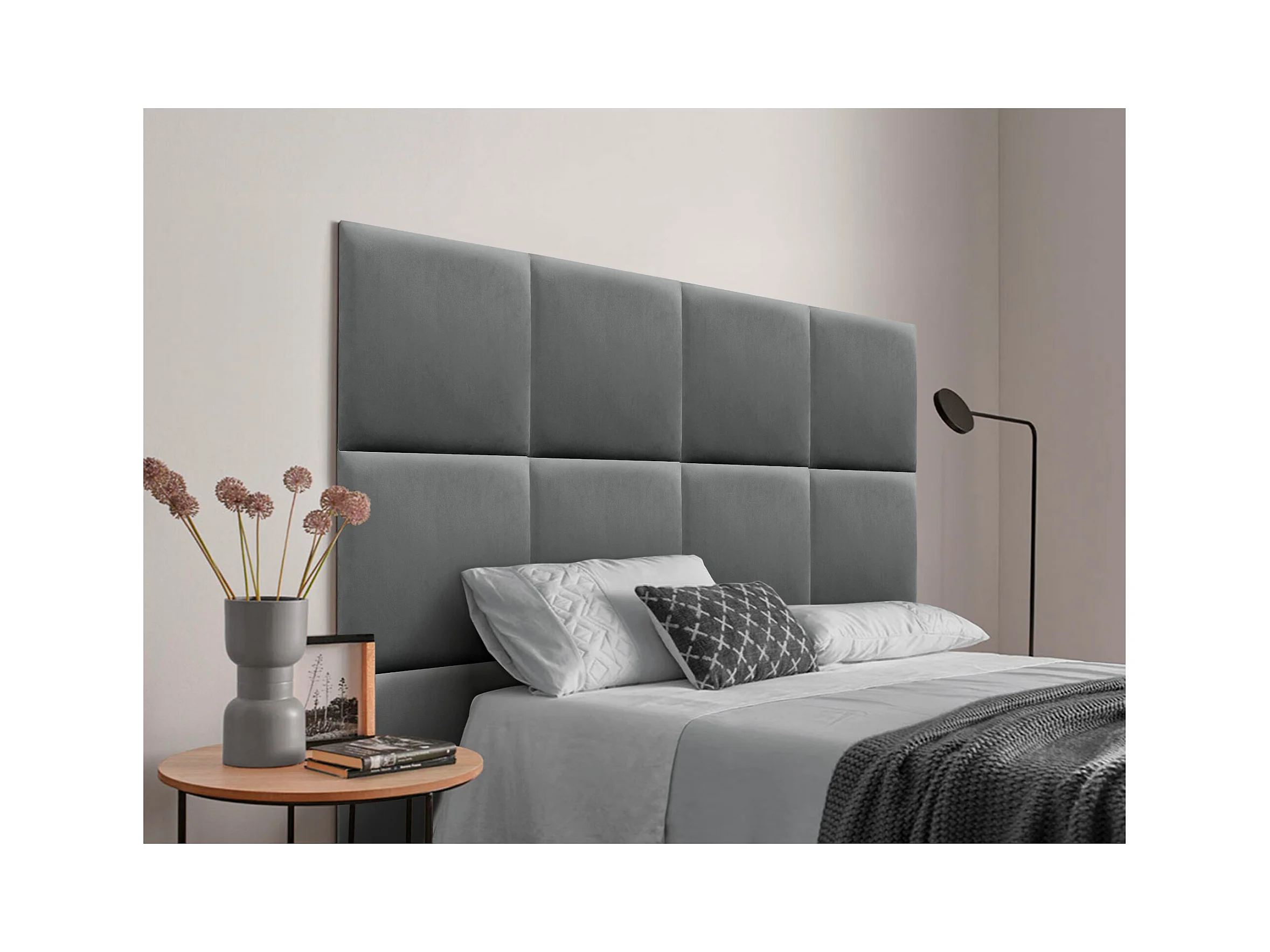 DHOME Premium fluwelen gestoffeerd hoofdeinde samengesteld uit verwisselbare zelfklevende panelen Luxe slaapkamer opgevuld (asgrijs, 95cm)