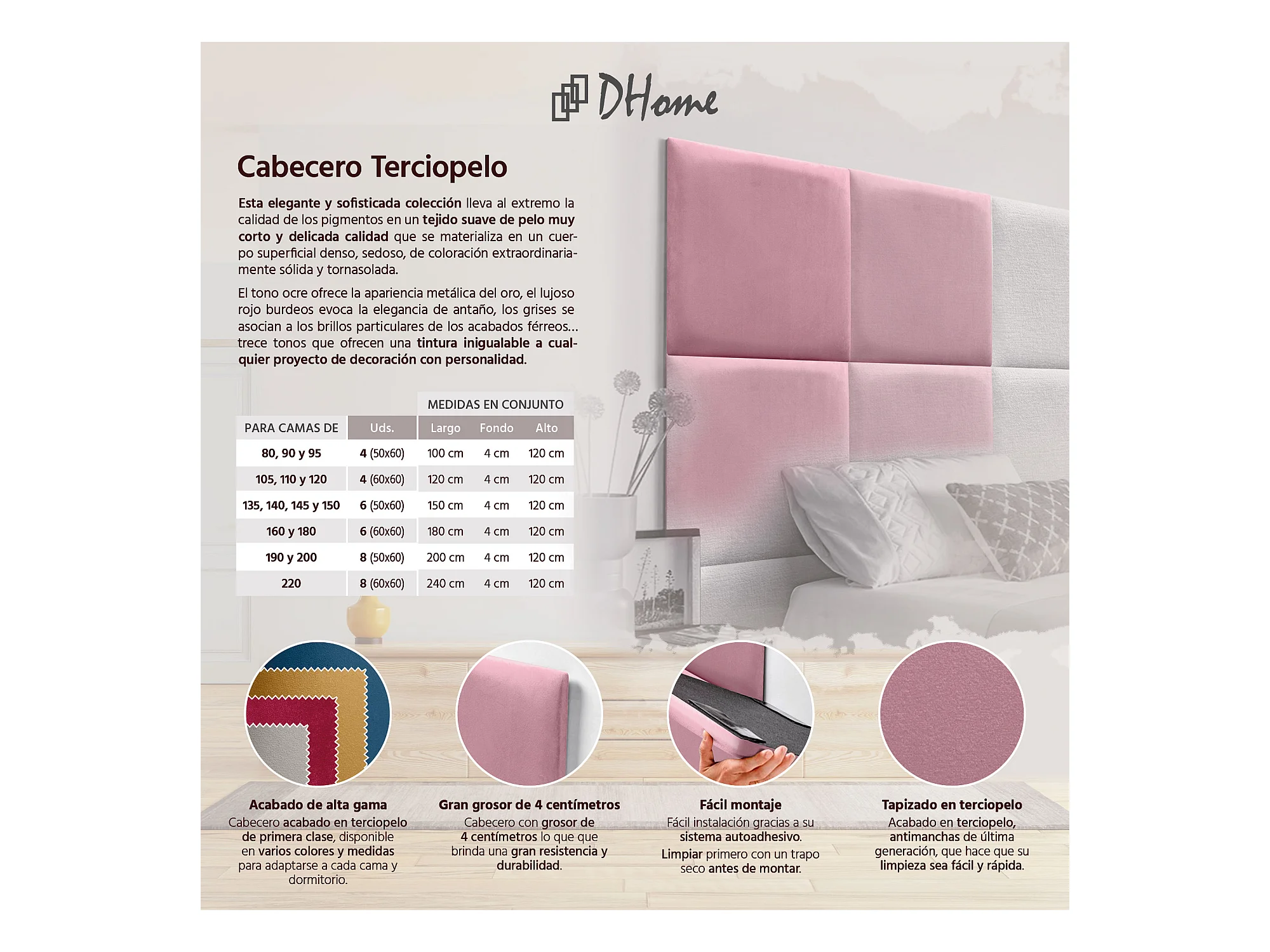 DHOME Premium fluwelen gestoffeerd hoofdeinde samengesteld uit verwisselbare zelfklevende panelen Luxe slaapkamer opgevuld (roze, 105cm)
