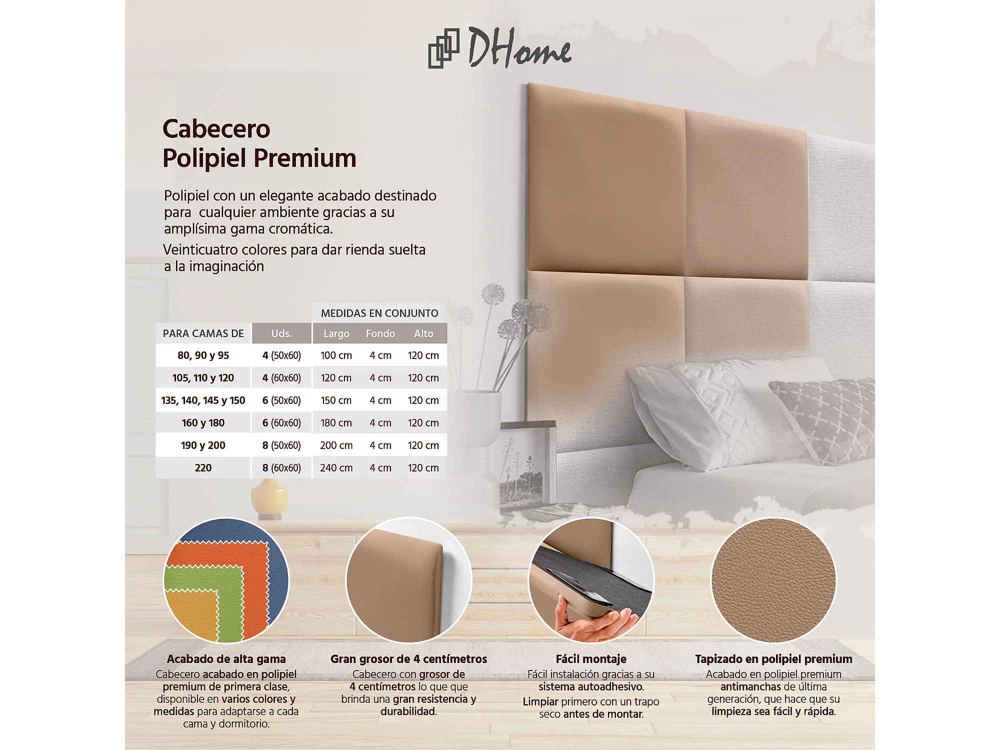 DHOME Premium Kunstlederen Hoofdbord Gemaakt van Verwisselbare Zelfklevende Panelen Luxe Gewatteerde Slaapkamer (Lichtbruin, 150cm)