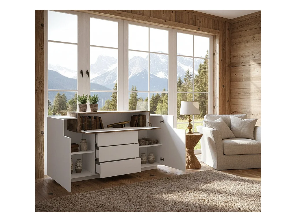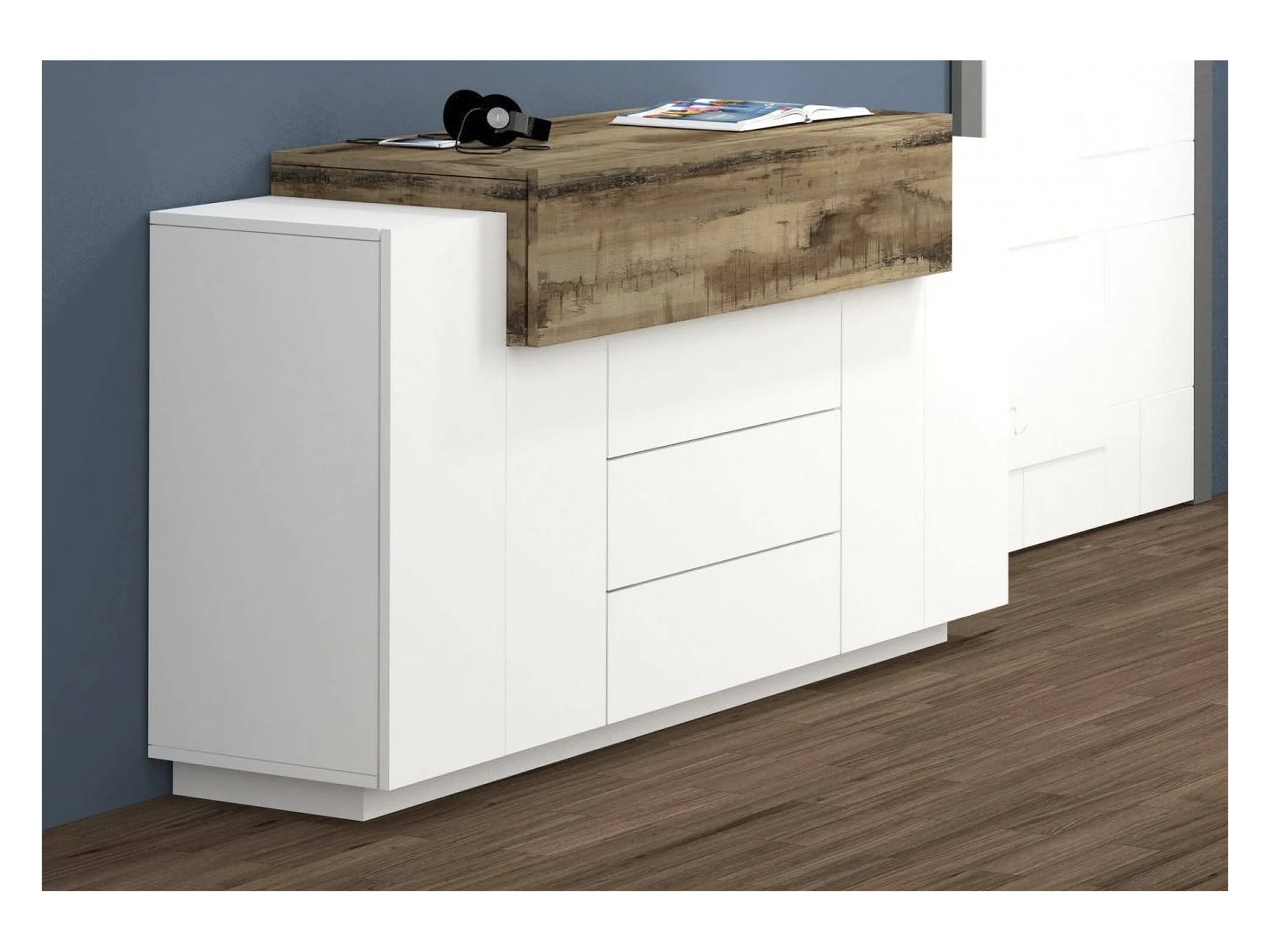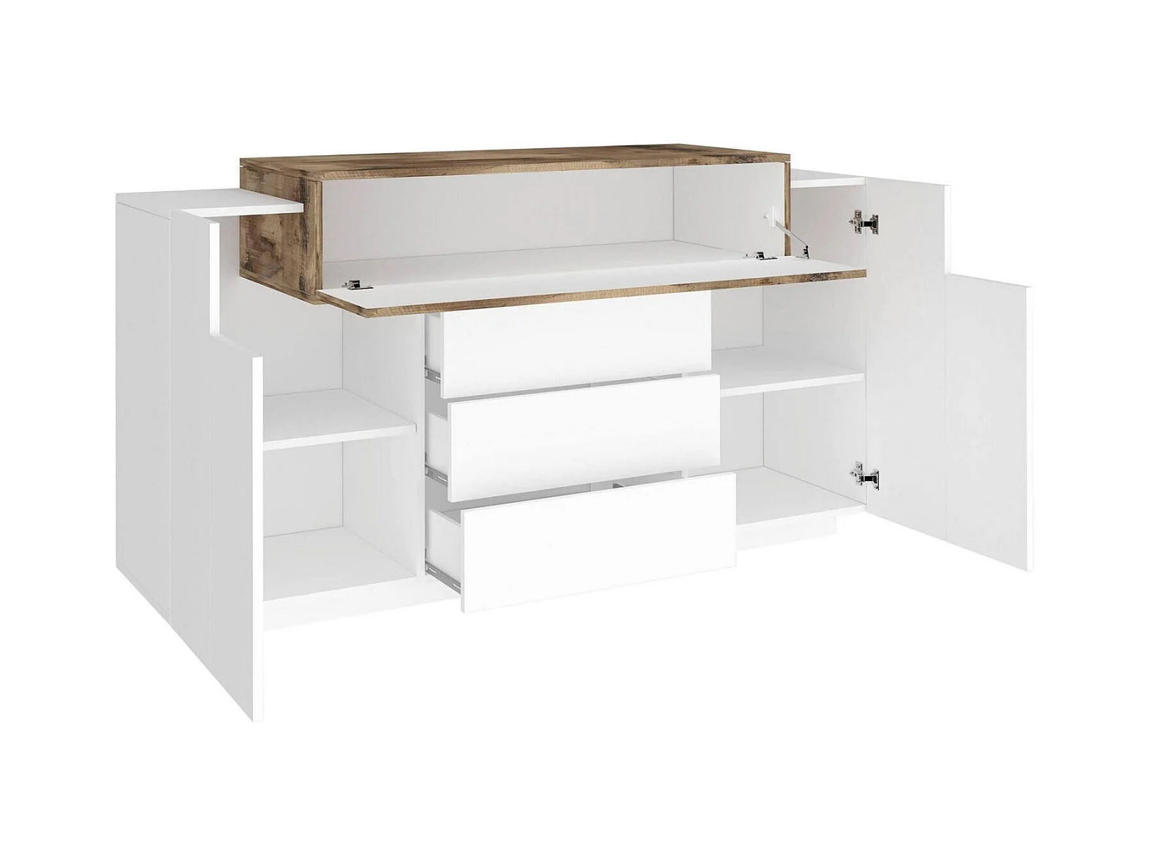 Dismajl Dressoir, Keukendressoir met 3 deuren en 3 laden, Woonkamerbuffet, 100% Made in Italy, 160x45h86 cm, Glanzend wit en esdoorn