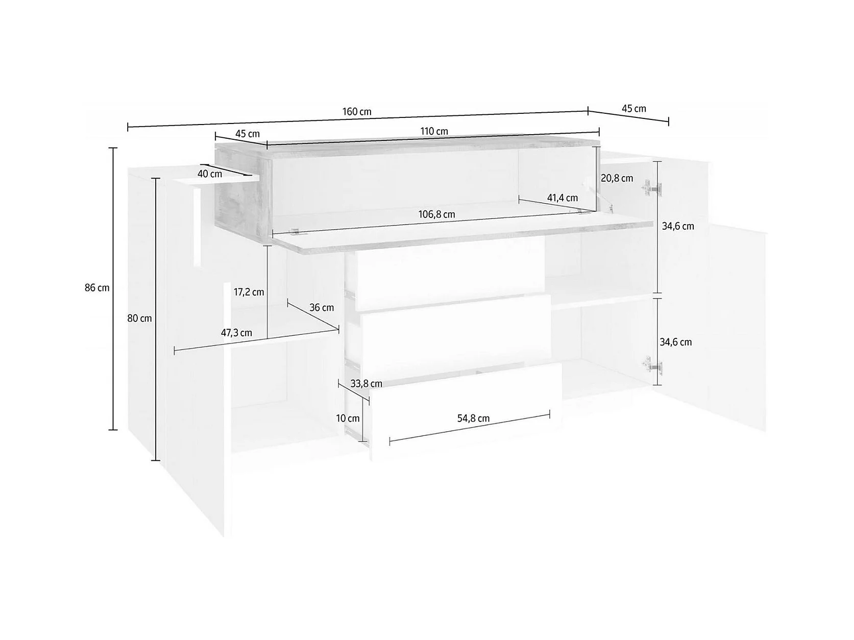 Dlenz dressoir, 4-deurs keukendressoir, Woonkamerbuffet, 100% Made in Italy, 160x45h86 cm, Glanzend wit en beton