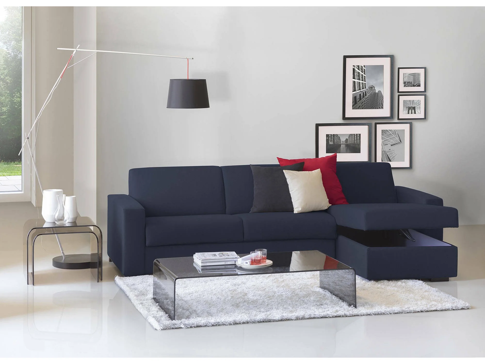 Divano fisso con penisola in tessuto blu 280x95h90 cm