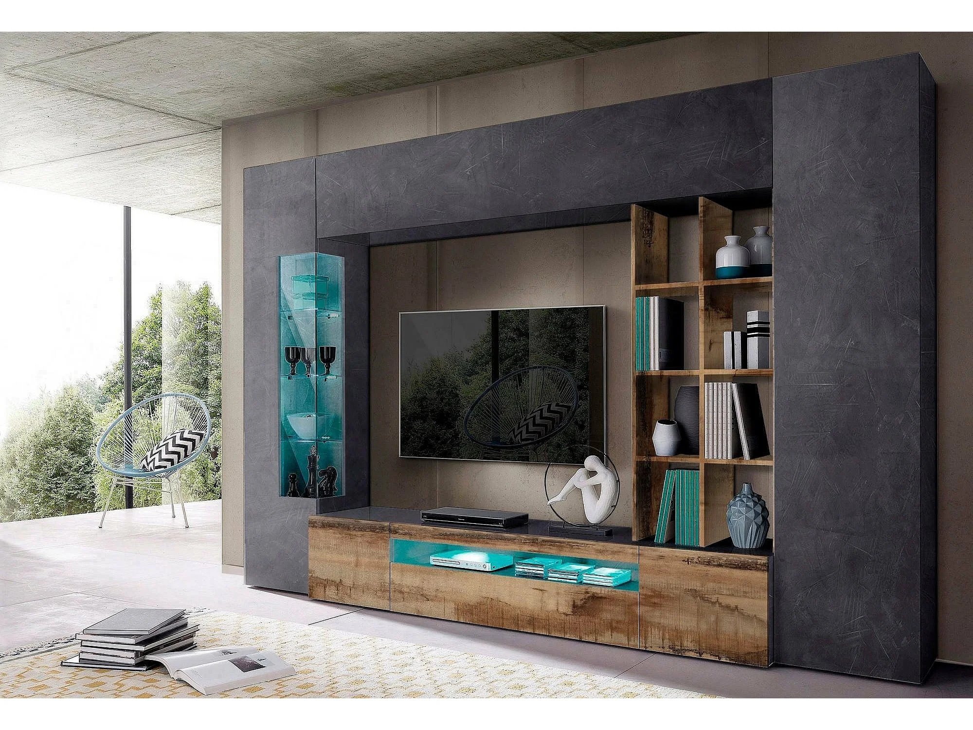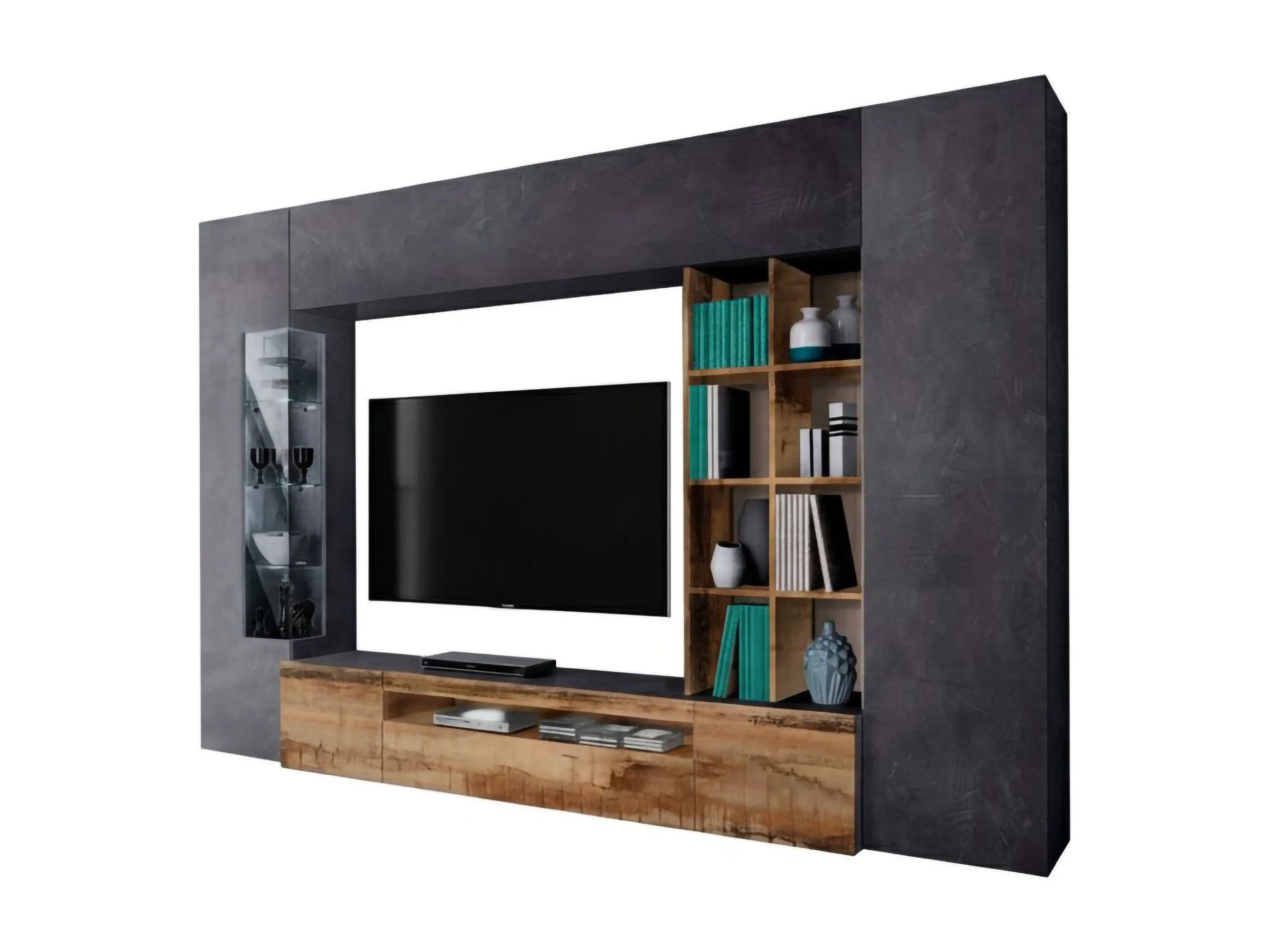 Dlazzar wandsysteem, TV-meubel woonkamerset, Multifunctioneel woonkamermeubilair met LED-licht, 100% Made in Italy, 290x40h192 cm, Leisteen en Esdoorn