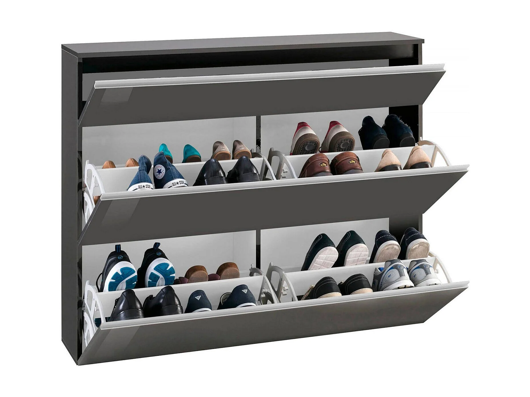 Dlukak schoenenrek, Multifunctionele kast met 2 deuren en 1 klepdeur, Ingang schoenenrek, 100% Made in Italy, 120x27h108 cm, Glanzend antraciet