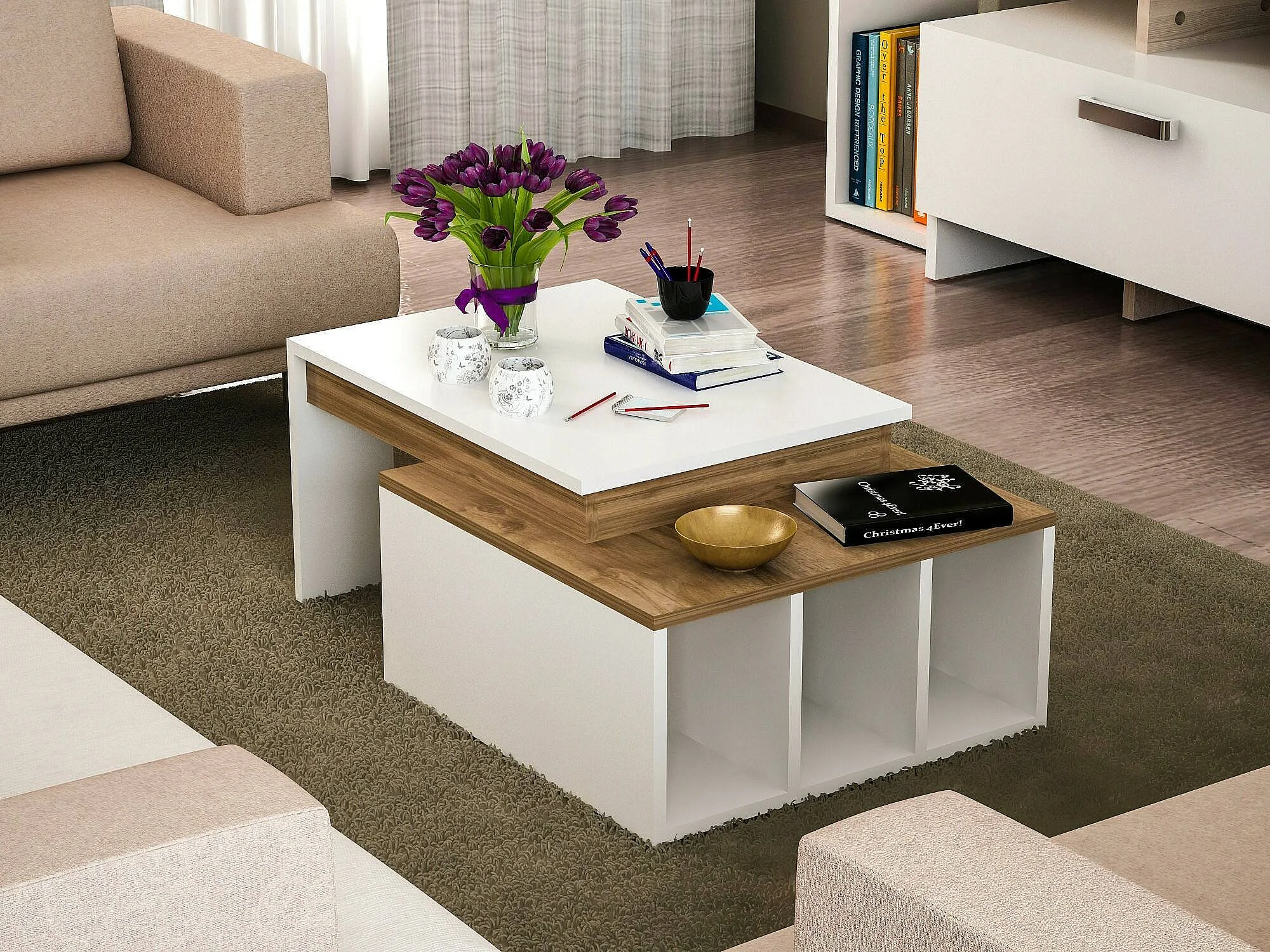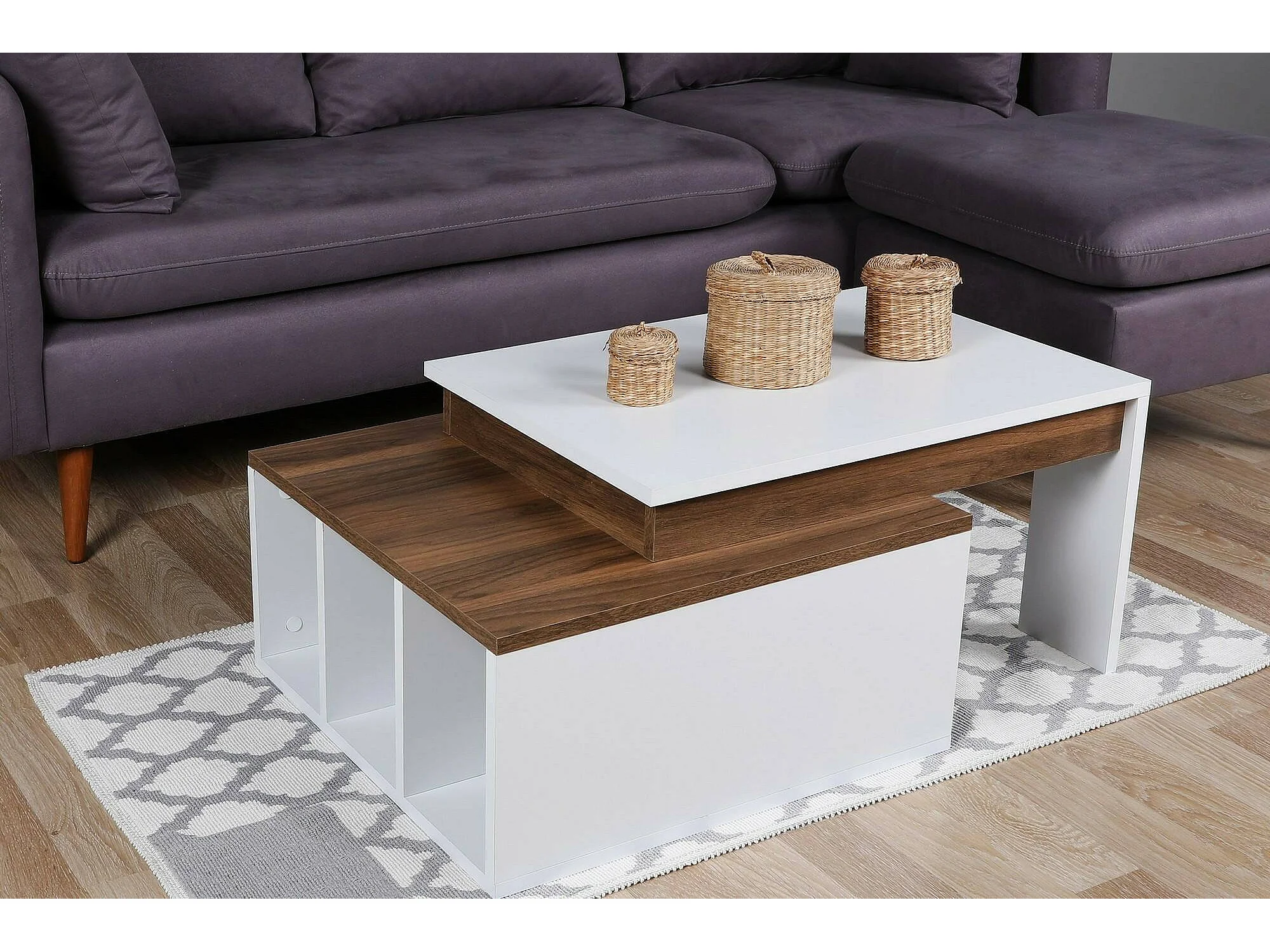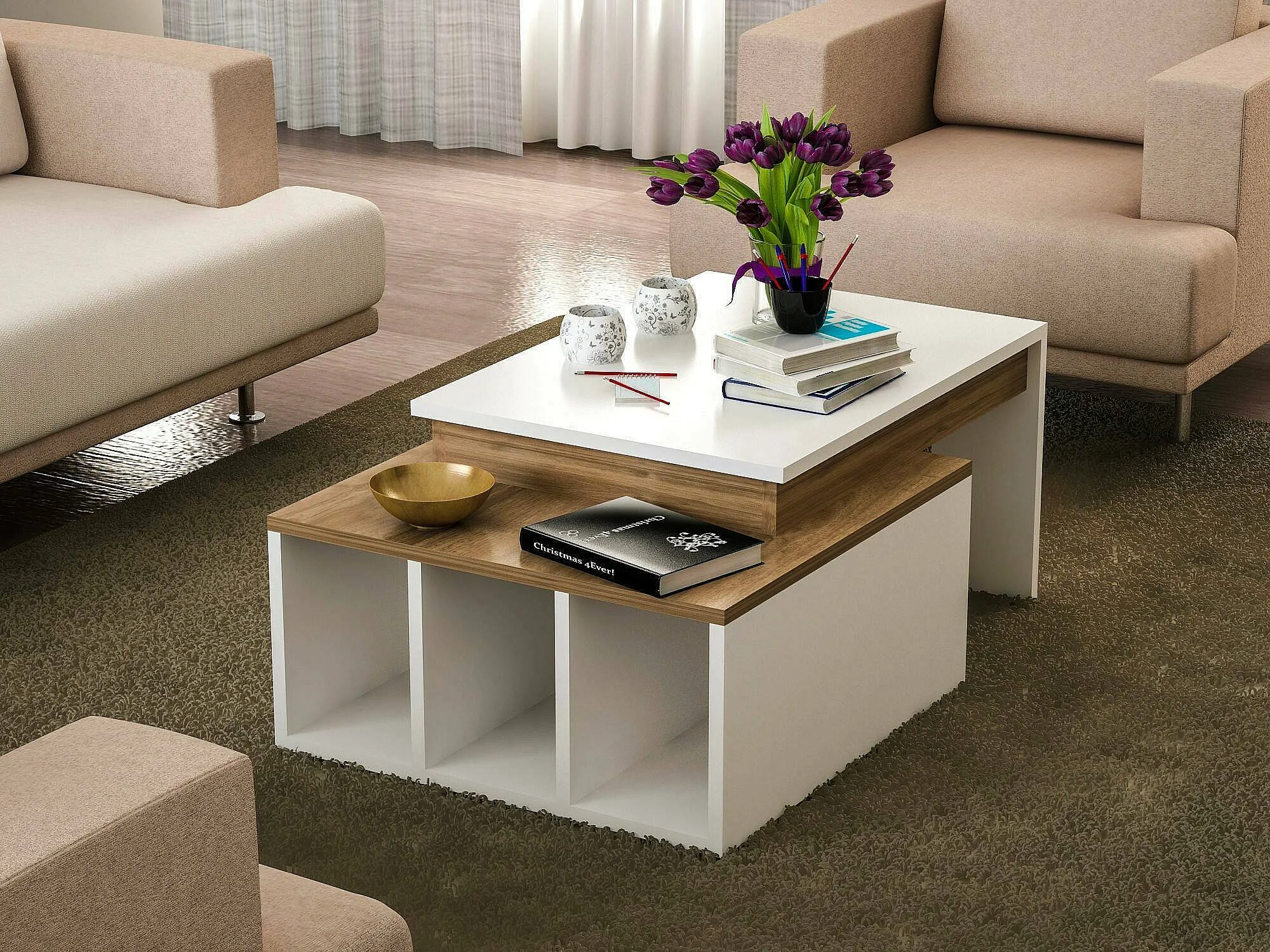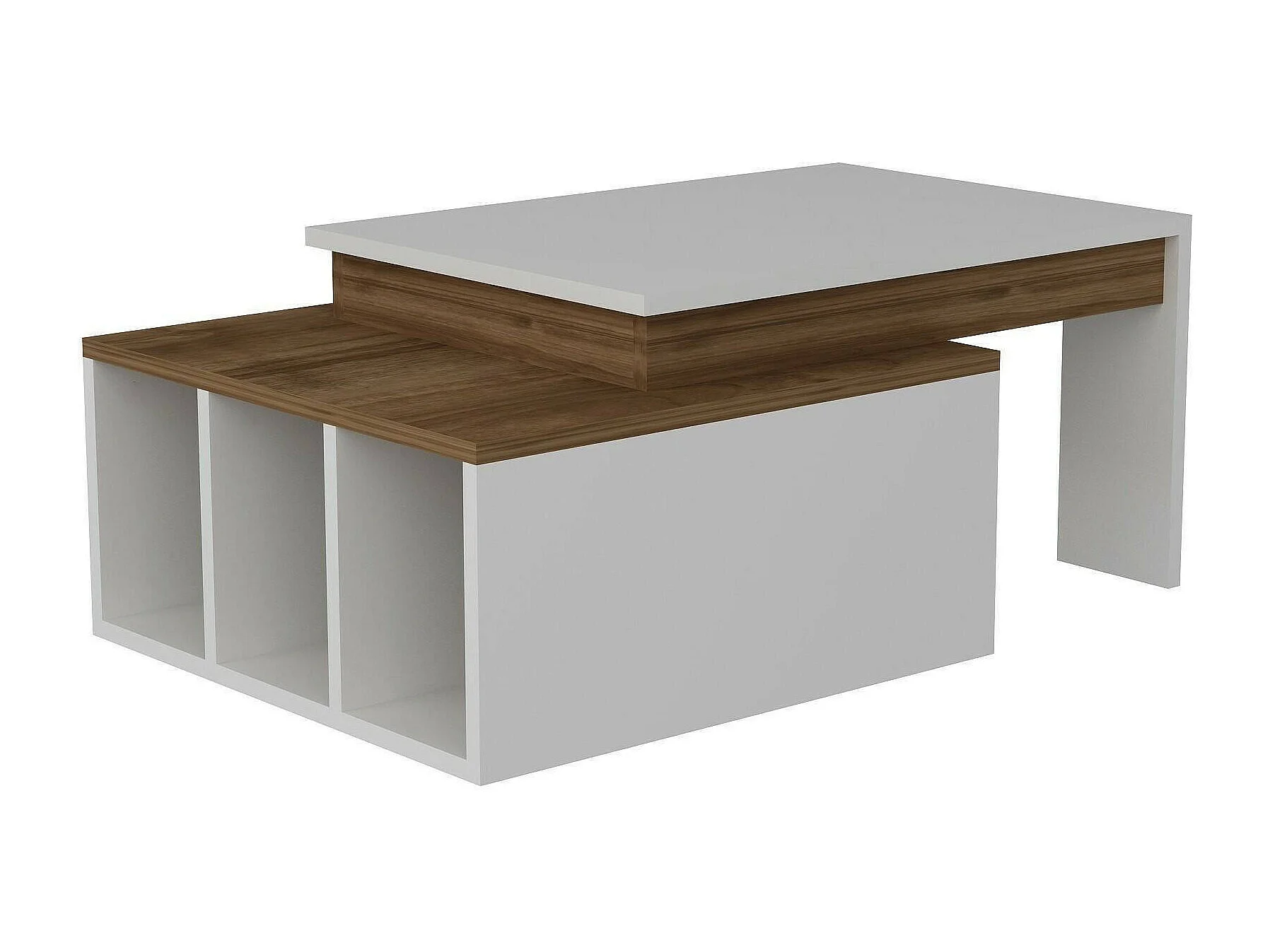 Dmckenni-stafeltafel, Koffietafel, Slaaptafelhouder, Tafelplank, 90x60h37 cm, Wit en walnoot