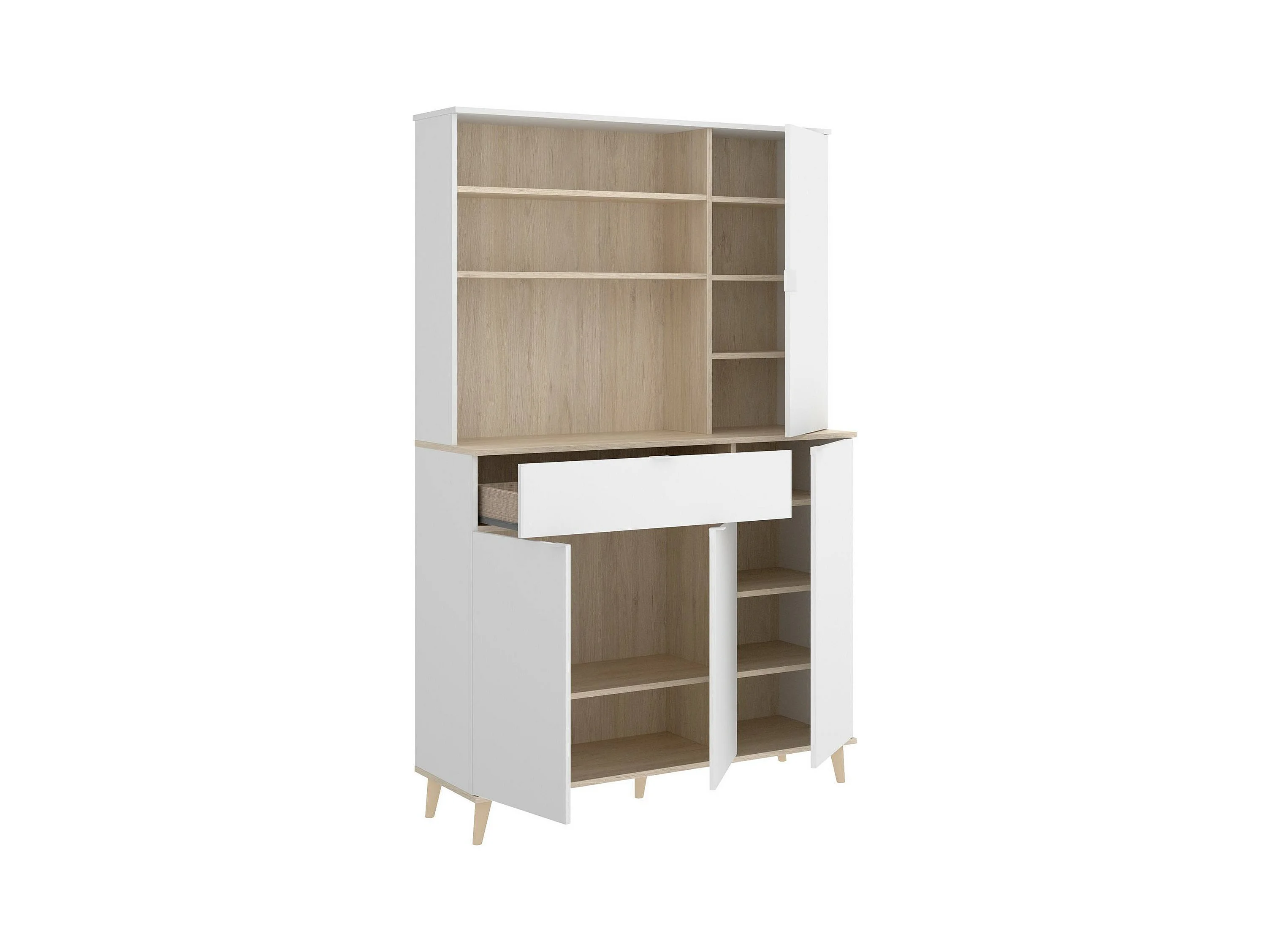 Dmere Dressoir, Woonkamerkastbuffet, Modern woonkamerdressoir met 4 deuren, 120x40h191 cm, Wit en Eiken
