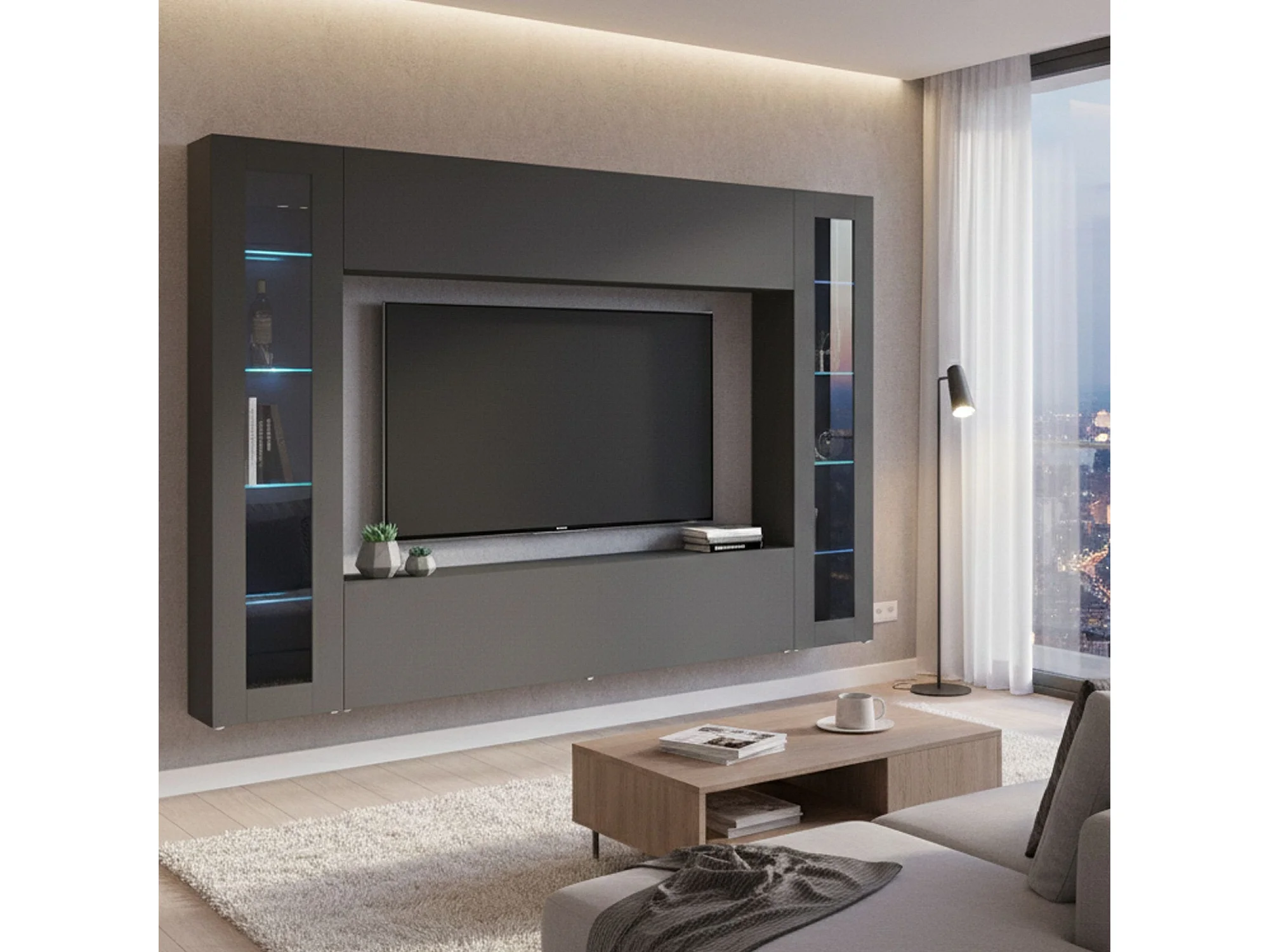 Dmora Wandmeubel Giuliano 30x260x180h cm Zwart Antraciet 11 Planken Kantel- en Klapdeuren, 4 Deuren Made in Italy