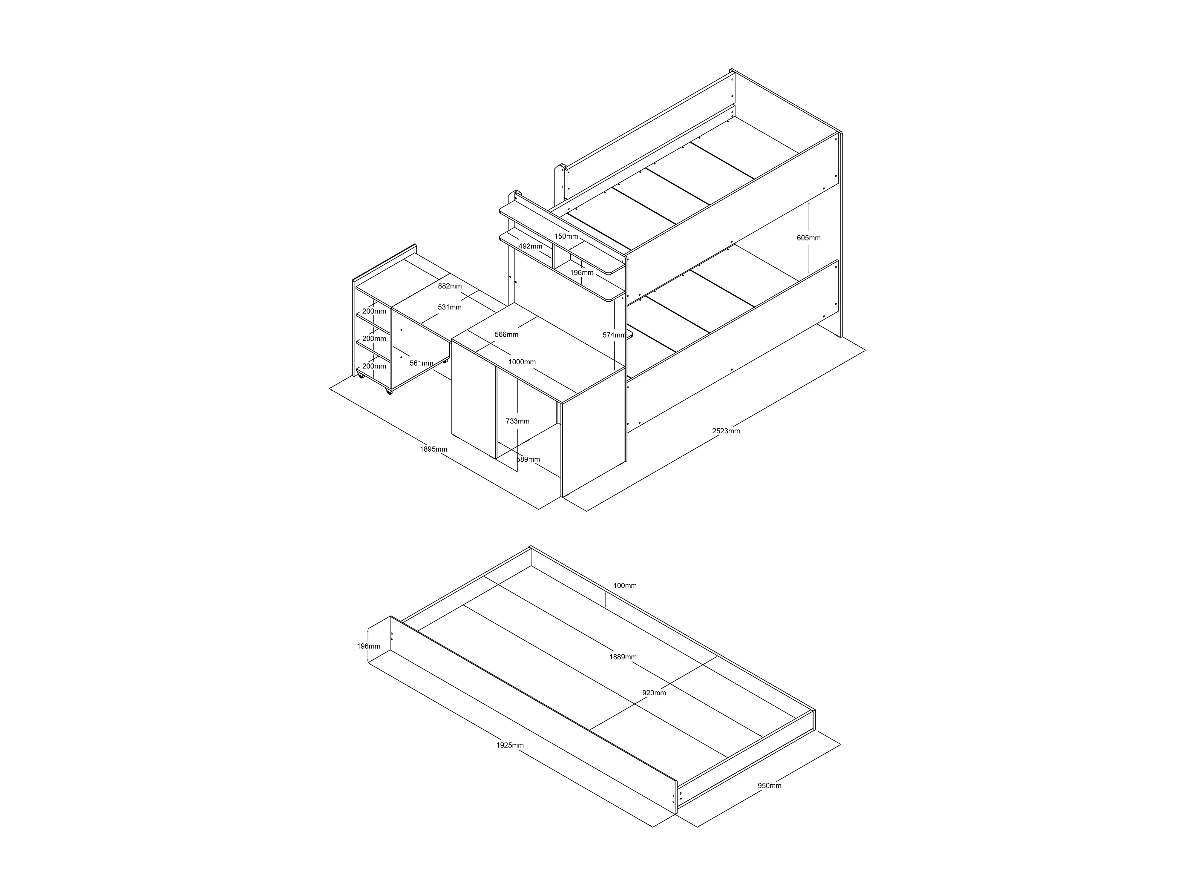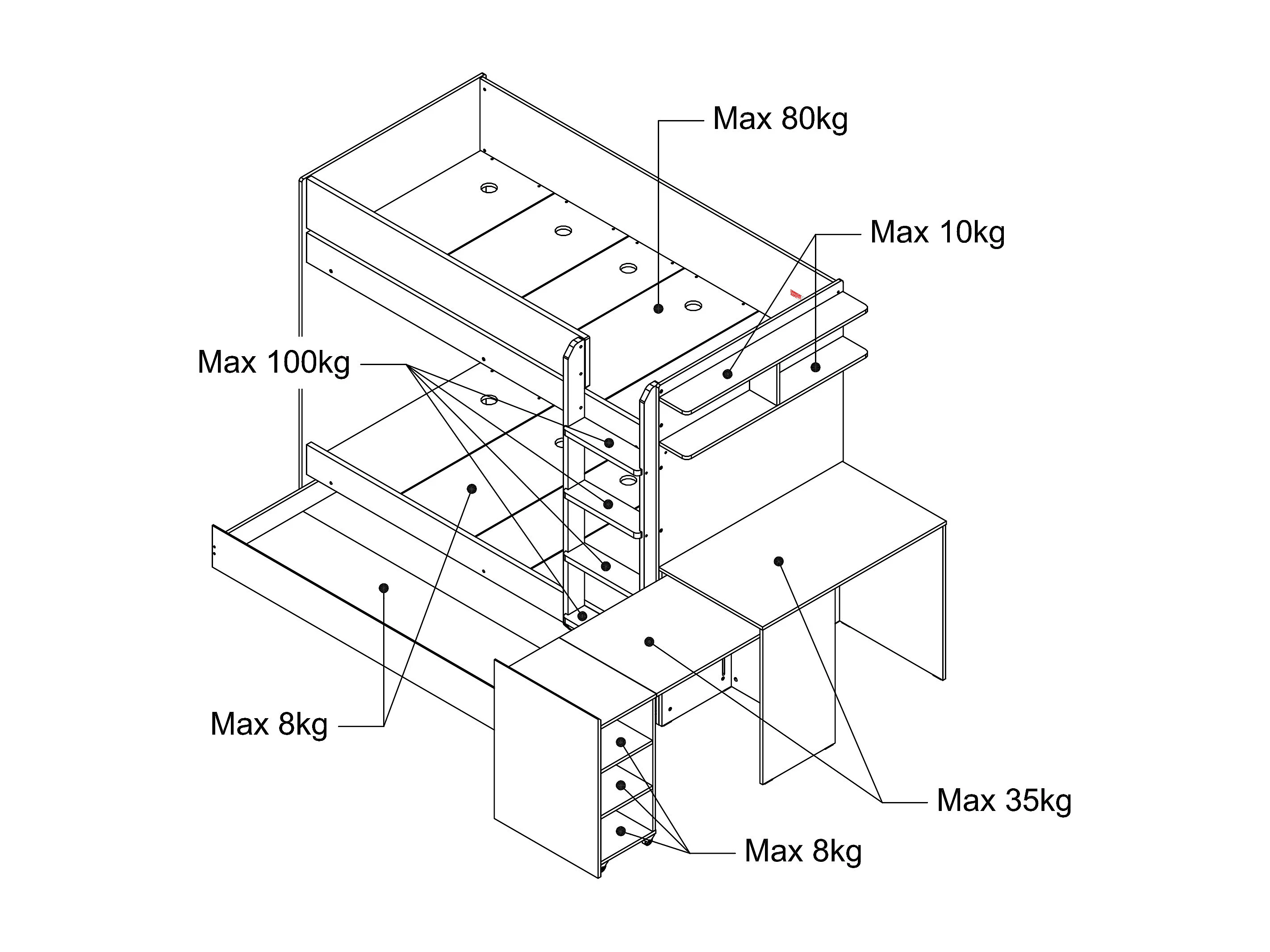Stapelbed met uitschuifbed en 2 bureaus 3 x 90 x 190 cm - Kleur: wit en houteffect - DOMATI